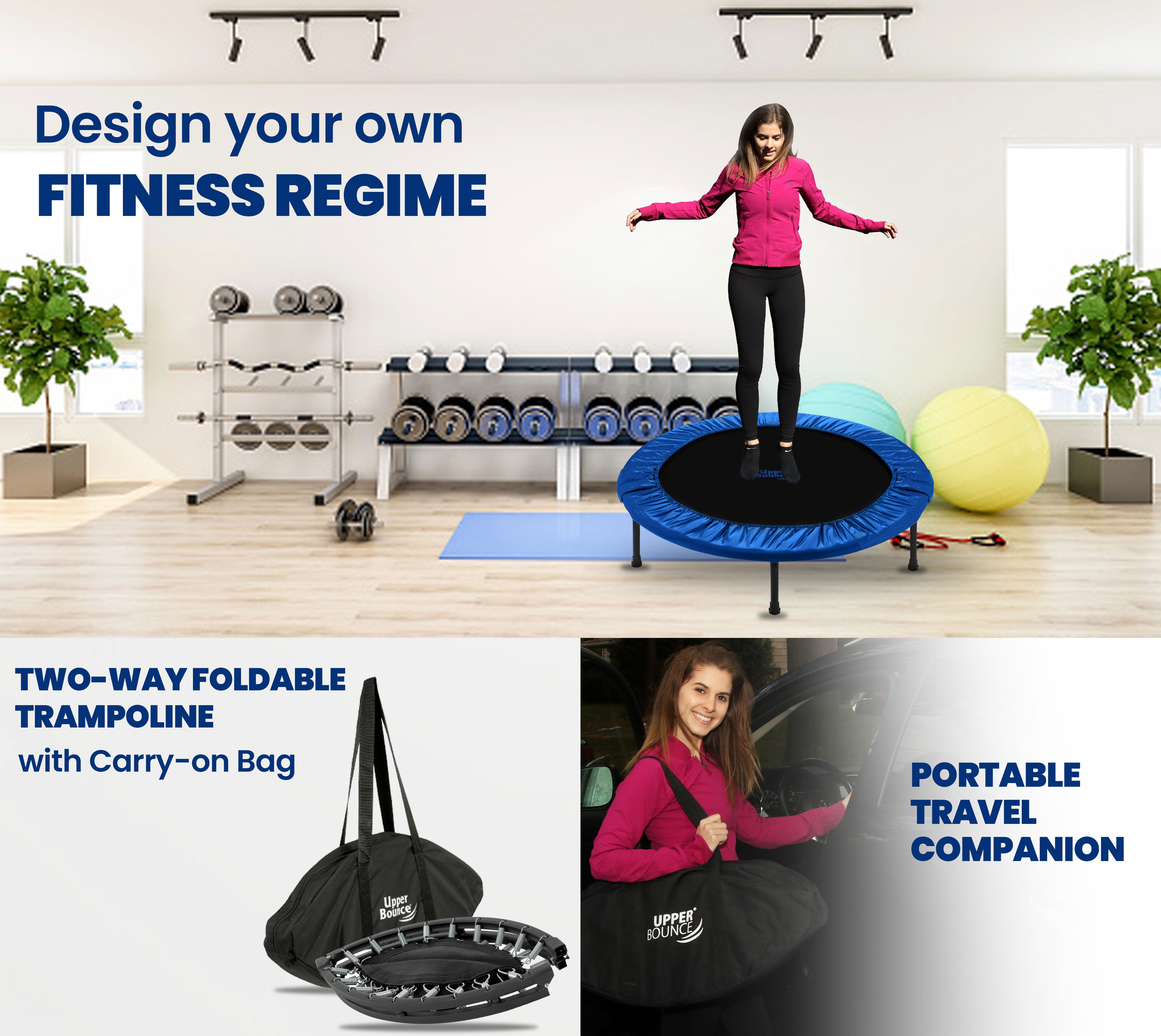 Calorie Burner and Muscle Strengthener: The mini trampoline encourages you to stay healthy and be in shape. 10 minutes of rebounding burns as many calories as 30 minutes of jogging and develops your core muscles. Rebounders help you to get your cardio exercise more conveniently than a high-knees type workout Foldable Trampoline with Easy Setup: This Indoor trampoline can fold in half, and doesn’t occupy too much space while keeping it under the bed, sofa, closet, or car trunk. It includes a user manual that helps assemble your exercise trampoline in less time. Also, the manual contains a workout program to build your exercise habit Feel Secure with the Heavy-Duty Design: Well-constructed steel frame with high tension springs make the small trampoline extra durable to achieve your weight-loss goals. Our safety pad with high-quality PP mesh is constructive for children, adults, and sports lovers in reducing their body’s stress during the workout. The rubber-tipped legs will not wear your flooring, and the anti-skid factor will keep you running in place Stay Fit with Personal Trampoline: Two-way fold rebounder trampoline is more convenient to carry in a bag and easy to carry in outdoor travel. It can be your personal trampoline when you need to get warmed up or engage yourself in short bursts of exercise. Surprise your loved ones by gifting them our fitness trampoline After-Sales Support: Providing top-notch customer service is our #1 priority. In case you need assistance, we will reply promptly, professionally, and courteously. Our exercise trampoline for adults comes with a 6 month warranty of jumping mats, frame & spring, and immediate replacement at zero cost, if anything is found defective