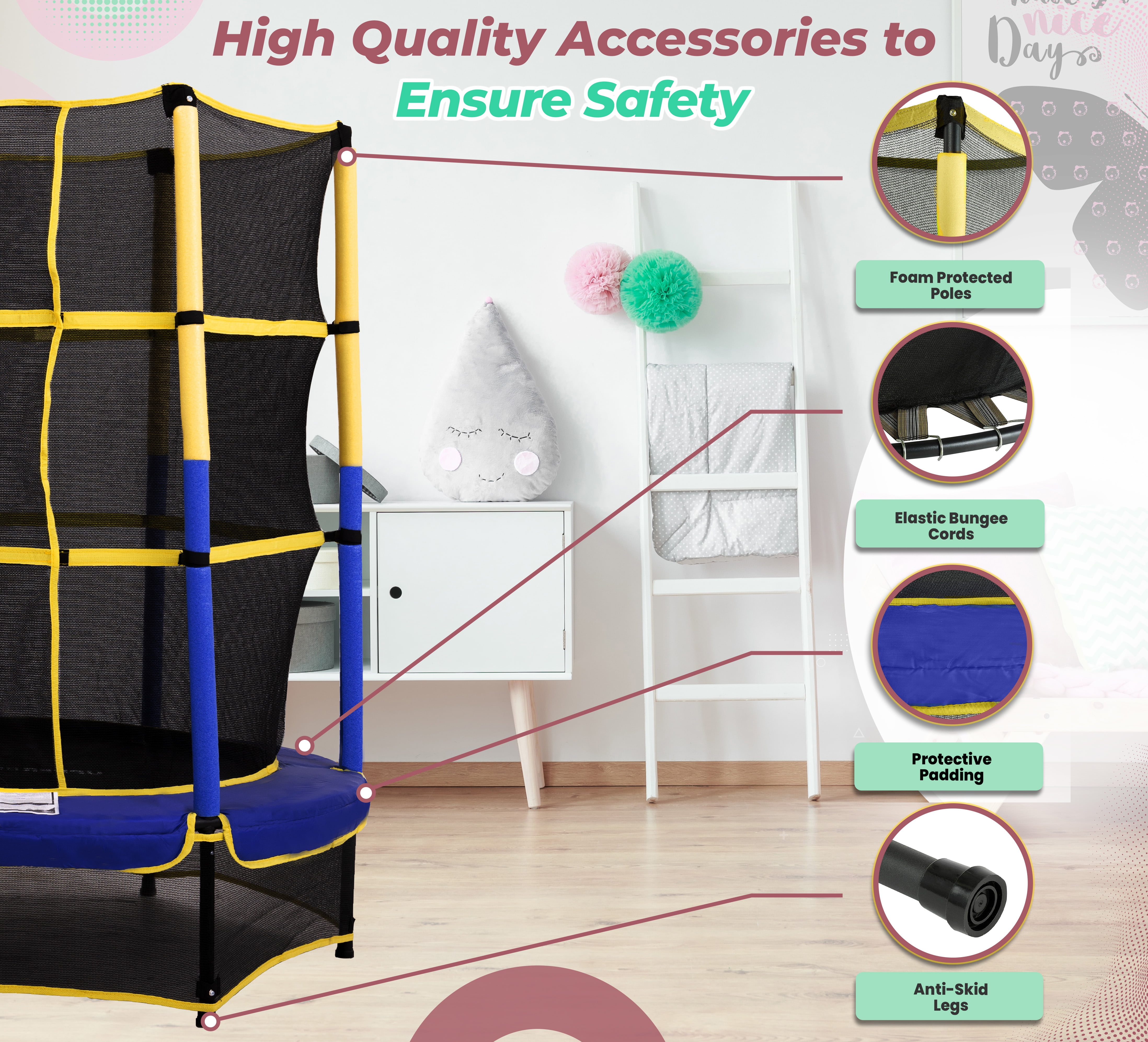 Enormous Indoor Bouncing Fun: Toddler trampoline comes with an elastic bungee cord system to enjoy the ultimate bouncing fun on our mini trampoline for kids. We have used elastic cords instead of metal springs to protect kids from stepping on springs that could hurt their feet. The elastic cords attached to the jumping pad withstand the pressure uniformly and allow soft bounce that stimulates children to keep themselves engaged in a recreational activity. Safe and Sturdy Trampoline: The support poles are covered with anti-collision foam, creating a safe play environment inside the child trampoline. The toddler trampoline with net features a gap-free enclosure design to ensure kids’ safety when jumping. Safety pads contain closed-cell foam that is highly durable and does not get out of shape. The child trampoline has 6 supportive and stable anti-skid legs that maintain the kid’s equilibrium while doing body movements Perfect Indoor Recreational and Healthy Activity: It is a perfect gift to surprise precious little kids. The toddlers would love to burn off their energy while parents can observe them through the see-through net. It is complete fun and healthy activity and encourages parent and child interactions. The indoor kid’s trampoline is perfect for core strengthening, balance control, and many more motor skills Easy to Assemble: The trampoline’s frame is built in accordance with ASTM Standard to ensure safety and hours of bouncing fun. The assembly of inside trampoline is easy when you will follow the step-by-step user-friendly manual. The screw assembly helps to connect the frame in less time. The quick assembly would double the pleasure of bouncing for your child. Let’s start jumping like never before After-Sales Support: Please reach out to our well-mannered customer support if any issues arise. Our kids’ trampoline with enclosure comes with a 6 month warranty of jumping mats and frame, and 30 days warranty of enclosure net and pole caps, and immediate replacement at zero cost, if anything is found defective