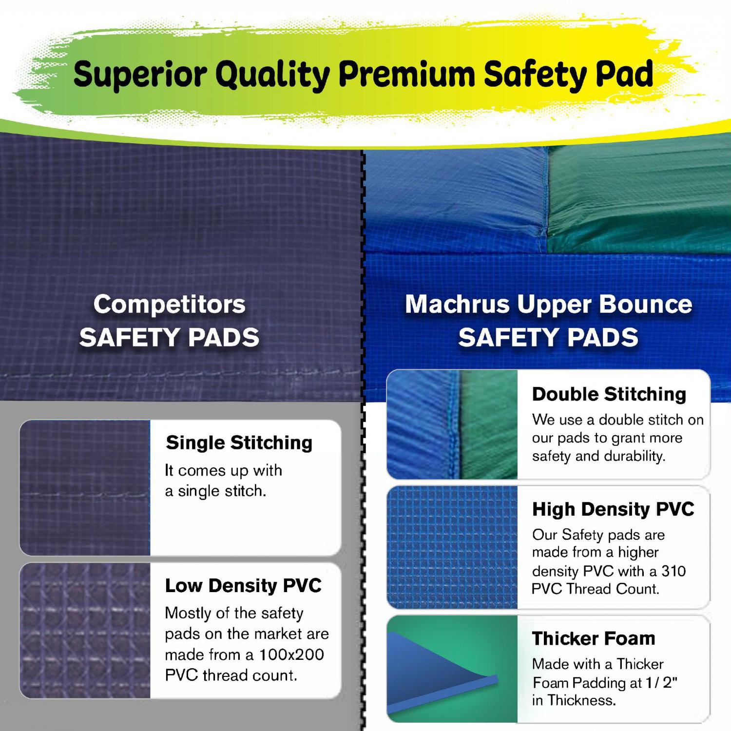 Bring bouncing fun to your backyard with the Machrus Upper Bounce trampoline spring cover. Our superior quality premium PP mesh trampoline safety pad is tested to be UV and water-resistant. Offering you a safe and long-lasting fun investment. Machrus’s Upper Bounce Trampoline Safety Pad is a must to have to ensure your family’s safety. Our Trampoline Spring Cover ensures that you and your family do not get pinches and scrapes. Machrus Upper Bounce Trampoline Safety Pad protects the jumper from falling on the steel frame or getting hurt from the springs. You will enjoy many years of safe fun on your new trampoline with no worries at all. Our trampoline safety pad is super safe to use and is perfectly compatible with trampolines of any other brand of the same size. Safety Pad s 1/2″ foam thickness EPE ensures absolute safety for your children. You can now combine loads of fun with loads of health benefits. Machrus’s Upper Bounce trampoline spring cover provides tremendous safety during jumping for a controlled and responsive jumping experience. Let’s go out and play!
