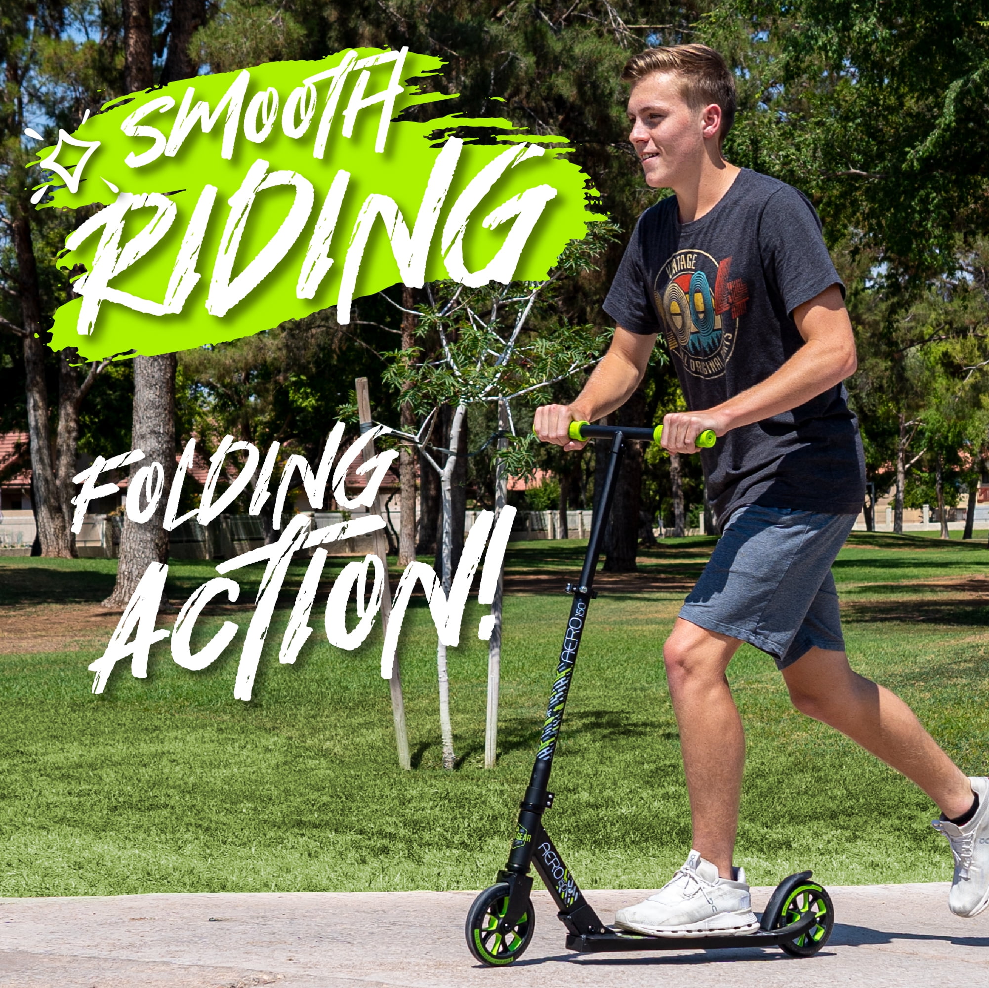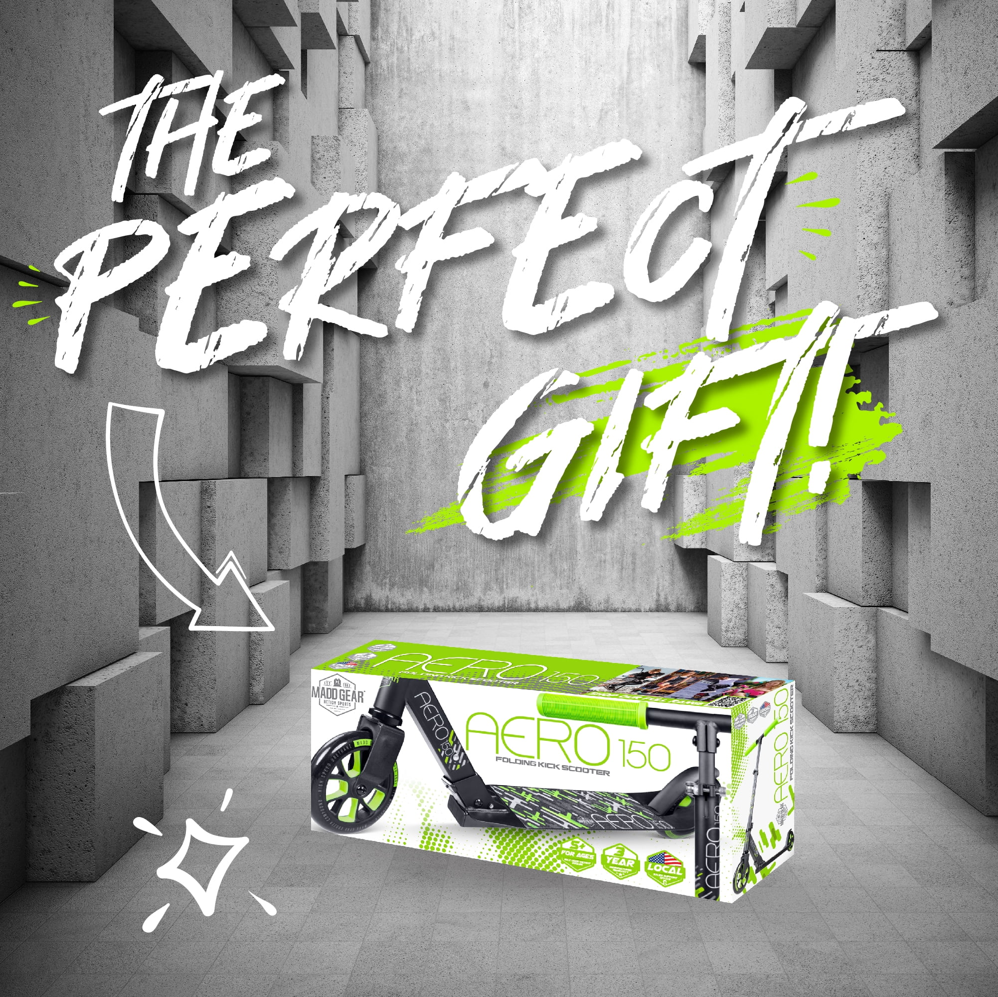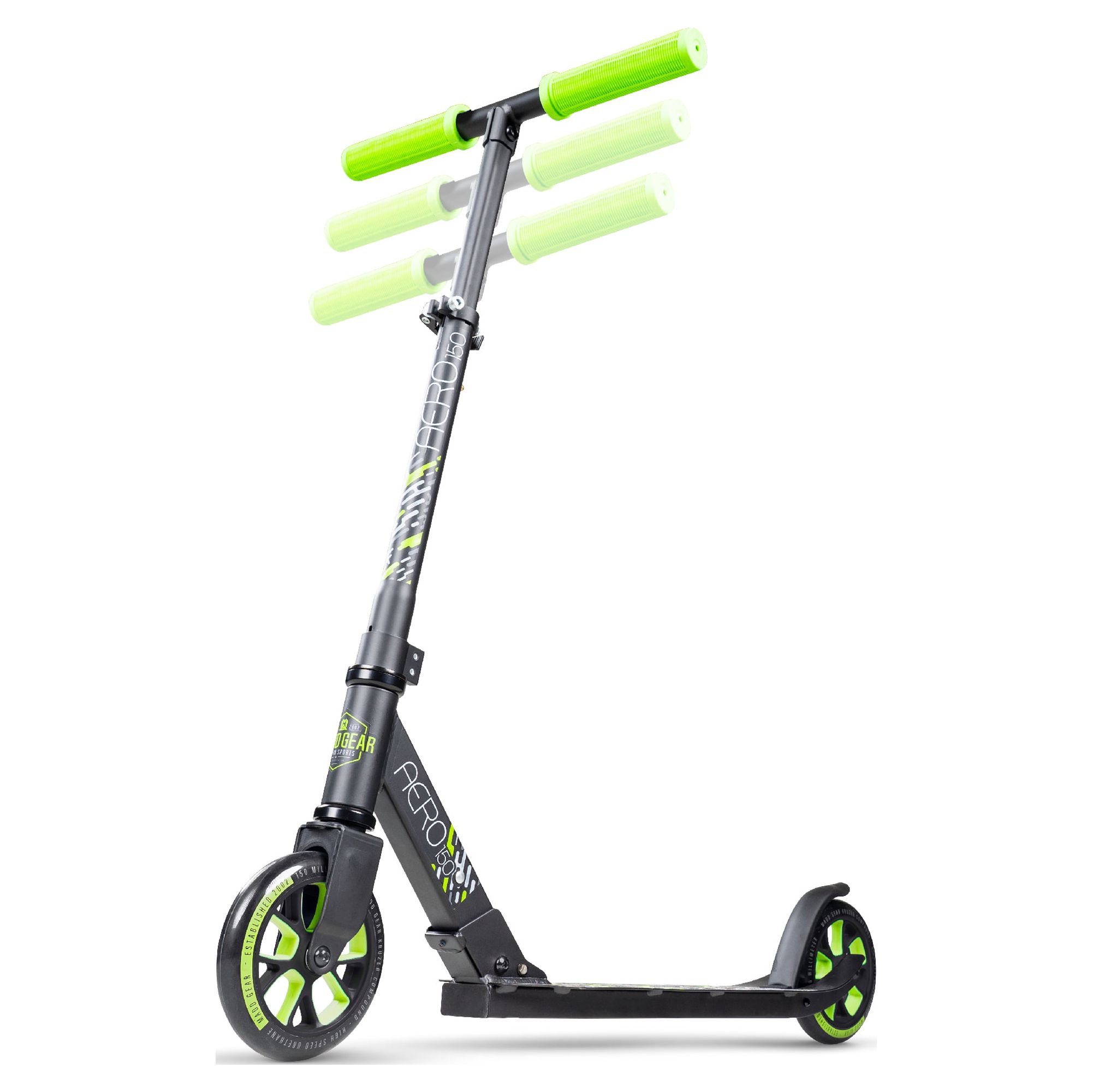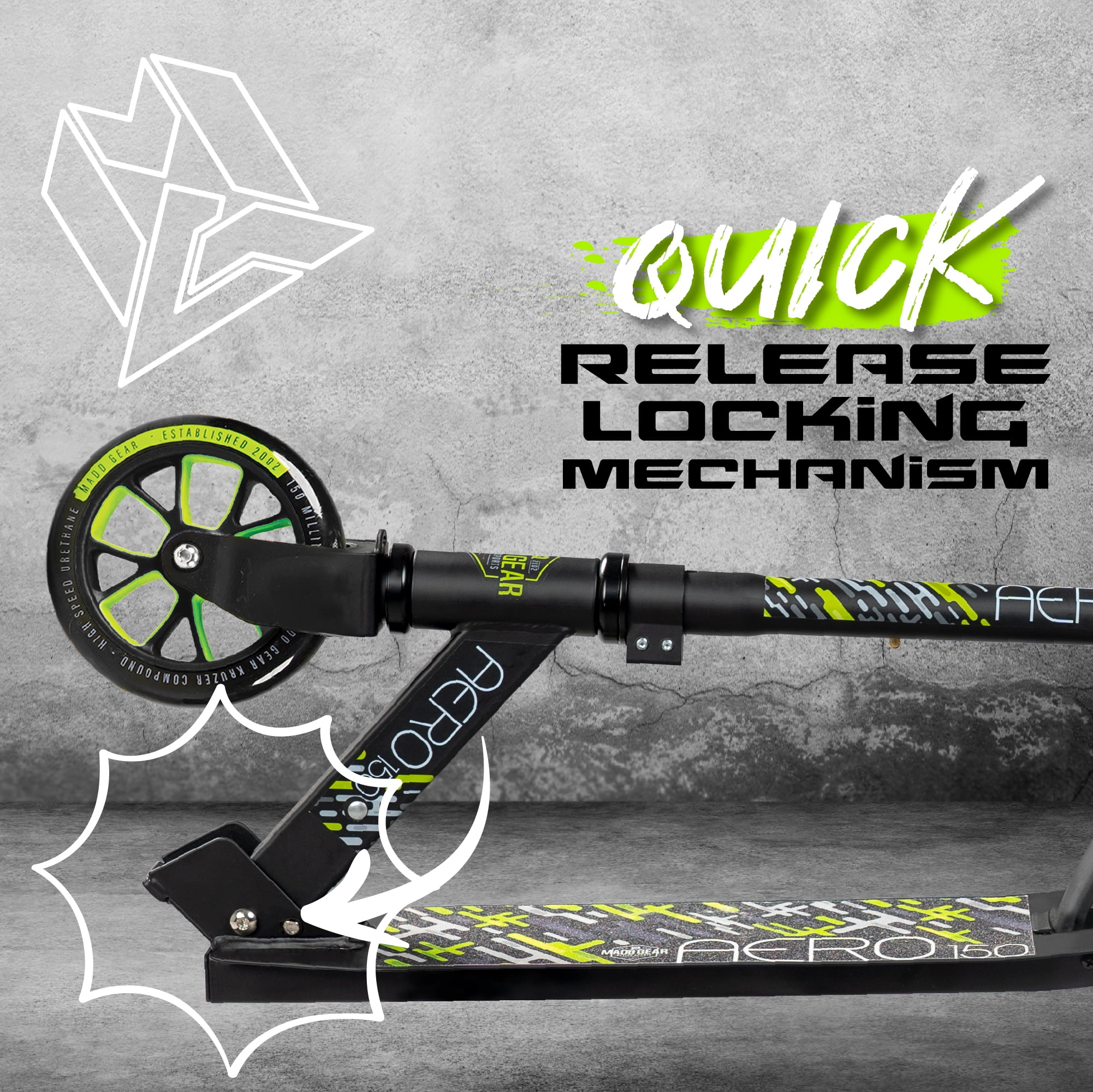 The Madd Gear Aero 150 Kick Folding Scooter is an amazing cruiser or school commuter! Fitting in between the Madd Gear Flow 100 and the Kruzer 200, the Aero 150 scooter hits that sweet spot between small kids scooters and larger commuter scooters. The Madd Gear Aero 150 Kids Scooter is ideal for kids and teens 4’2″ right up to around 5’11” with a maximum user weight of 220lbs or 100 kg. Featuring our quick-release easy-fold locking mechanism, the Aero 150 scooter can easily be carried or stored under the bed, trunk of the car or desk at school. Recommended for riders 5 years and Up