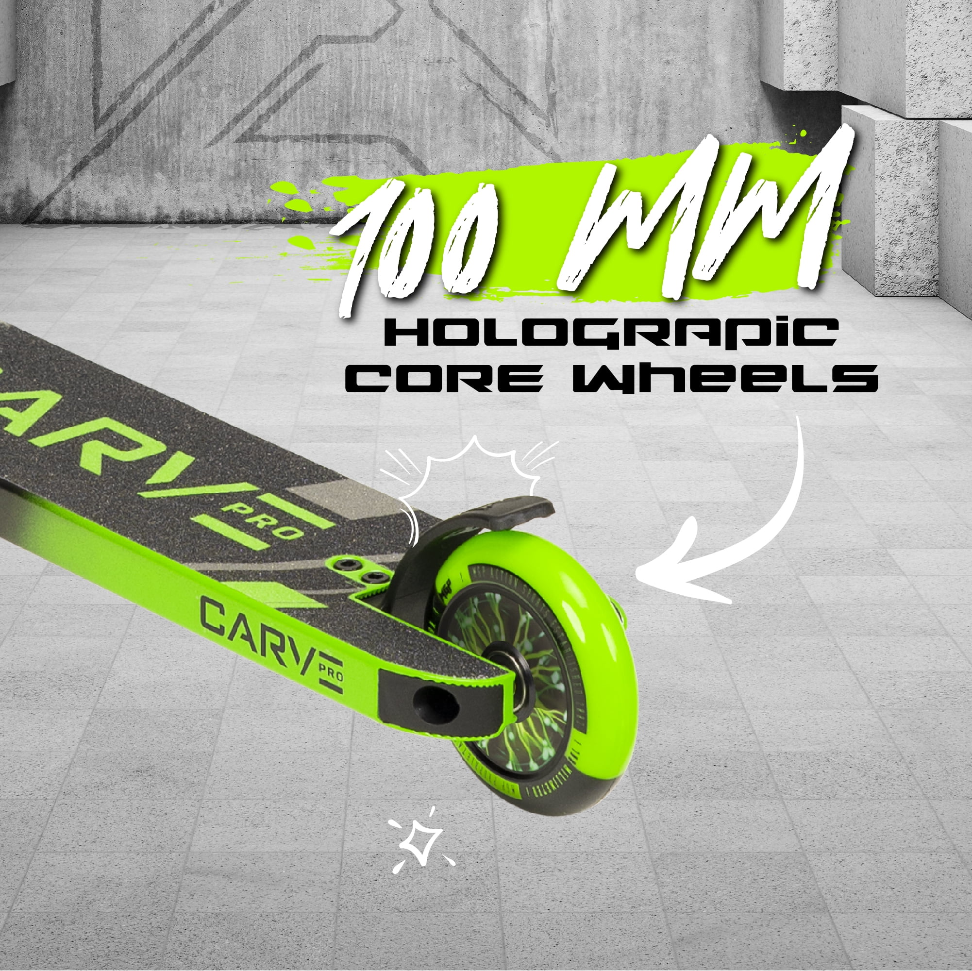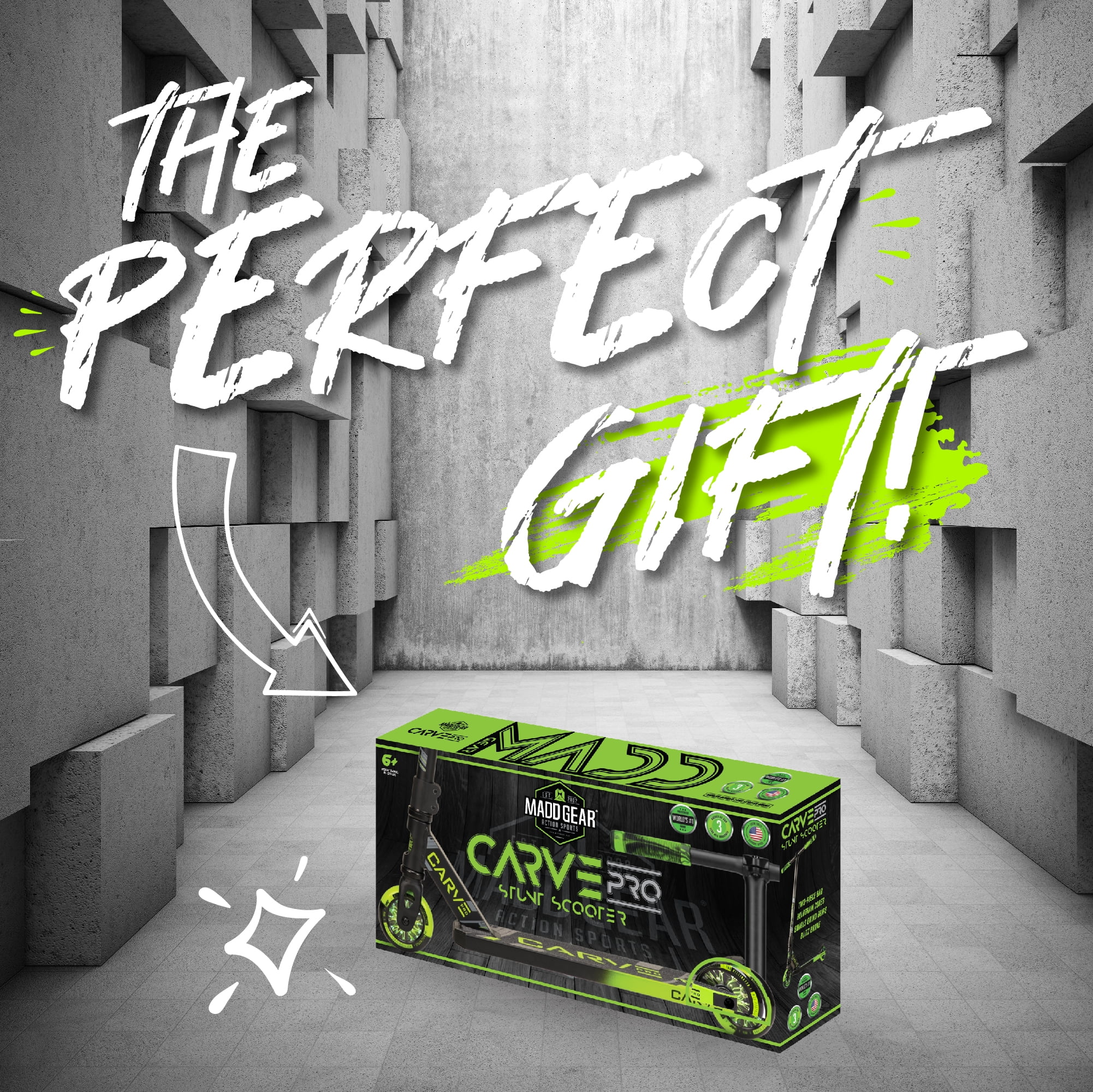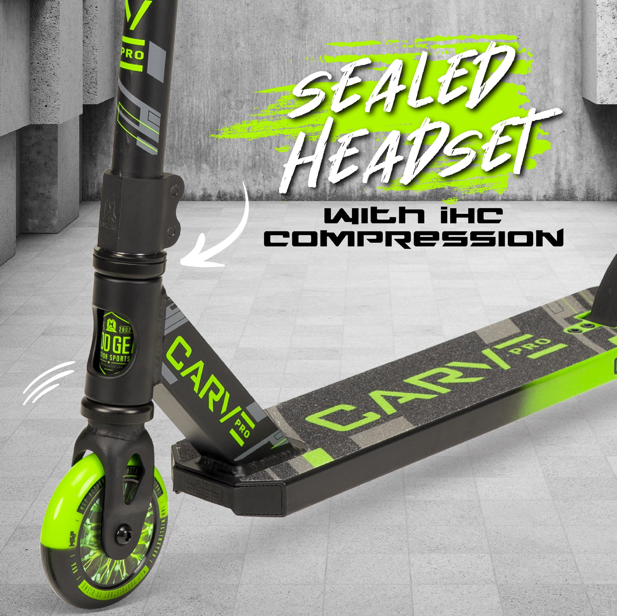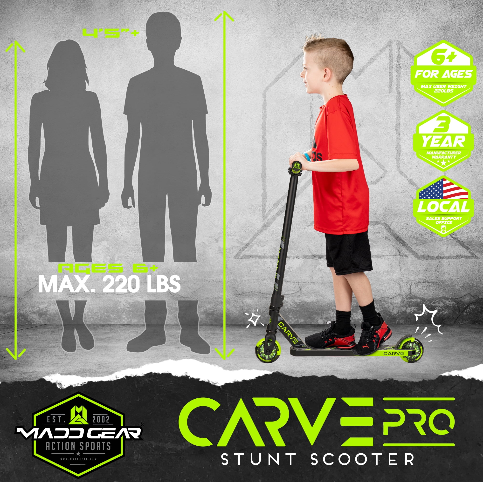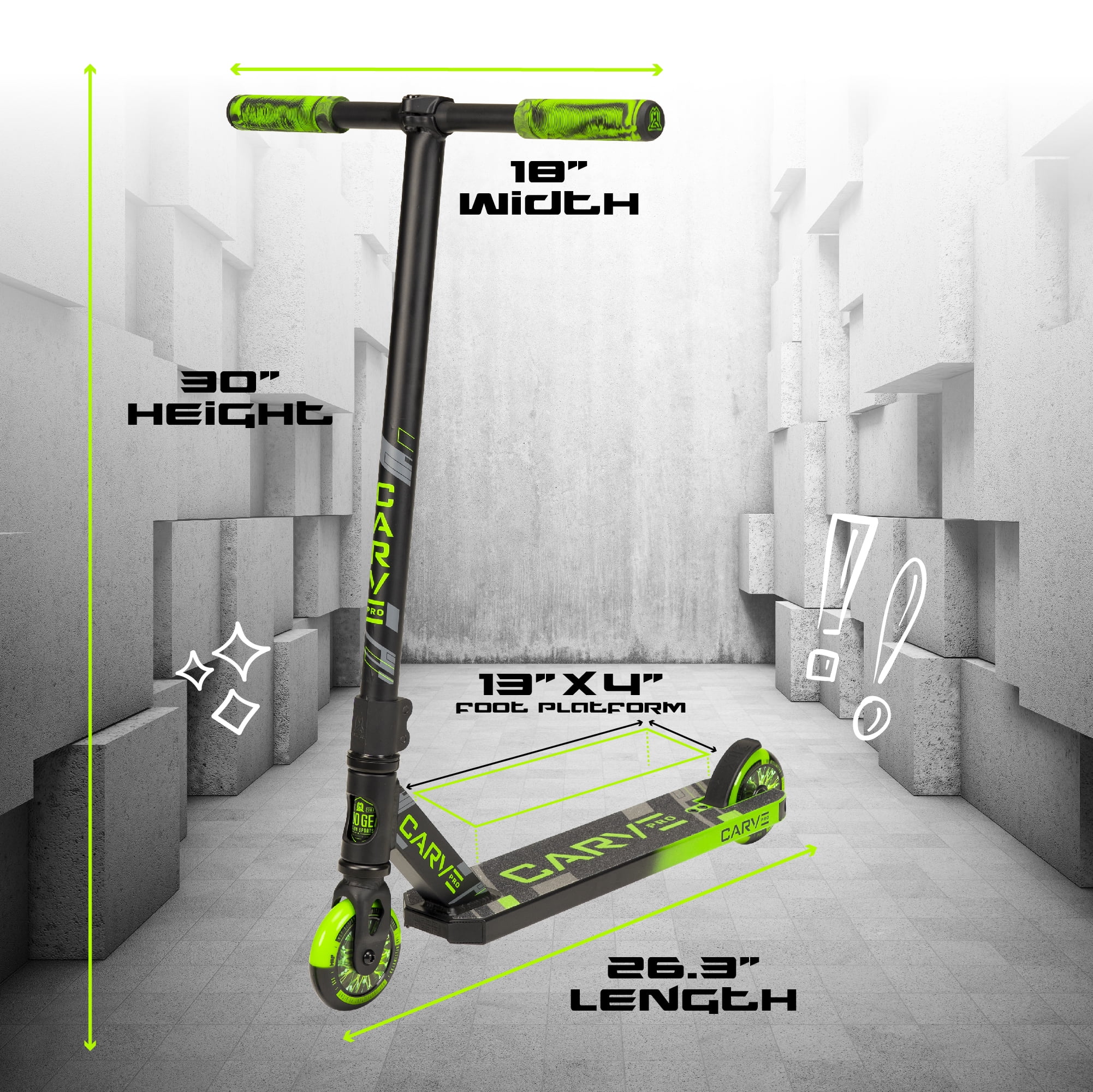 19″ Long 6061 Aluminum Extruded Deck with Machine-Welded One-Piece Headtube MGP Pro Clamp T-Bar Handlebar Soft TPR Swirl Grind Grips with Safe Nylon Bar-Ends Holographic Hollow-Core Wheels with High-Speed Two-Tone Polyurethane High-Speed Carbon Steel ABEC-5 Bearings Friction-Free Sealed Headset Bearings MGP Extreme Aluminum Double Clamp Pro-Spec IHC Compression System High-Density Deck Blocks Silent & Dialed MGP V2 Blitz Composite Brake Max User Weight: 100kg / 220lbs Recommended Child Age: 6 Years and Up Complete Weight: 3.3kg / 7.2 lbs. MADD GEAR – MGP Action Sports – The Pro Scooter brand backed by industry leading durability and quality. This scooter will see you through years of growth and development – MGP Scooters are built to last! BEGINNER TO PRO – The Madd Gear Carve Pro Trick Scooter is designed specifically for beginner riders who want to learn tricks at the skatepark. BUILT TO LAST – The Madd Gear 6061 Extruded Aluminum Deck is Machine Welded and designed to last! QUALITY BUILD – All the bells and whistles you expect on a quality complete with Pro-Style T-Bar Handlebar, Soft Swirls TPR Grips and Fast Rolling Two-Tone PU Wheels. SMOOTH RIDE – The Carve Pro Stunt Scooter is the ultimate smooth and dialed ride with Holographic Core Wheels and a super silent Composite Brake for no rattle. MADD GEAR PROMISE – All Madd Gear products are shipped in discreate outer packaging to avoid spoiled surprises. WARRANTY BACKED – Madd Gear products are backed by an Industry Leading 3-year manufacturer’s warranty and our local USA based after sales support.