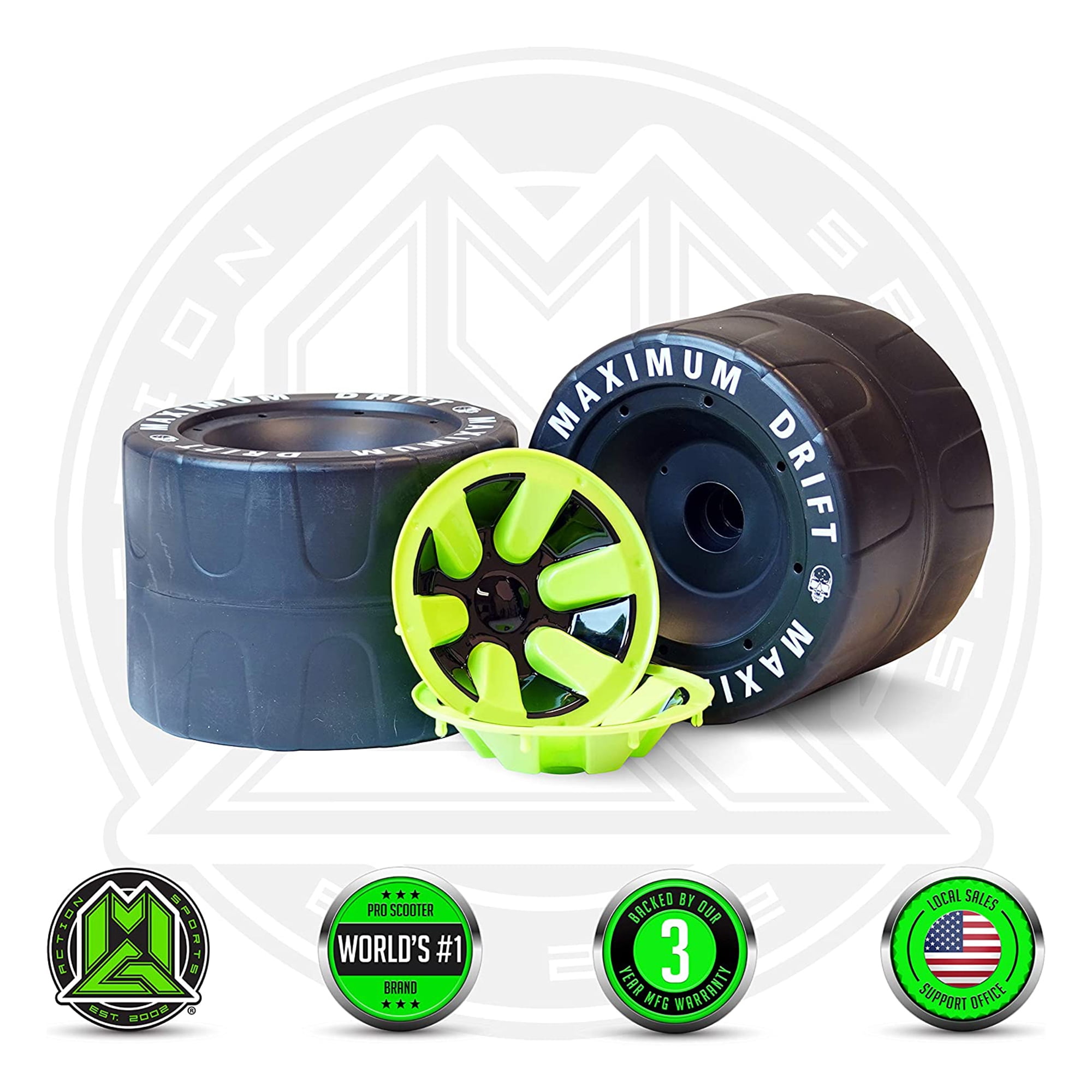 Madd Gear Drift Trike Replacement Wheels SetMGP Action Sports – DRIFT TRIKE REPLACEMENT REAR WHEELS – Black – World’s #1 Pro Scooter Brand – Built to Last! Madd Gear Est. 2002Huffy Green Machine? We now supply wheel spacers for use with the Huffy Green Machine! These Wheels Measure: 6″ Wide by 8 1/4″ in Diameter – Supplied spacers allow for these wheels to be used on the Green Machine.Click Image for More Information: We all know that the Madd Gear Drift Trike provides hours of awesome drifting action and fun! Eventually you are going to need to swap out those fat tread rear wheels for a fresh set!We have you covered with easy to install replacement rear wheels set. Set comes with 2 Blow Molded Wheels.Easy to install, just pop off your existing hub caps to access the axle nut. Remove the nut and slide the wheel assembly off the axle. Ensure you remove the internal wheel bushing and washer. Install the bushing in the new wheel, slide onto the axle, place the washer on the axle, tighten the nut and pop your hub cap back on!You are ready for hours more drifting action!Skip to 1:20 (Step 2) for wheel assembly instructions.