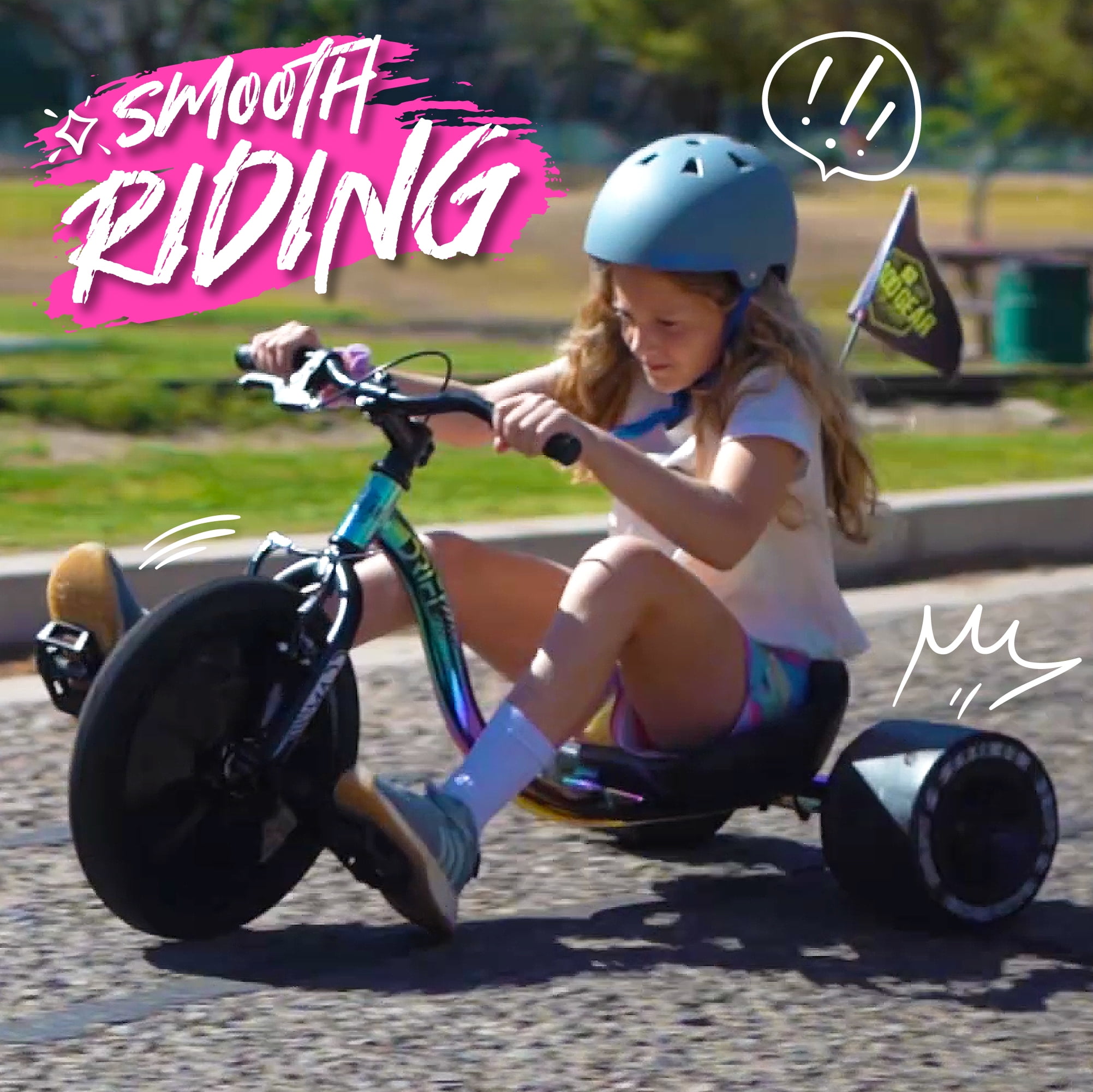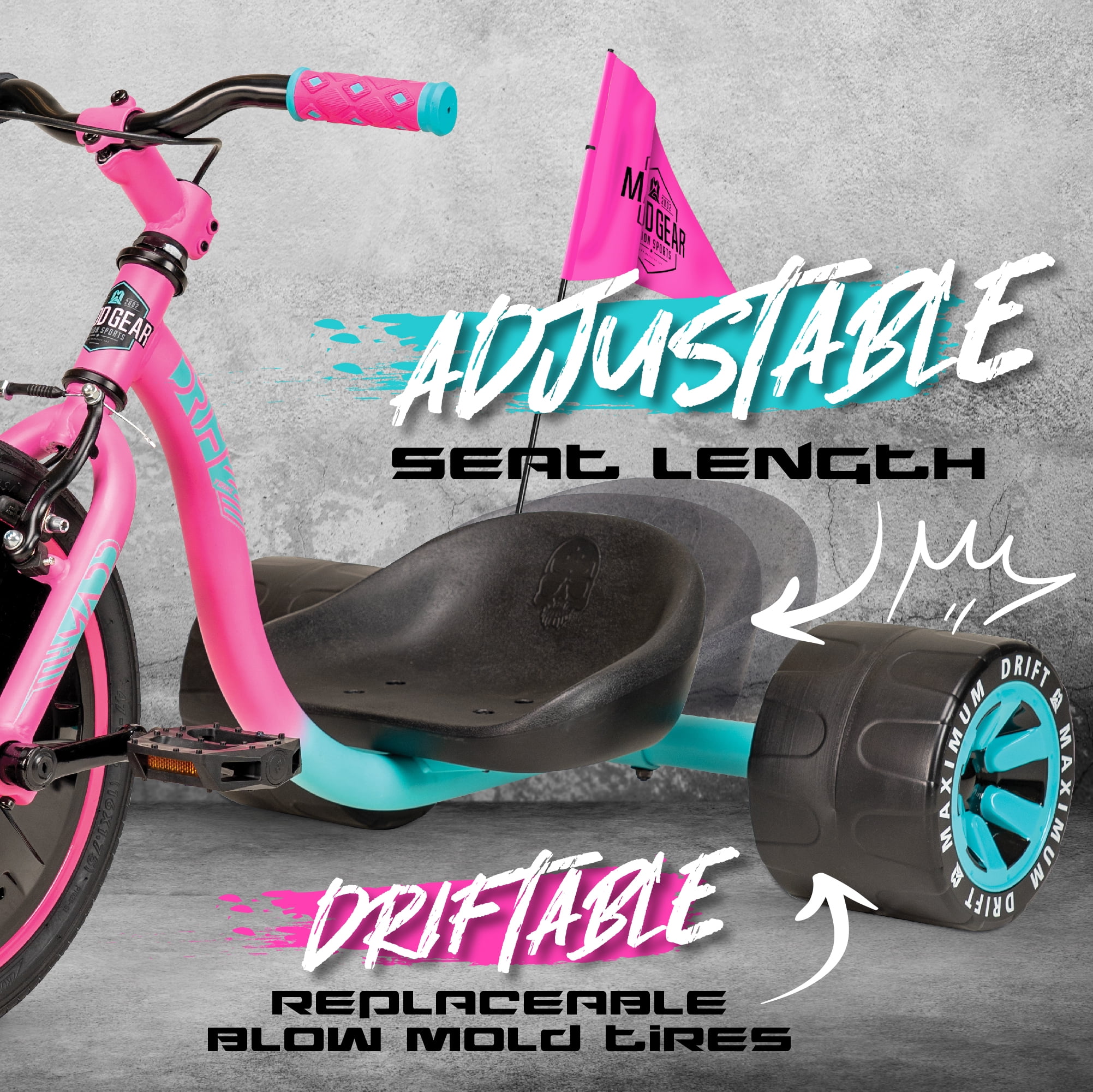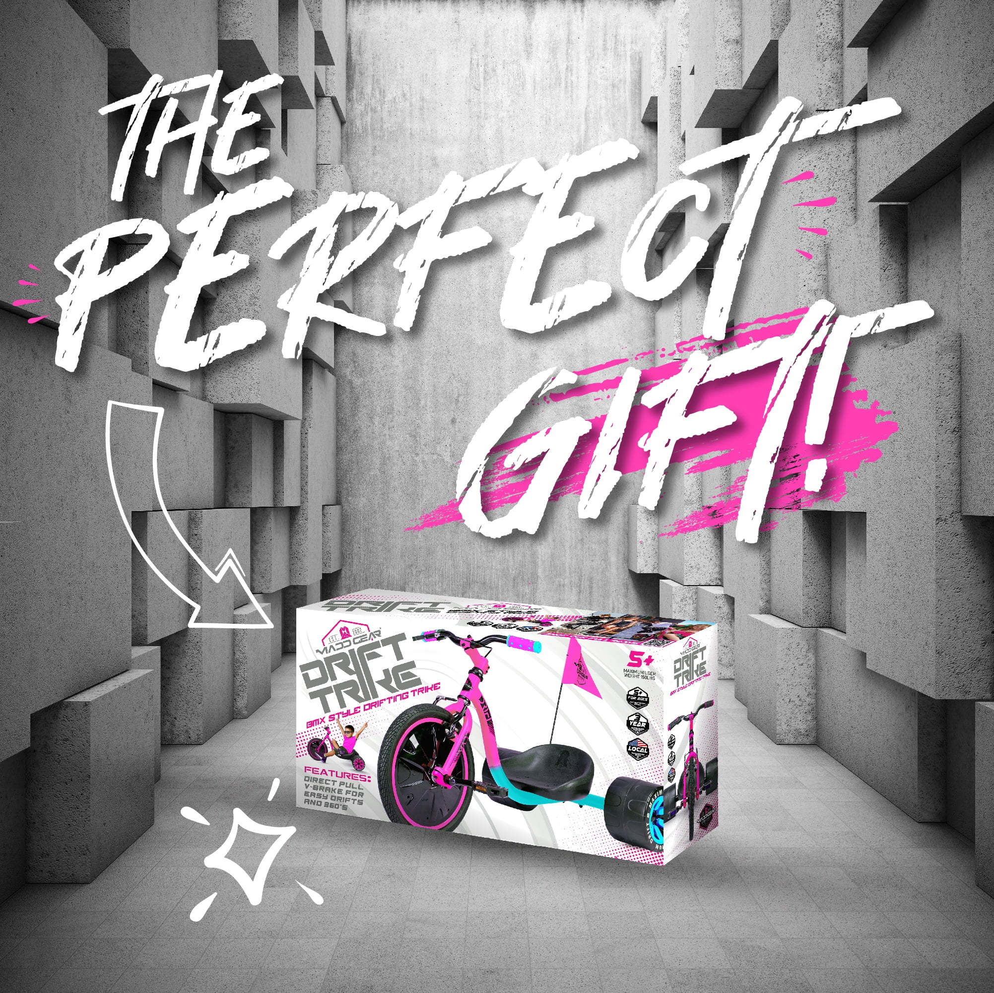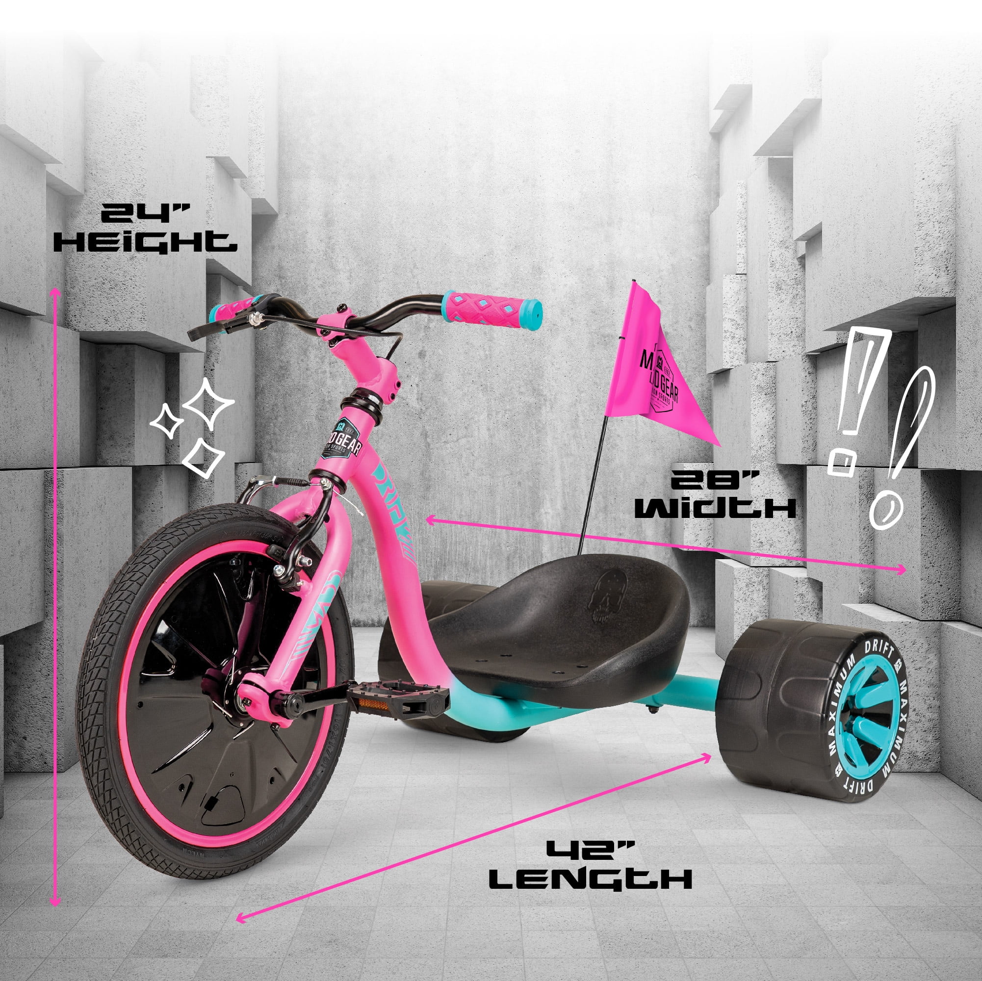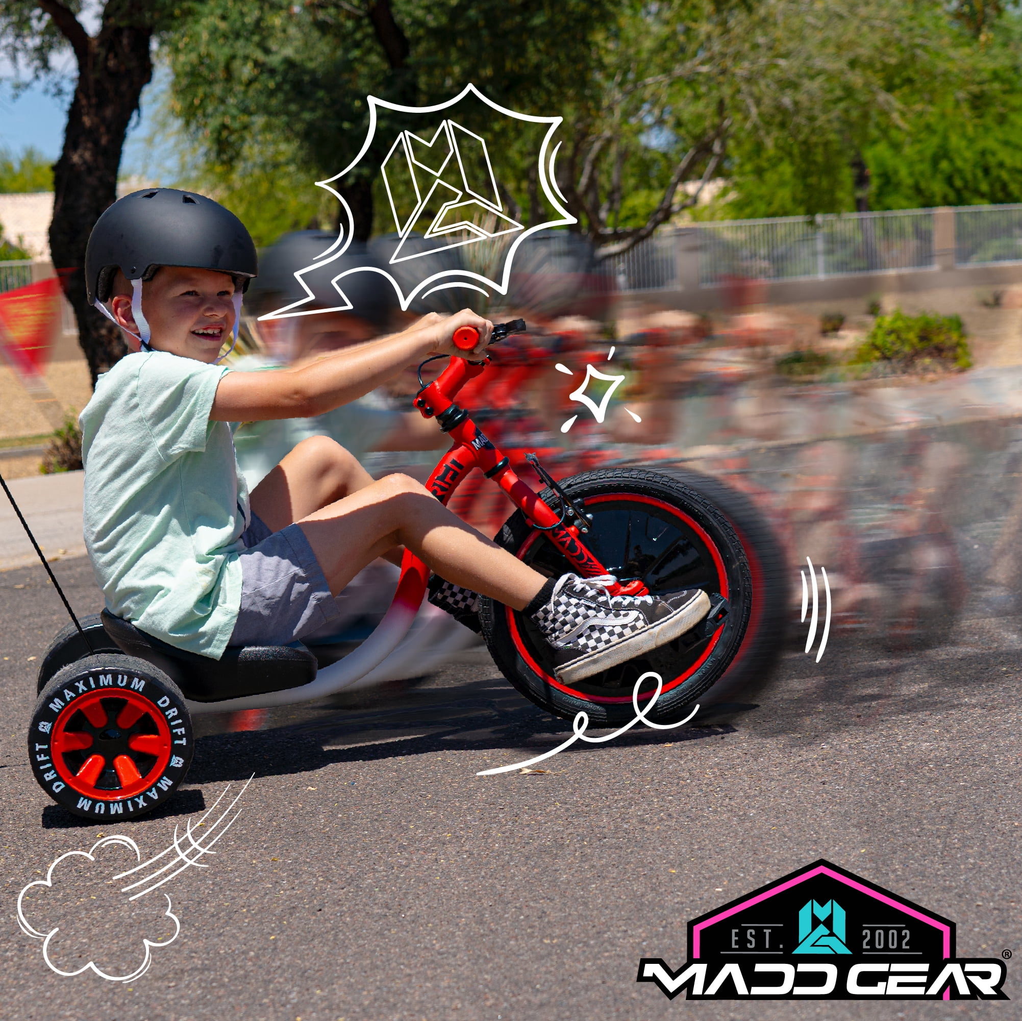 - SAFE OUTDOOR FUN – The Madd Gear Drift Trike is built low to the ground like a drift car with a wide wheelbase and is fitted with an integrated front wheel spoke cover and flag for safe play!