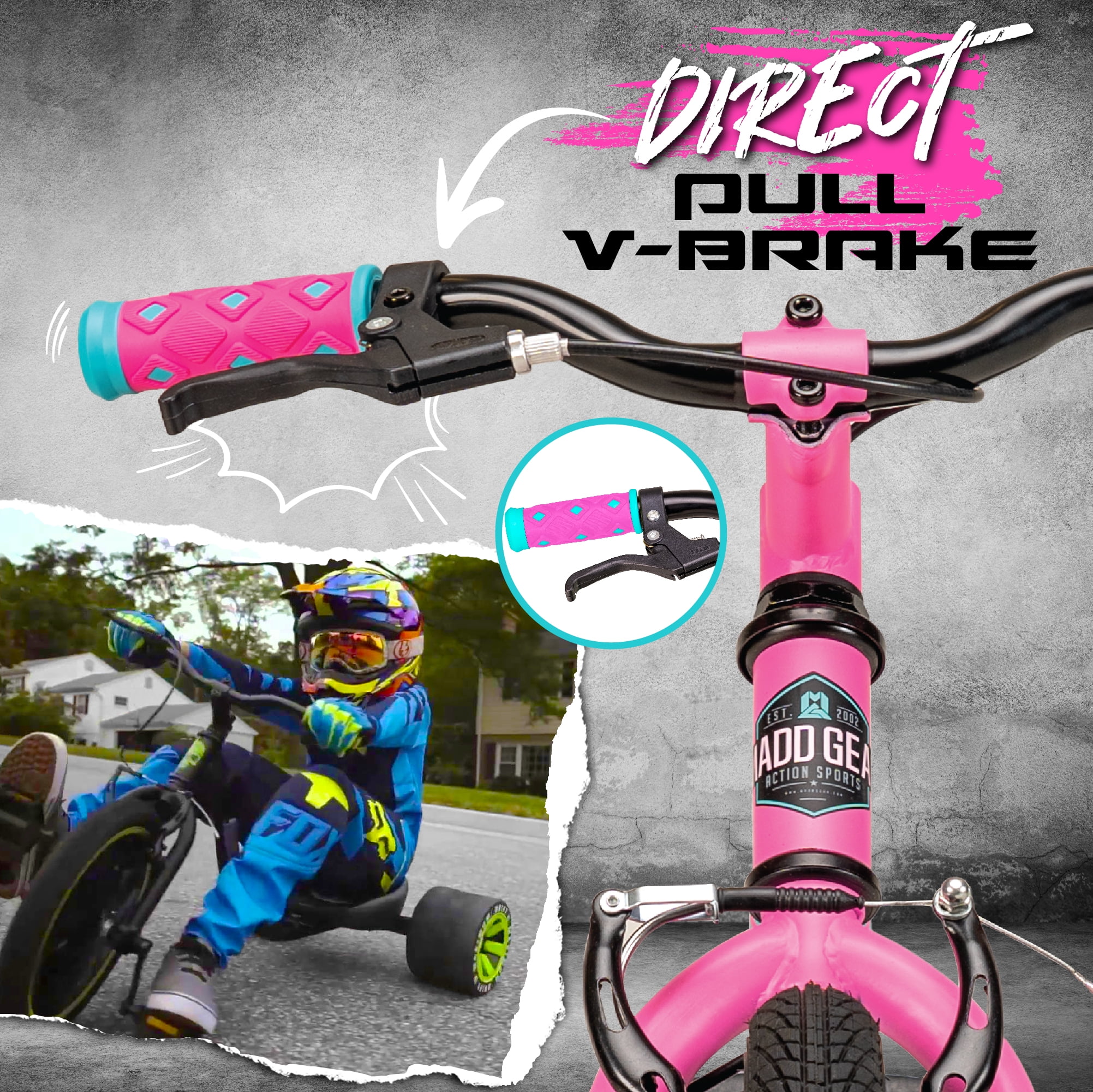 - BUILT TO LAST – The Unisex 16-inch Madd Gear Drift Trike is constructed from strong high-tensile steel and features replaceable hard-compound rear drifting wheels for sliding and spinning action!