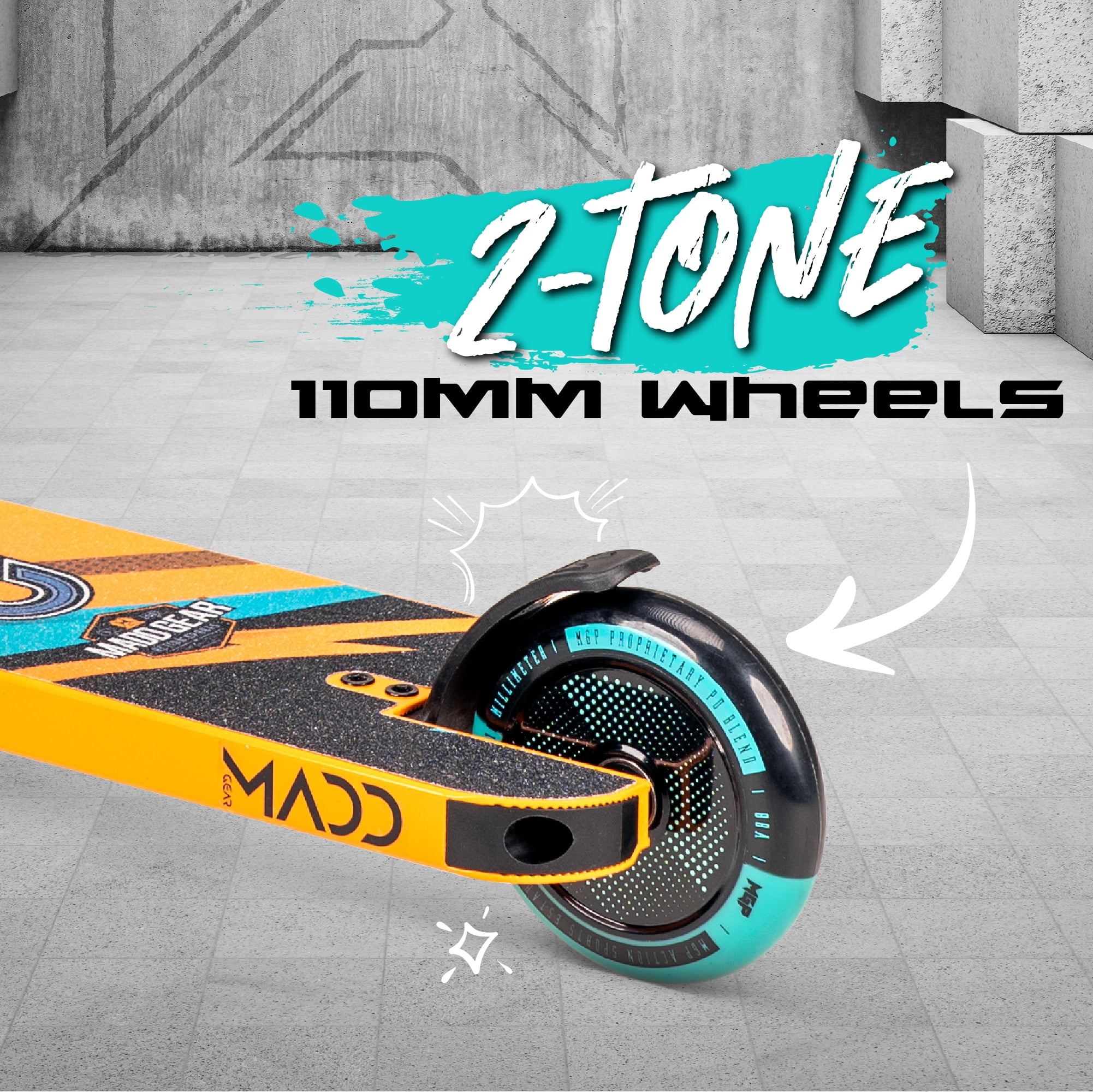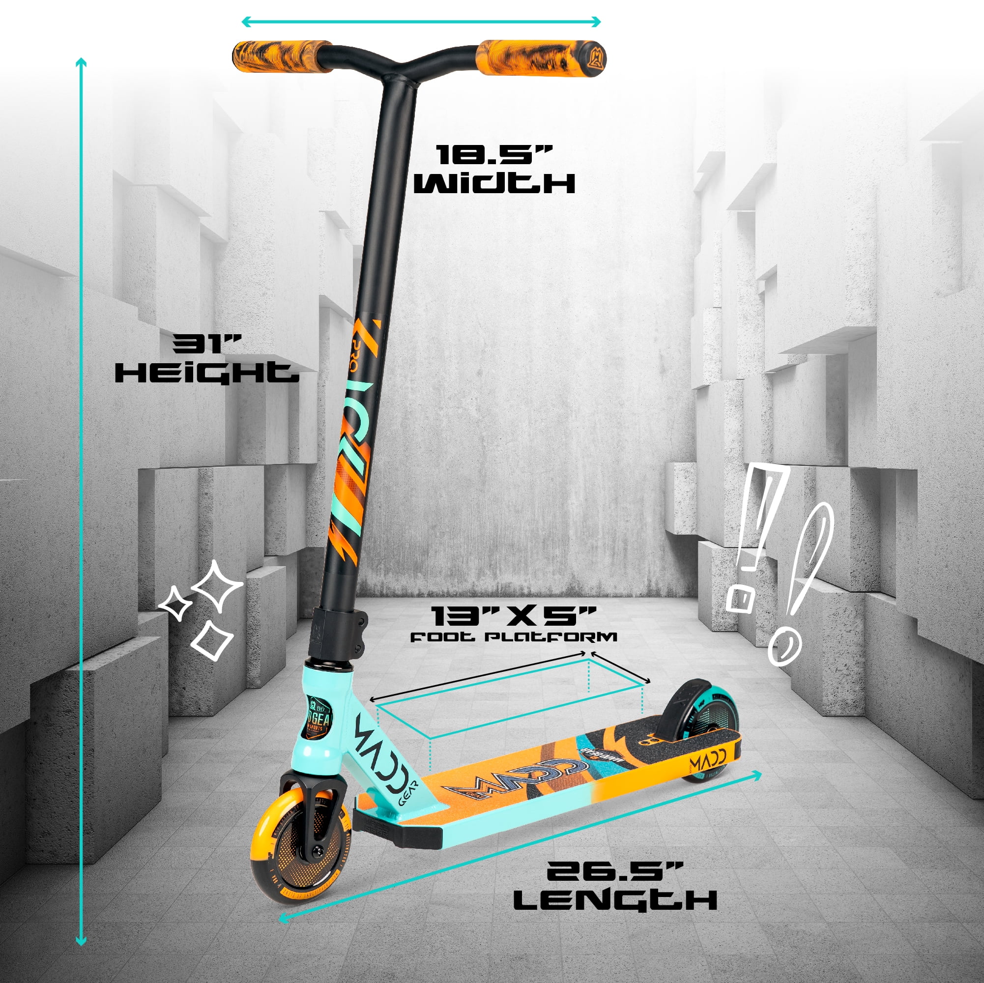 Product Specifications: 19″ L x 5″ W 6061 T-6 Aluminum Extruded Deck MGP Low-Riser 18″ Wide x 22″ Tall 4031 Japanese Chromoly Standard Diameter Handlebar with Internal Fluting Headset: MFX Low-Friction Integrated with Sealed Bearings. Wheel: 110mm Holographic Hollow Core with 2-Tone MGP Proprietary Polyurethane Blend & K-2 ABEC-7 Bearings Max User Weight: 100kg / 220lbs Recommended User Age: 6 Years and Up Complete Weight: 3.12kg / 6.9 lbs. MADD GEAR – MGP Action Sports – Pro Scooter Brand backed by industry leading durability and quality. This scooter will see you through years of growth & development – MGP Scooters built to last KICK PRO – The Madd Gear Kick Pro stunt scooter is the ultimate dialed complete for the next up and coming pro rider! Designed for shredders 6 years and up that are looking for a light and durable complete backed by Madd Gear’s reputation for quality BUILT TO LAST – The 6061 T6 aircraft grade heat treated aluminum deck is designed to withstand the demands of today’s kids riding skateparks to street spots DIALED OUT OF THE BOX – This Madd Gear trick scooter comes dialed and ready to ride! Featuring an 18” wide and 22” tall 4031 Japanese chromoly handlebar with Patented internal fluting, MFX low friction integrated headset with sealed bearings for smooth bar spins and whips ULTRA SMOOTH RIDE – We paired our 110mm holographic hollow cores with two-tone MGP proprietary polyurethane blend and Abec-7 carbon steel bearings to give riders a smooth and fast ride. Hitting those big airs have never been this easy THE MADD GEAR PROMISE – All of our products are packaged securely and with care and come shipped in an outer box gift packaging ensuring no spoiled surprise gifts. Super easy assembly and supplied tool will have you rolling out the door quick and the envy of the skatepark in just minutes WARRANTY BACKED – All Madd Gear products are backed by a three-year manufacturer warranty when registered with your local USA support office. Our after sales support is just an email or phone call away. Madd Gear prides itself on customer satisfaction and making sure our customers are happy with their purchase