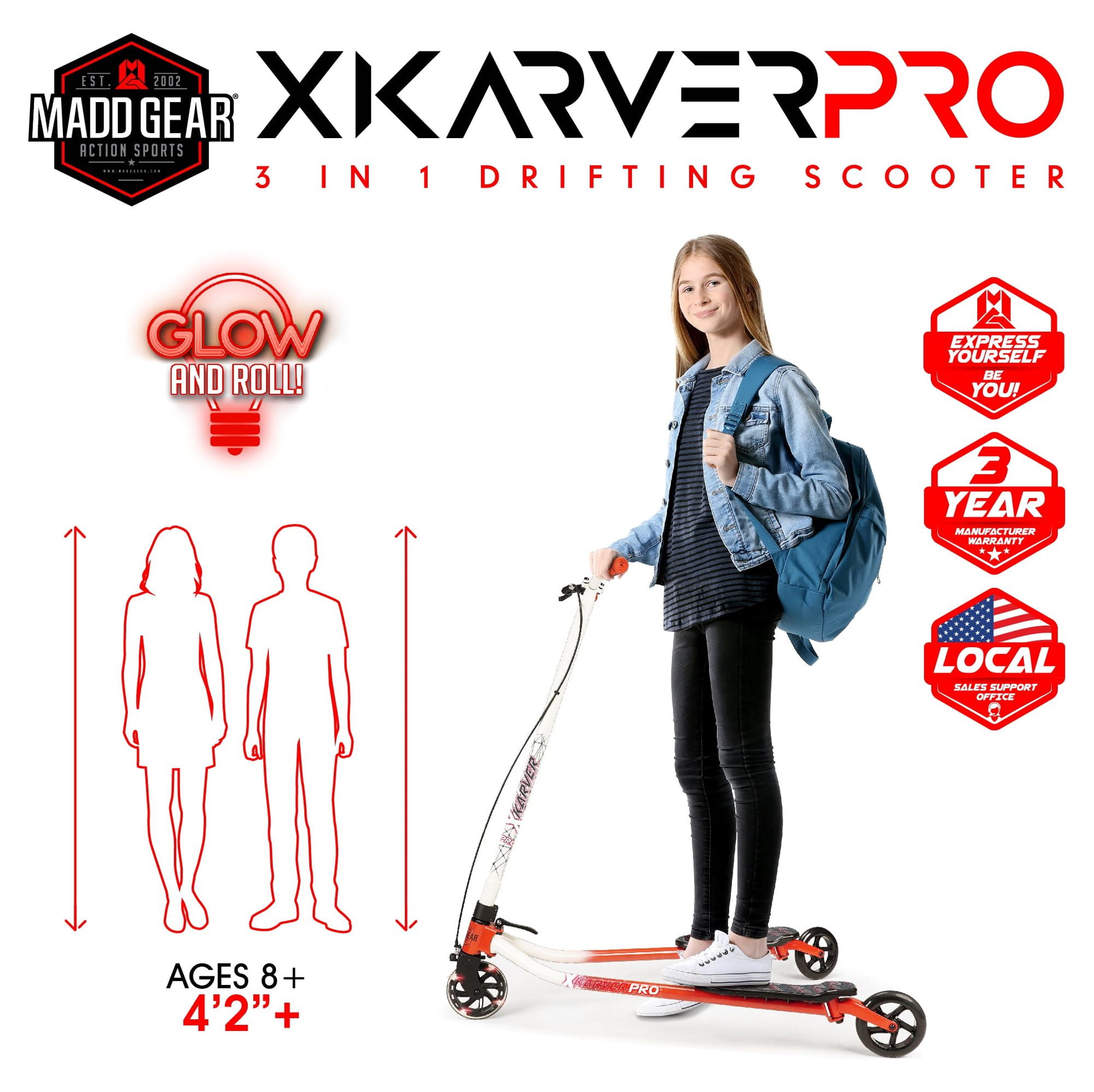 MADD GEAR – MGP Action Sports – Pro Scooter Brand backed by industry leading durability and quality. This scooter will see you through years of growth & development – MGP Scooters built to last EASY TO ASSEMBLE – The Madd Gear X-Karver Pro 3 in 1 Scooter with Light-up Front Wheel is designed to transform into three different scooters with unique riding modes! The Easy-lock quick release allows riders to swiftly switch riding modes! The X-Karver Pro will be ready to ride in minutes! Self propel and wiggle around town on your new three wheeled adult scooter EASY BRAKING – With a quality steel frame, the X-Karver is light and durable, without sacrificing safety. The quick stop hand brake is easy to use and always at your fingertips. The safe non-slip grip foot platforms help for a more secure control of your ride. Feel safe and secure after building up speed 3️ WAYS TO RIDE – Our X-Karver transitions easily between the three different riding modes giving users the freedom to choose how they want to ride QUICK AND EASY STORAGE – The X-Karver is designed to fold up and save space. Perfect for saving space and ensuring no damage to the product occurs while not in use THE MADD GEAR PROMISE – All of our products are packaged securely and with care and come shipped in an outer box gift packaging ensuring no spoiled surprise gifts. Super easy assembly and supplied tool will have you rolling out the door quick and the envy of the skatepark in just minutes WARRANTY BACKED – All Madd Gear products are backed by a three-year manufacturer warranty when registered with your local USA support office. Our after sales support is just an email or phone call away. Madd Gear prides itself on customer satisfaction and making sure our customers are happy with their purchase