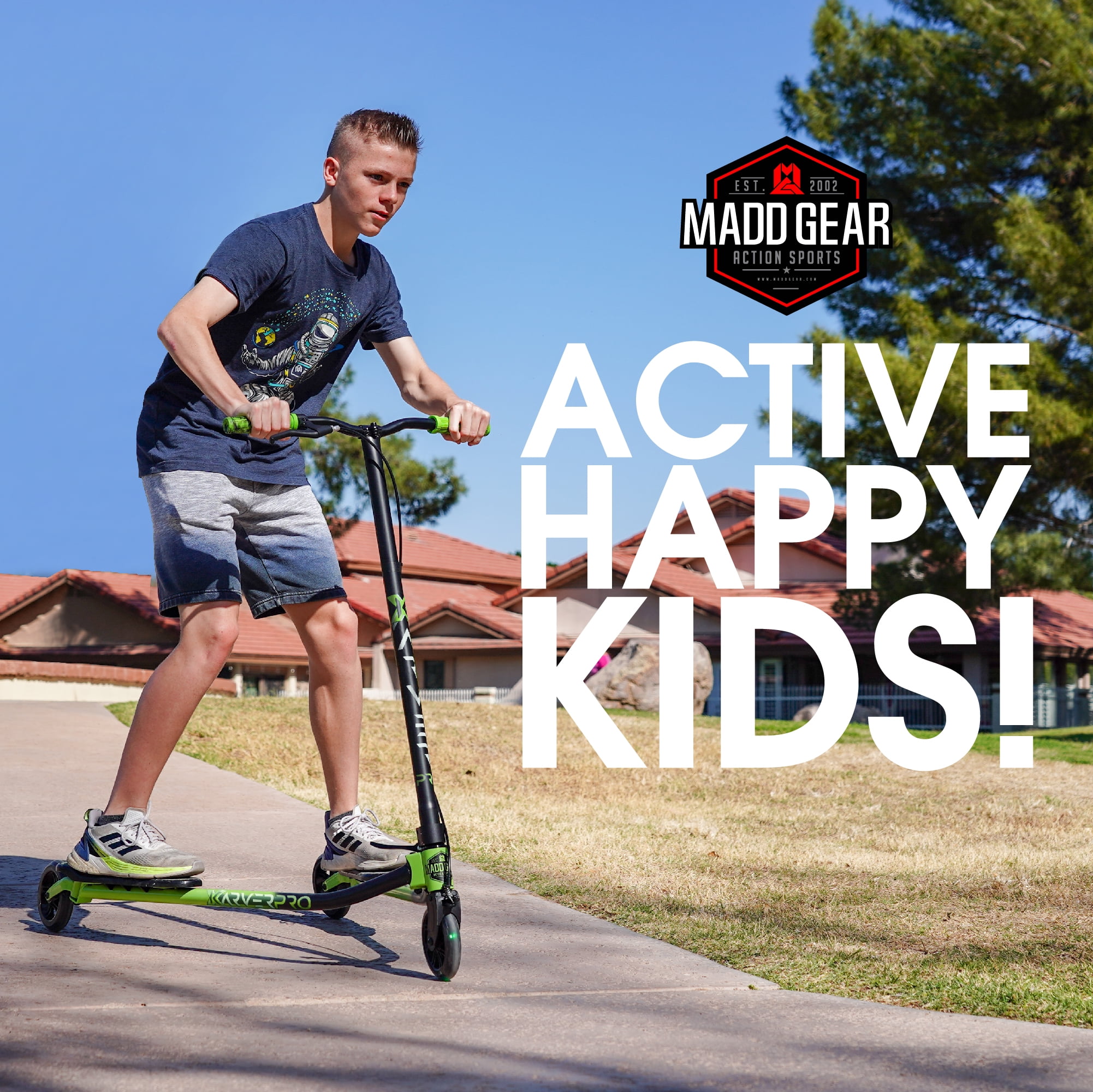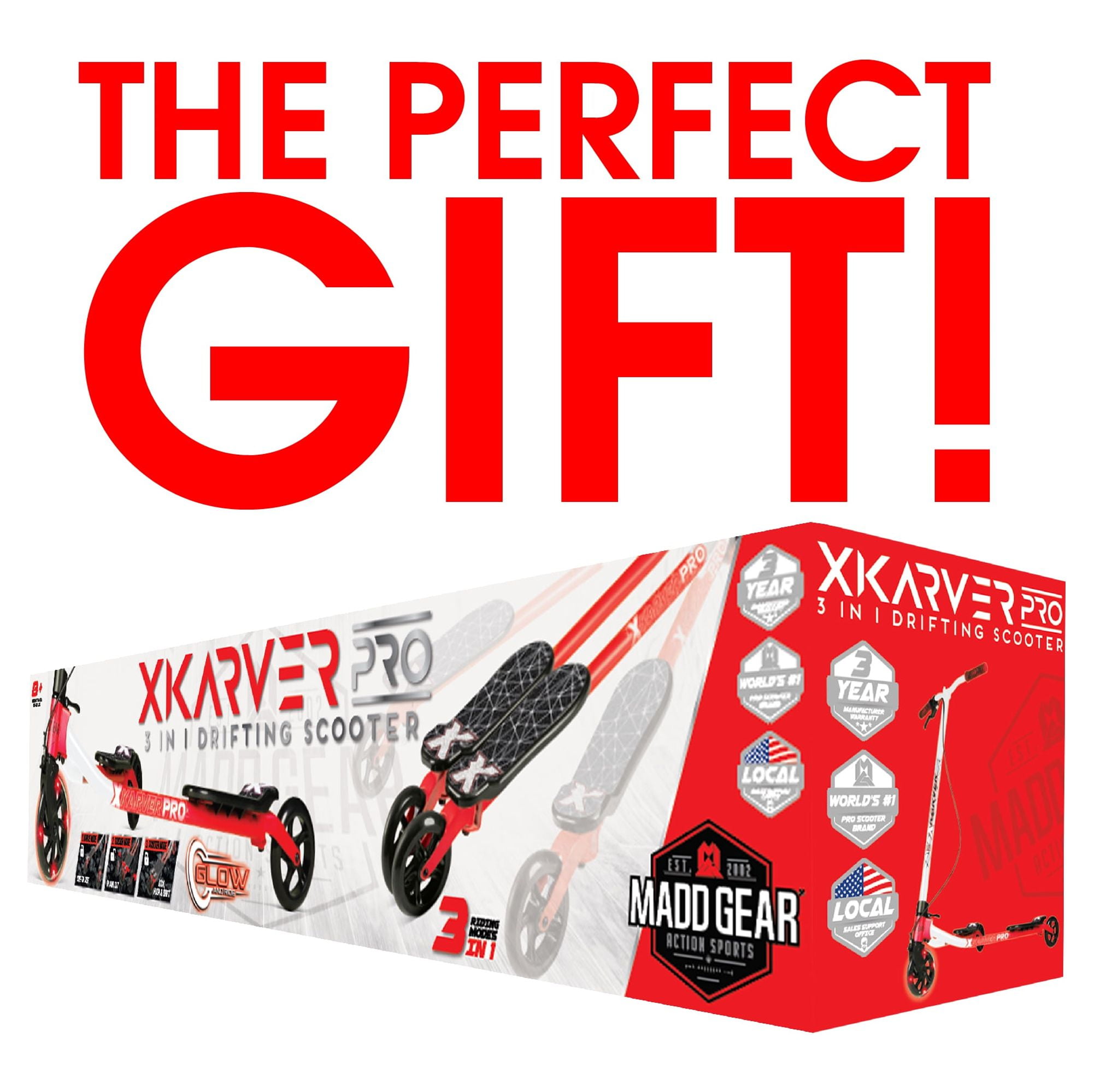 The Madd Gear X-Karver is designed for riders to ride it three different ways, for hours of free-wheeling and drifting fun! Put the multi -use scooter in carve mode and swing your hips back and forth to make the perfect wiggle scooter. Lean and swing using the handlebars to make sharp turns, and navigate! The X-Karver in scissor mode is perfect for speed, making this kick scooter self propelling! Set it up in scooter mode and you have an adjustable beginner kids scooter! Super easy to assemble, the X-Karver Pro will be ready to ride within minutes. Ride however you want, swing your weight from side to side for the ride of your life