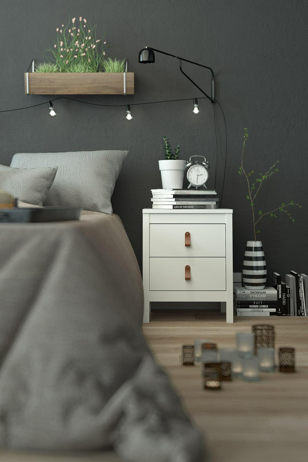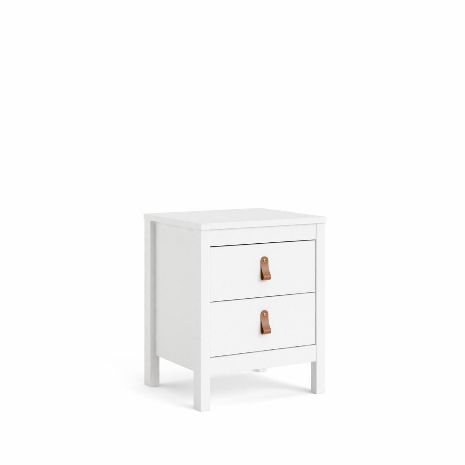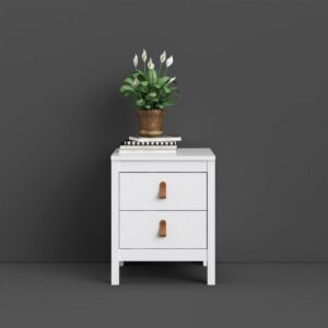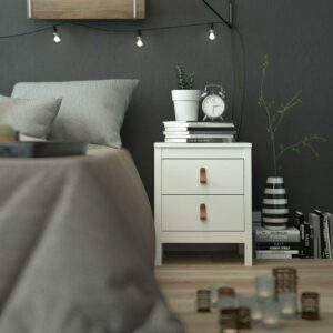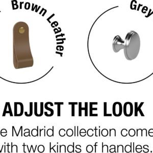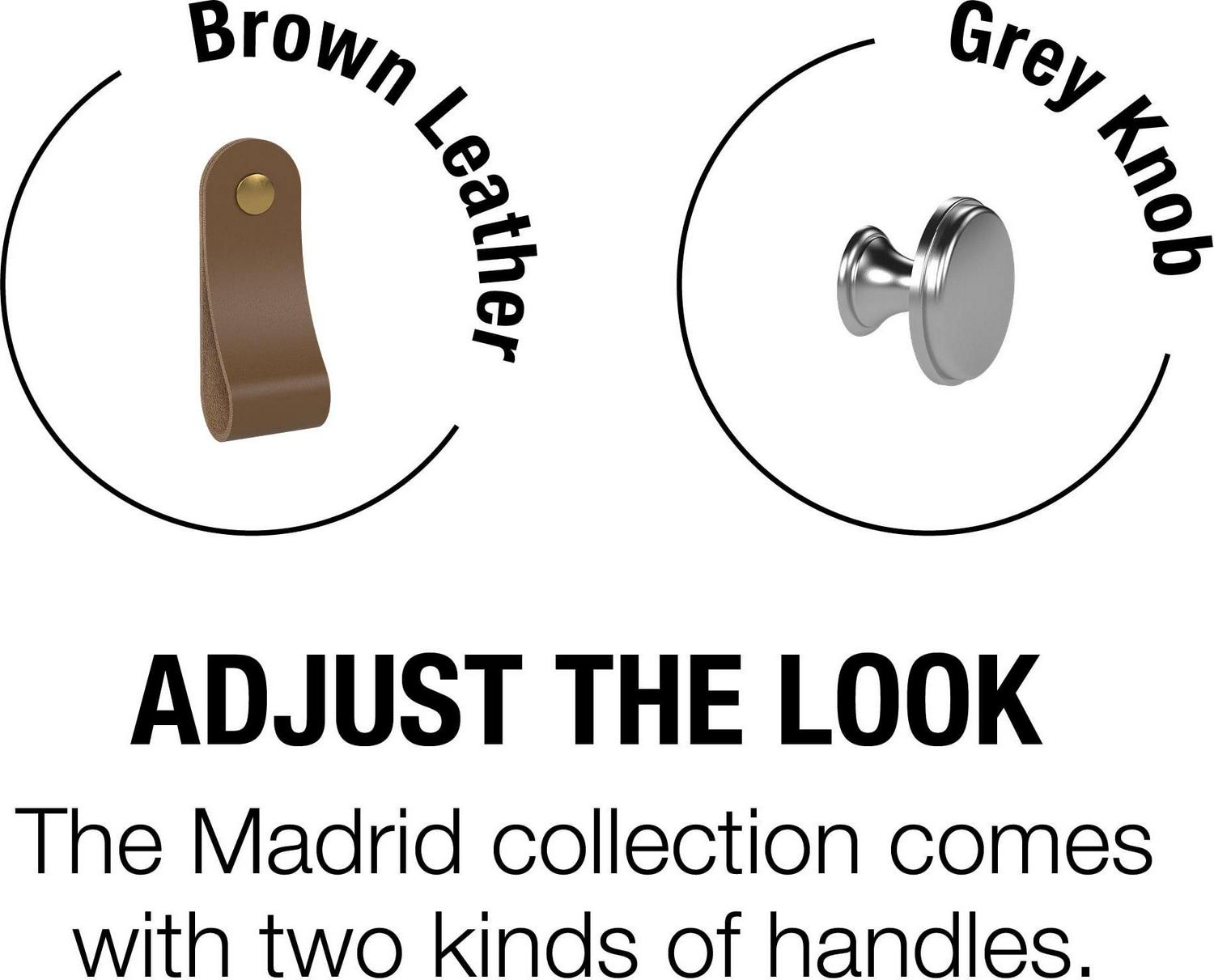 Enhance your bedroom or small space with the Madrid 2 Drawer Nightstand. It features a unique modern-traditional design that s ideal for bedside storage. The two drawers are backed with metal drawer glides and comes with two types of handles-grey knobs and brown leather handles-to customize the look. The Madrid Nightstand has a durable foil surface that is easy to clean. Combine with other pieces from the Madrid collection to complete your living space
