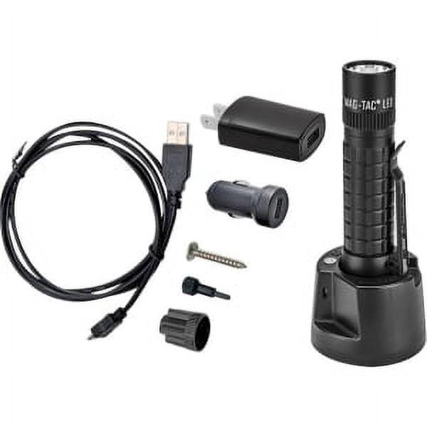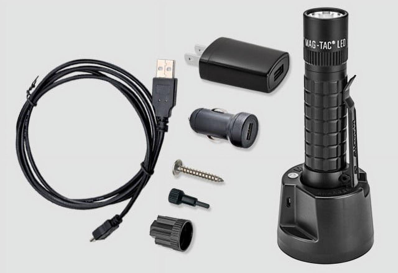 An advanced lighting tool powered by a high capacity Lithium Iron Phosphate (LiFePO4) rechargeable battery engineered for long service life with a 2.5 hr. charge time. Along with superior build quality and performance, this plain-bezel version of the MAG-TAC LED rechargeable flashlight comes with a detachable pocket clip and a USB powered mountable charging base. The charging base can be powered by the included 12V adapter or 120V converter, or by any other charging source that complies with the USB 2.0 Standard. Also, 4 Functions selectable through Mag Instrument’s tailcap-switch-activated “Quick-Click” mode selector. Momentary, Full Power – 533 Lumens @ 2h 30min. runtime Power Save – 112 Lumens @ 4 hr. runtime Strobe