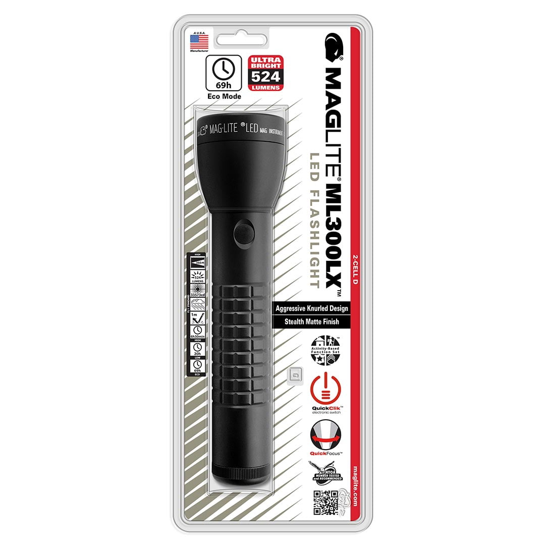 Maglite® ML300LX™ LED D-CELL FLASHLIGHTWhether you’re a professional using a flashlight for work or security, an outdoor enthusiast, or an occasional user wanting it for emergencies at home or on the road; the New Maglite® ML300LX™ LED D-Cell flashlight is the Light For All Your Needs. Multi-mode electronic switch Aggressive Knurled Design and Stealth Matte Finish Advanced focus system (adjusts from spot to flood with less than 1/4 turn of the head) Up to 524 Lumens Up to 69 hrs on-time Eco Mode 4 Activity based function sets to choose from (see chart)