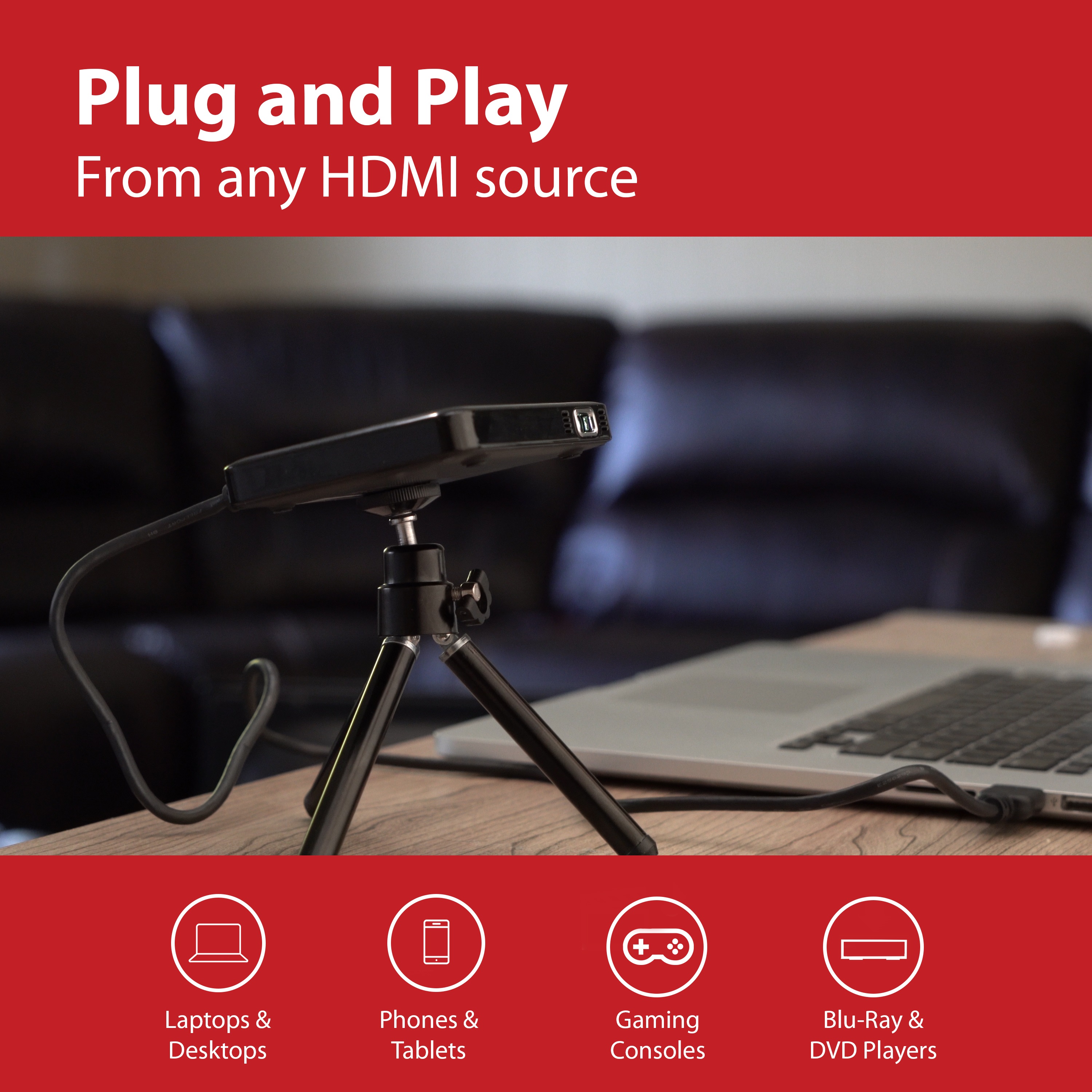 Bring your favorite movies, presentations, video games, and pictures to the big screen thanks to the world’s smallest DLP Mini Projector by Magnasonic. This high performance pocket projector allows you to connect your laptop, smartphone, tablet, and more. Use your HDMI connection to enjoy a home theater experience anywhere due to the long-lasting 2 hour rechargeable battery and built-in speaker. Vibrant Display Quality In Your Hand Enjoy surprisingly large crystal clear picture up to 60″ in size thanks to the 25 ANSI lumen LED light engine powered by Texas Instruments. Digital Light Processing technology allows you to experience sharp and life-like images with the same DLP technology that Hollywood relies on. Comparable to projectors much larger in size, this mini projector features 640 x 360 pixel resolution, 1100:1 high contrast ratio, and will accept input up to 1080p. Pocket Sized Design Allows for Ultimate Portability Watch anywhere! Perfect for TV marathons at home, backyard movie nights, camping with friends and family, or even for your next corporate presentation. No Complicated Set-Up Just Plug & Play with Any HDMI Video Player Compatible with Micro HDMI and HDMI input right out of the box! Share & project video from your smartphone, tablet, laptop, media player or gaming console. Ultra-Convenient Entertainment Tech Gadget There are easy to use volume buttons and an adjustable focus wheel. The built-in rechargeable battery (2100 mAh), this the perfect travel companion. You can even use while charging the battery at the same time. If you want bigger sound than the integrated stereo speaker use the headphone jack to connect external speakers, which is great when entertaining larger audiences. Enjoy maintenance free use for years thanks to the LED bulb’s impressive 20,000 lamp life. What’s Included: PP60 Mini Projector, HDMI Cable, Micro-HDMI Adapter, USB charging cable, Protection Bag, Tripod, Quick Start Guide, Lifetime Customer Support, 1 Year Manufacturer Direct Parts and Labor Warranty