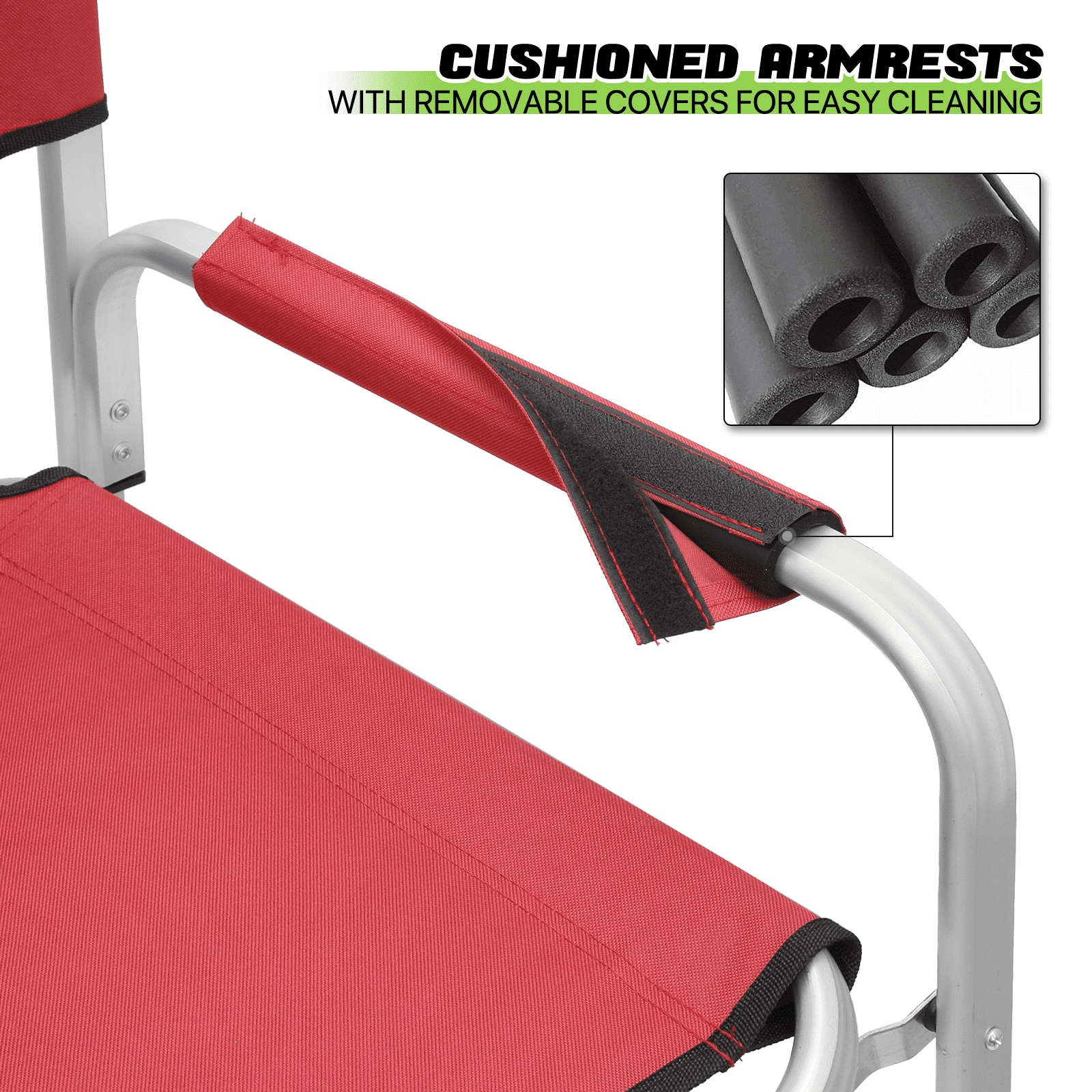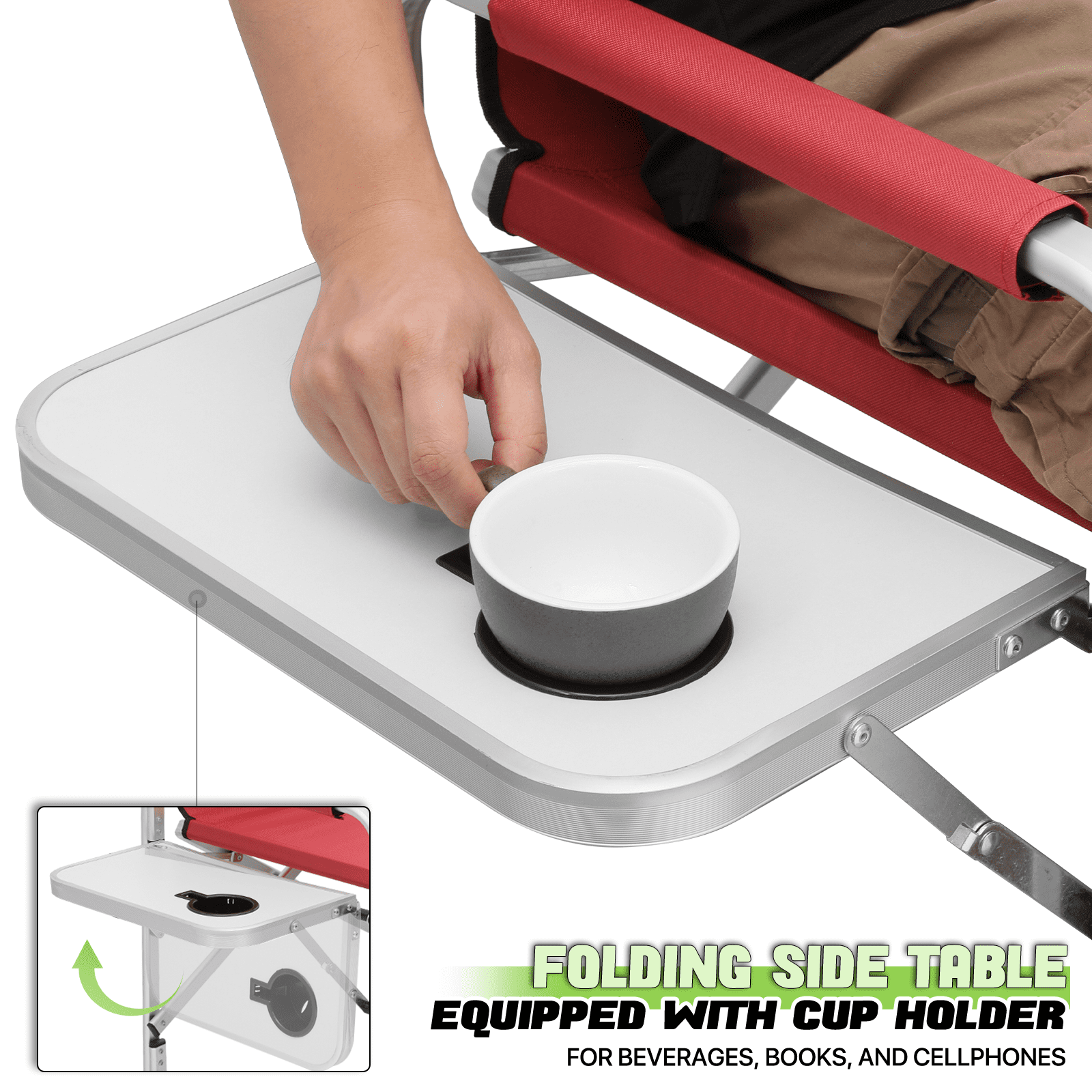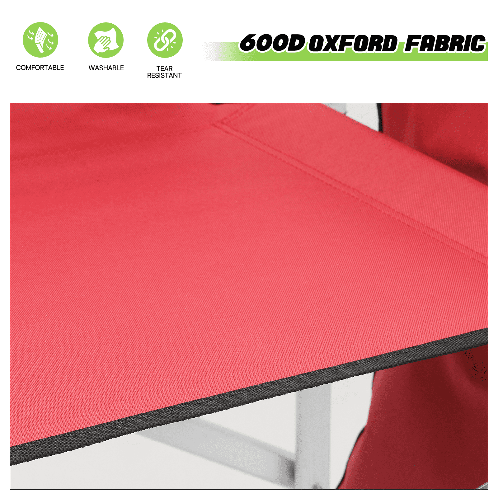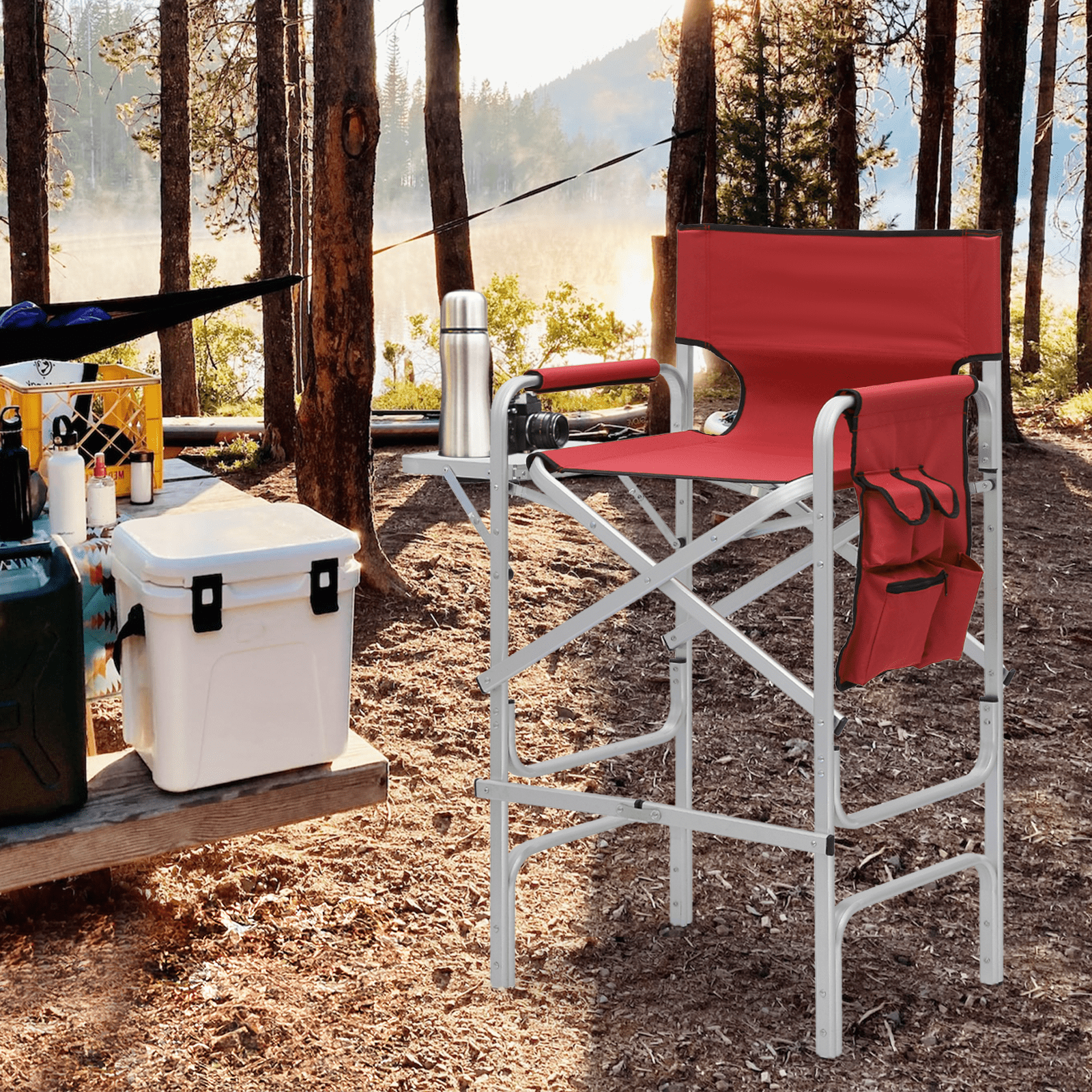 Brand: Magshion Type: Folding Camping Director Chair Color: Red Chair Material: 600D Oxford Frame Material: Aluminium Armrests Material: Tube with Oxford Cloth Overall Size: (L)33″ (W)17″ (H)44.5″ Folding Size: (L)20″ (W)5″ (H)44.5″ Cup Holder: Side Folding Table with Cup Holder Seat-to-floor Height: 31″ Storage Area: Multi-functional Side Pocket (Size: 13″×15″) Seat Size: (L)19″ (W)15.5″ Seat Back Height: 13.5″ Weight Capacity: 250lbs Built for Comfort and Durability Crafted with a high-strength aluminum tube frame and 600D Oxford Fabric, this chair supports up to 250 lbs. Its full back design and cushioned armrests provide the ultimate seating experience. Enjoy an extra-wide seat and high backrest for added comfort. Unmatched Comfort The chair offers foam-padded armrests for support and a steel footrest for relaxed lounging. The seat and back are designed as one full piece to maximize comfort, making standing and sitting an effortless task. Integrated Storage & Workspace Keep your essentials handy with the retractable side table, built-in cup holder, and mesh pockets. Whether you’re storing drinks, snacks, phones, or makeup tools, everything is within reach. Effortless Portability With its foldable design and an included carry bag, transporting this chair is a breeze. Set-up requires only the simple attachment of the chair’s footrest. Versatile Workspace This director’s chair serves as the ideal assistant for beauty makeup artists and professionals in the entertainment industry. Elevate your perspective to better oversee projects or audiences, while also improving your work efficiency. Professional-Grade Its elevated height and side table workspace make this chair not just an outdoor accessory, but also an ideal choice for trade shows, art and craft fairs, makeup booths, and more. Quick Setup & Takedown Setting up or packing this chair is as easy as a one-step process. Simply step on the bottom tube and pull up to fold, offering convenient storage and portability for all your outdoor activities.