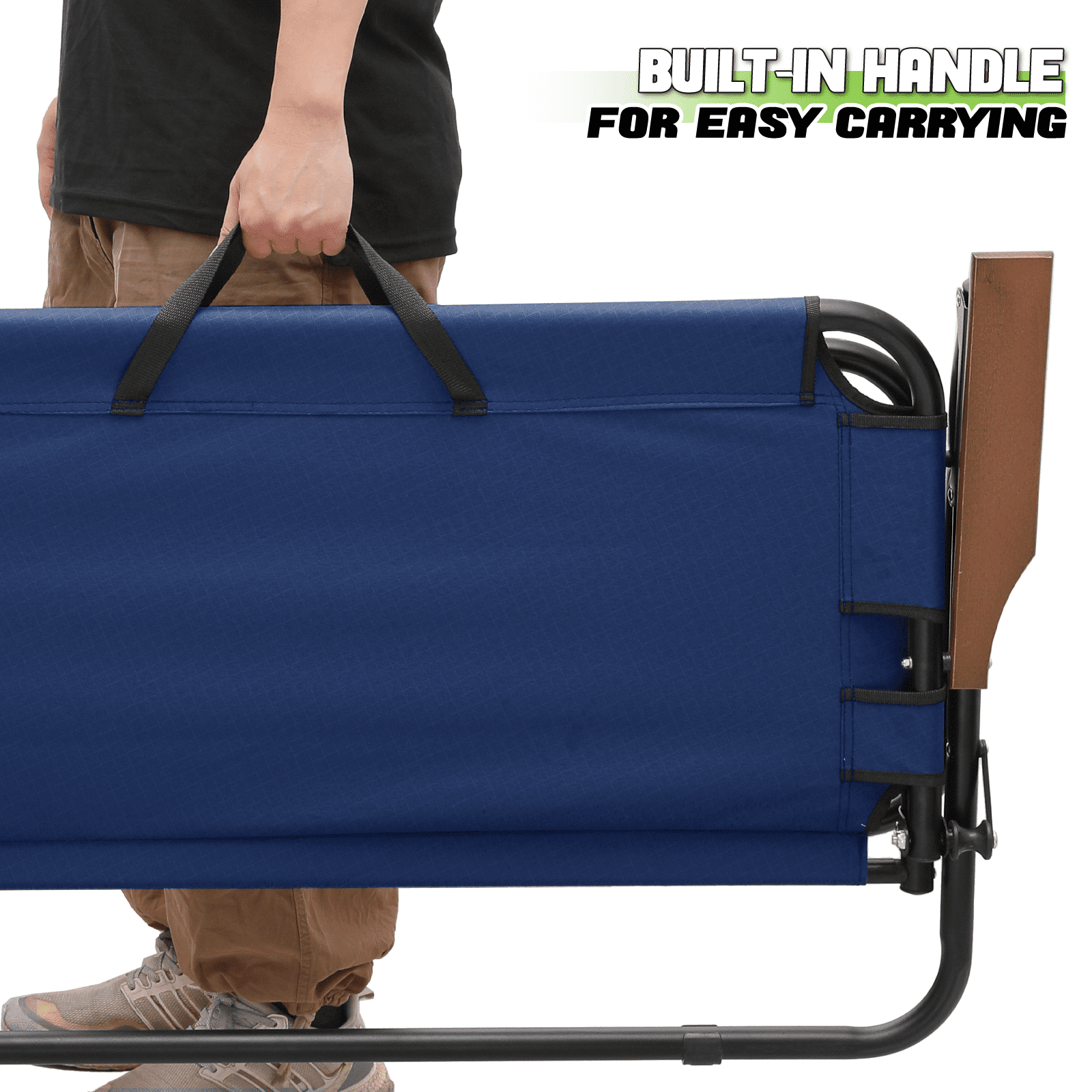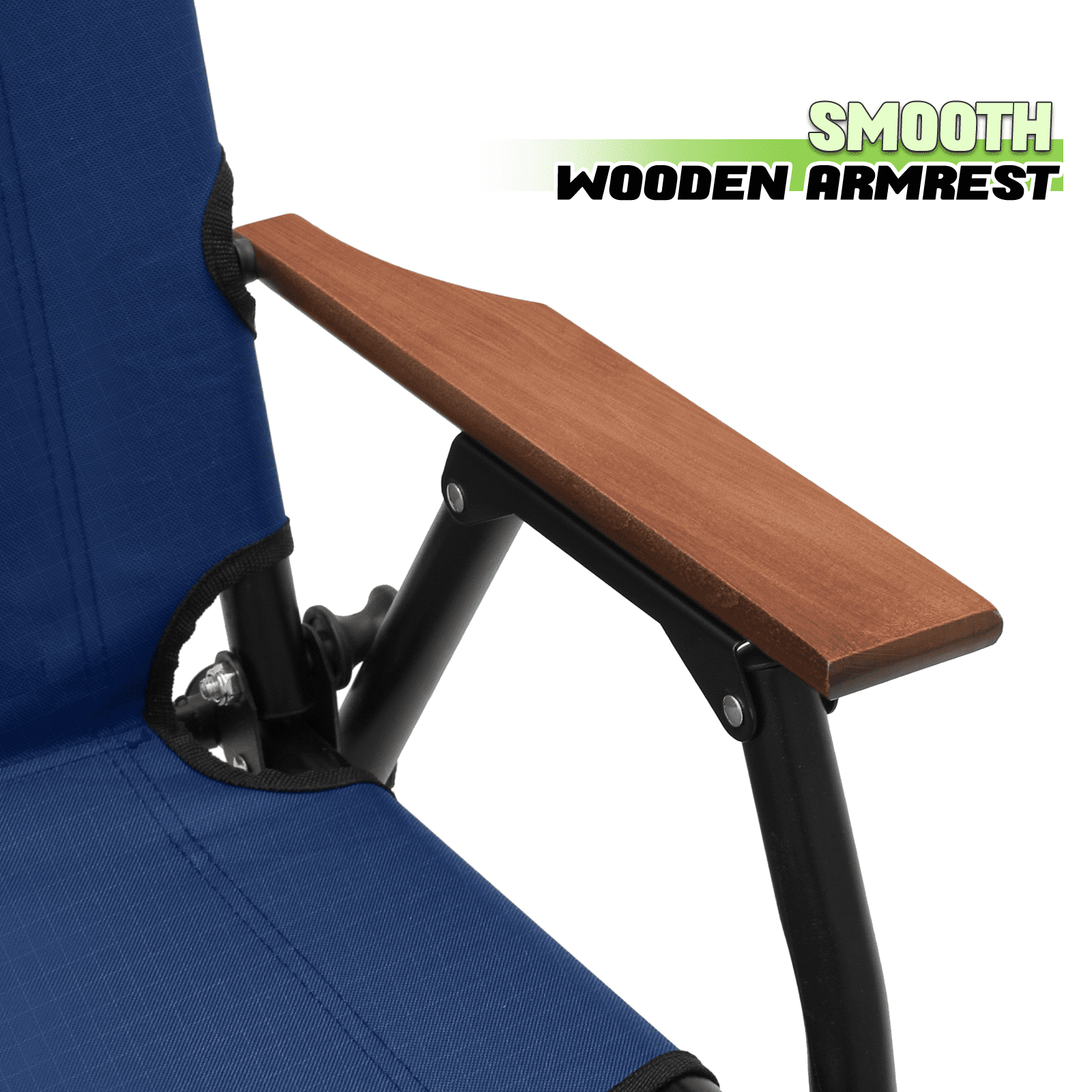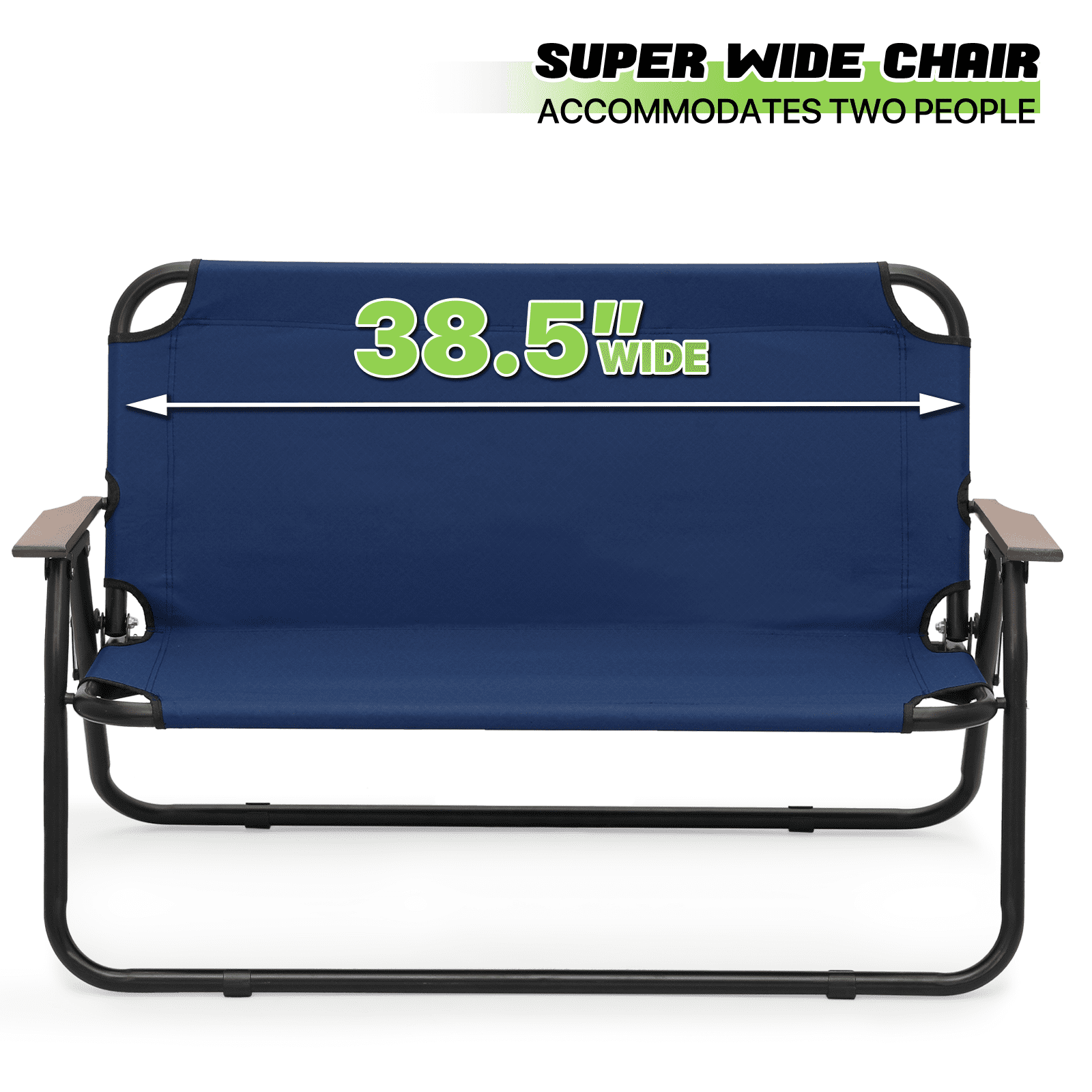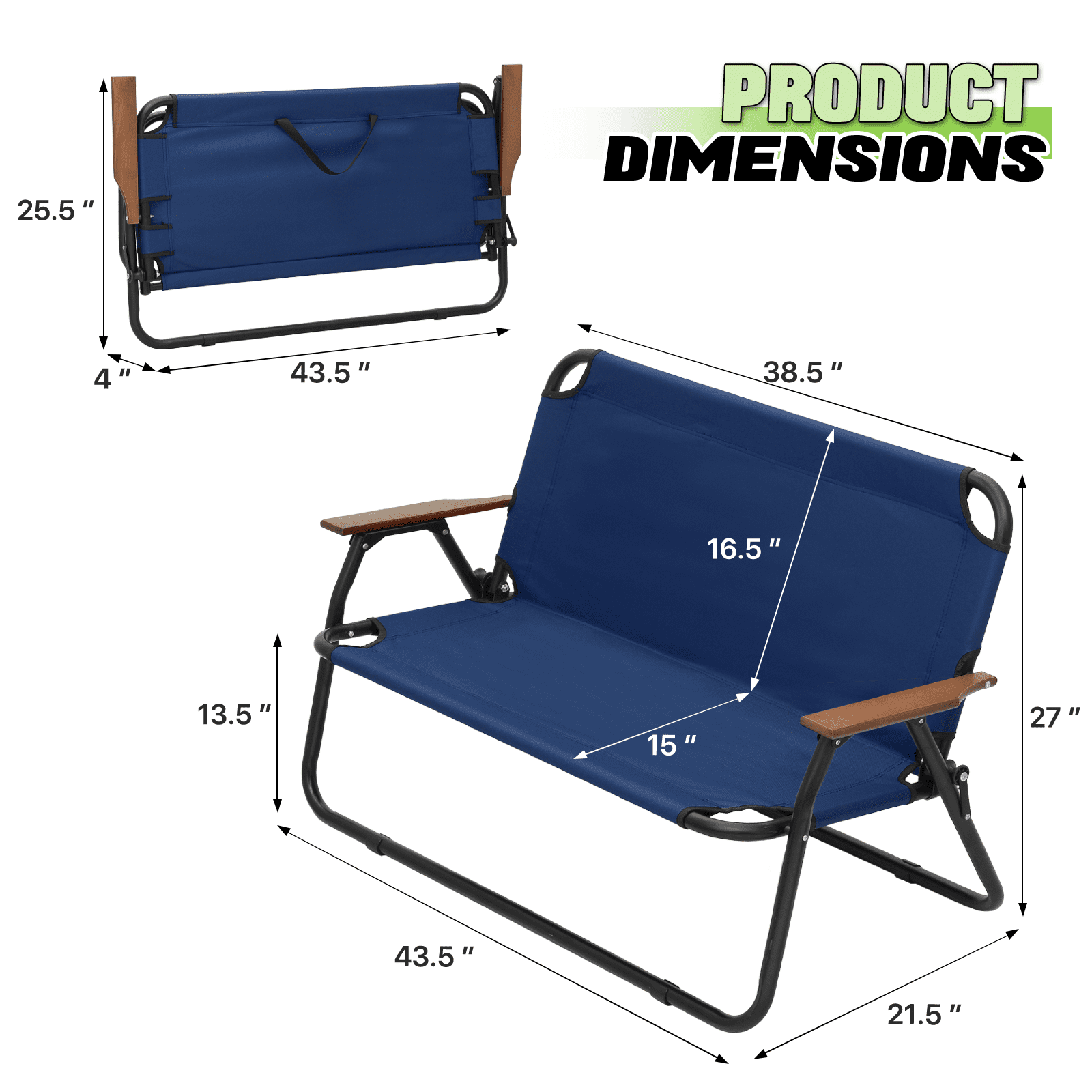 Brand: Magshion Type: Folding Double Camping Chair Color: Navy Blue Chair Material: 600D Oxford Frame Material: Aluminium Armrests Material: Wood Overall Size: (L)43.5″ (W)21.5″ (H)27″ Folding Size: (L)43.5″ (W)4.0″ (H)25.5″ Seat-to-floor Height: 13.5″ Seat Size: (L)38.5″ (W)15″ Seat Back Height: 16.5″ Weight Capacity: 330lbs Features: Portable, Foldable High-Grade Material Crafted from durable and breathable high-density 600D Oxford Cloth, this loveseat camping chair offers wear resistance that’s also effortless to clean. Its aluminum frame ensures lasting stability. Robust Construction Engineered with a triangulated frame design on both sides, the chair delivers exceptional stability. Additionally, non-slip foot pads not only secure your seat but also safeguard your flooring. User-Friendly Design A convenient built-in carrying strap allows for easy portability. Designed to seat two, this chair encourages intimate conversations and supports a generous weight capacity of up to 330 lbs. Wooden Armrests Stylish wooden armrests not only elevate the chair’s aesthetics but also offer a comfortable and natural resting place for your arms. Versatile Use This portable loveseat is ideal for a wide range of activities, from family gatherings to backyard barbecues. Its foldable design makes it easy to store in your car trunk, perfect for hiking, picnics, travel, fishing, and hunting. Long-Lasting Durability Constructed with high-quality materials and superior craftsmanship, this chair is designed to provide years of reliable use. No Assembly Required Skip the hassle of complicated setups; just unbox, unfold, and you’re ready to relax in moments. Easy to Clean Stains or spills are not a worry; our chair’s fabric is easy to clean, ensuring it looks new for years to come.