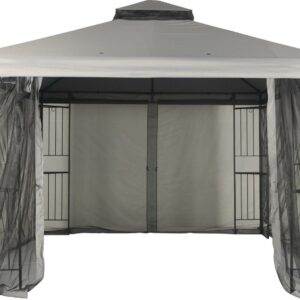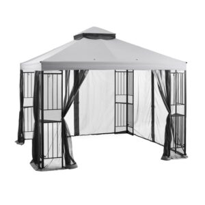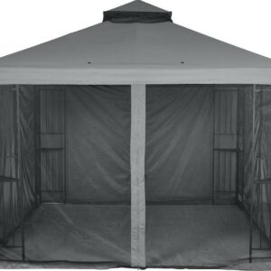 The Mainstays 10′ x 10′ Easy Assembly Gazebo is made with Gray fade-resistant fabric that will provide both long wear & durability. It has a two-tiered roof for better airflow and provides an elegant allure. This gazebo is easy it is to assemble, absolutely no bolts or tools are necessary. This gazebo is put together with hand-tightening clamps that hold the pieces together. The beautiful Mainstays 10′ x 10′ Easy Assembly Gazebo is a perfect addition to any location, it can be put it on your yard or deck. Its powder coated in a matte black finish and has a grey canopy with black mosquito netting.
