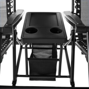 Transform any porch, backyard, or outdoor setting into a comfortable area to rest and unwind with the Mainstays 2-Seat Reclining Oversized Zero-Gravity Swing with Canopy and Center Storage Console, Black. The design of this revolutionary, zero-gravity swing set features quality craftsmanship with 2 spacious seats that swing soothingly and recline independently, adjustable to any desired position with bungee ties for zero-gravity comfort. Built-in pillows for comfort and a curved, adjustable canopy for shade and protection from the elements are included, along with a center console that features a table, storage container, and cup holders. The seats and canopy are crafted with black, woven, ventilated, fade-resistant sling fabric, and the sturdy, freestanding, black frame is constructed of powder-coated, rust-resistant steel for longevity. The sleek look of the all-season swing set complements most other outdoor furniture and decor. Relax peacefully or enjoy a pleasant chat with a friend or family member on any porch, patio, or deck with the Mainstays 2-Seat Reclining Oversized Zero-Gravity Swing with Canopy and Center Storage Console.