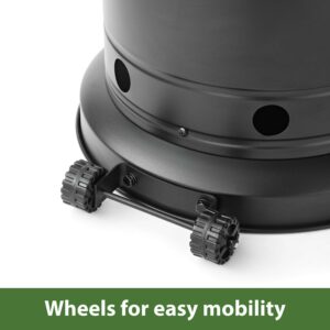 – Propane gas heater includes two wheels for transport, easy-to-use Piezo ignition, heat shield, and reflective cover