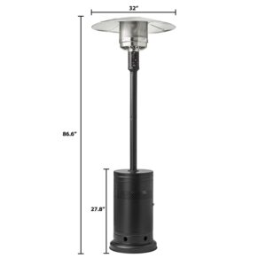Create a warm comfort zone of up to 200 square feet for cool outdoor events with the commercial-grade Mainstays 48,000 BTU Propane Gas Outdoor Freestanding Metal Patio Heater, Black. This stylish heater features a sleek design to complement any decor and includes two wheels for mobility, an easy-to-use Piezo ignition, a heat shield, and a reflective cover. It s CSA-approved with a thermocouple, anti-tilt device, and automatic shut-off safety feature. It measures 31.5″L x 31.5″W x 86.6″H, features double-door access to a standard 20-pound propane tank (not included), and produces up to 48,000 BTUs of heat output with its adjustable flame. The surface remains cool enough to use as a table for cold drinks. Crafted of durable metal with a black, powder-coated, rust-resistant finish for all-season, weather-resistant endurance, the portable, freestanding heater is ideal for patios, decks, and campgrounds. For warm comfort with cool style, add one or more of these Mainstays patio heaters to your favorite outdoor area when relaxing or entertaining throughout the fall and winter seasons.