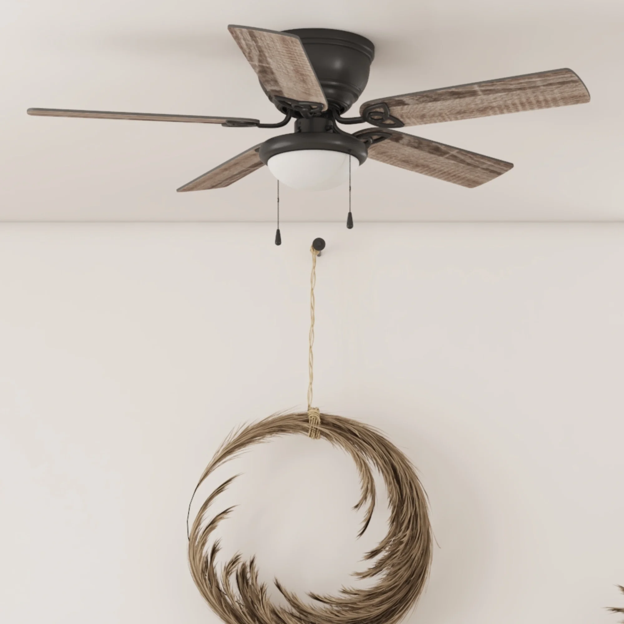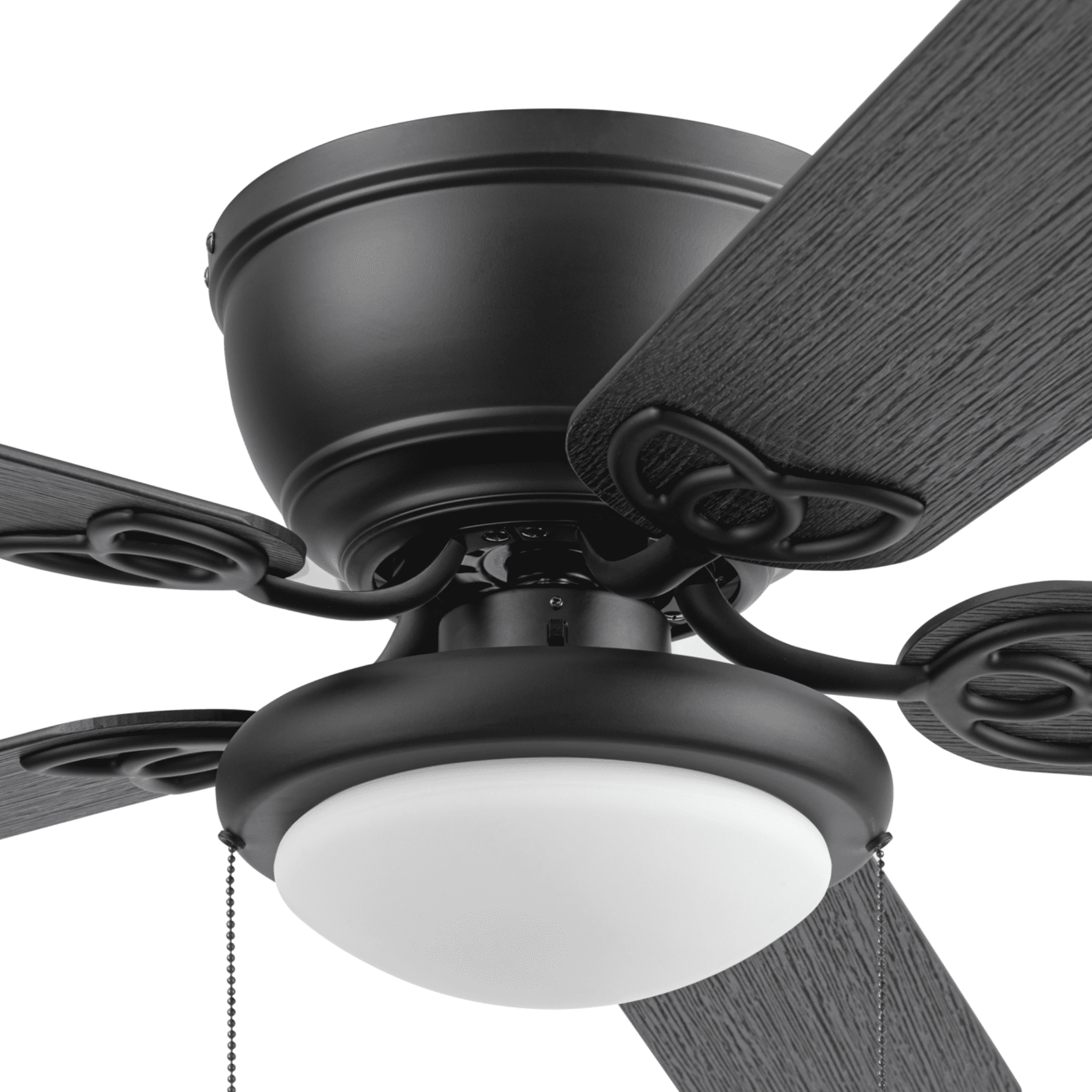 This Mainstays low profile ceiling fan features an integrated frosted glass globe that houses an LED bulb, illuminating your space. Five reversible blades provide comforting, adjustable airflow. This indoor ceiling fan’s traditional design complements an array of spaces and decor styles. Pull chains are included for easy adjustments to the light and speed settings. Use the reversible airflow switch to properly distribute air during warmer and colder months.