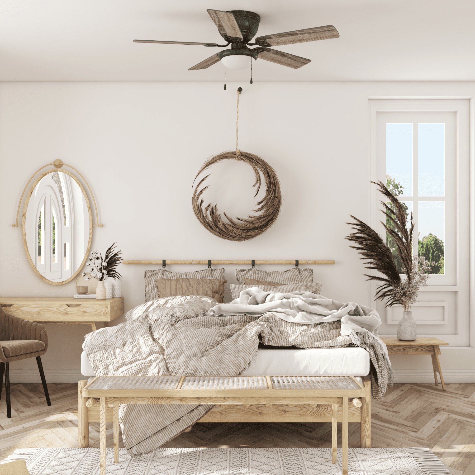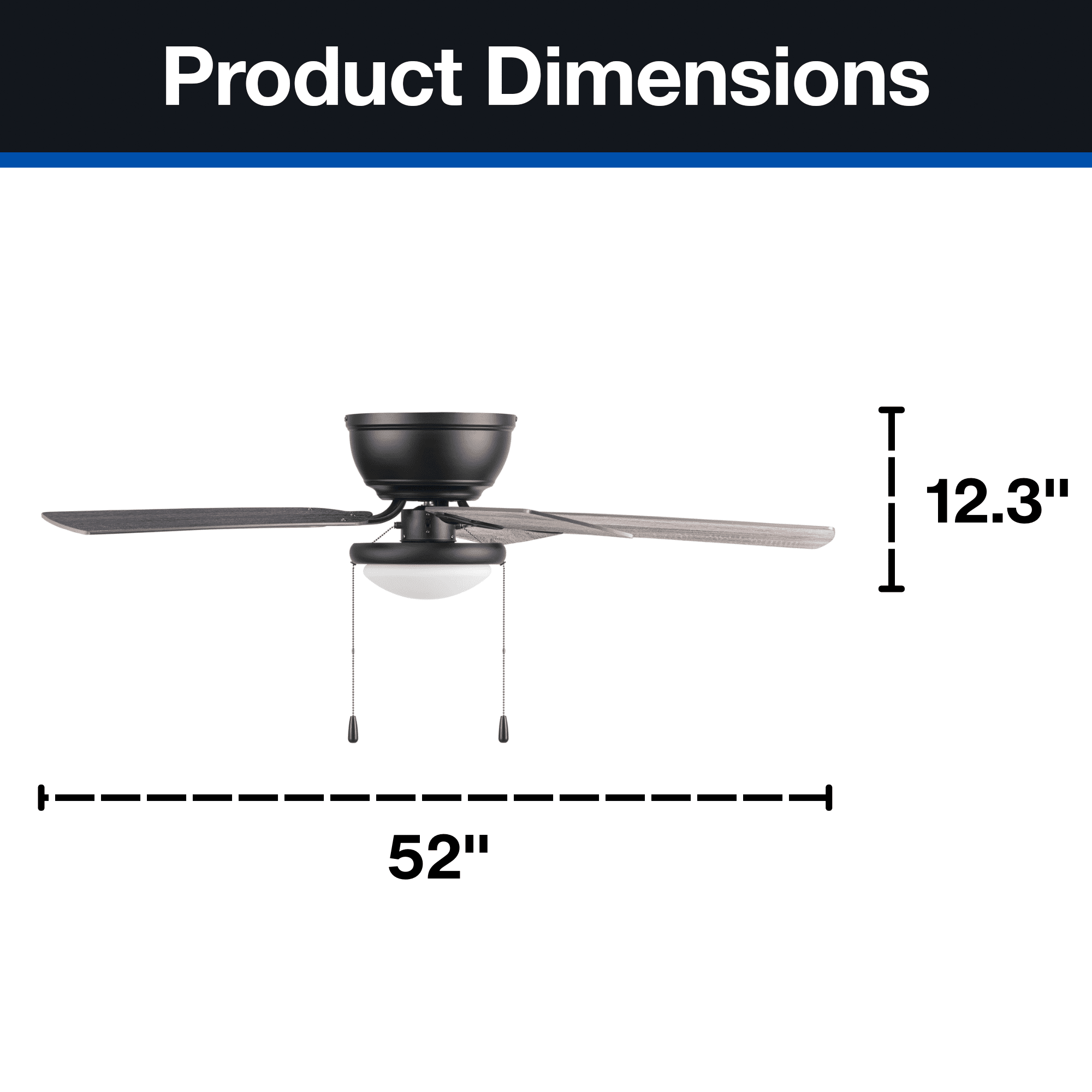 Keep Cool With The Correct Ceiling Fan Size: This 52 inch indoor ceiling fan is ideal for large areas up to 400 sq. ft. such as bedrooms and living rooms. Low Profile Mount: To be mounted flush with the ceiling where more walk-through space is needed Indoor Ceiling Fan: Perfect for living rooms, bedrooms, or offices Pull Chain Control: Easy-to-use pull chains are included for quick adjustments to the light and speed settings Ceiling Fan With Light: Frosted glass globe houses E26, A19 LED bulb Reversible Blades: Choose between Rough Pine and Coal to best fit your space Crafted With High-Quality Material: The high-capacity motor delivers powerful airflow and quiet performance for years to come; This durable and classic ceiling fan is designed for long lasting comfort; ETL listed