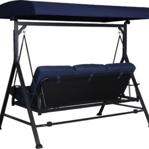 Kick back and relax in the shade with the Mainstays Belden Park 3-Person Swinging Daybed with Canopy in Blue. Up to three people can lay back on the cushioned swing, whether it s set up for upright seating or turned down as a daybed for full relaxation. The sloped canopy keeps the sun out of the way and falling leaves at bay. The Mainstays Belden Park 3-Person Swinging Daybed with Canopy can go on a patio in a screened-in porch to create a relaxing outdoor space that s perfect for lounging