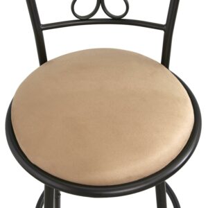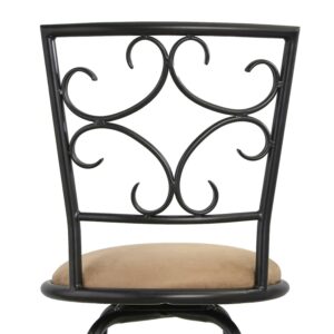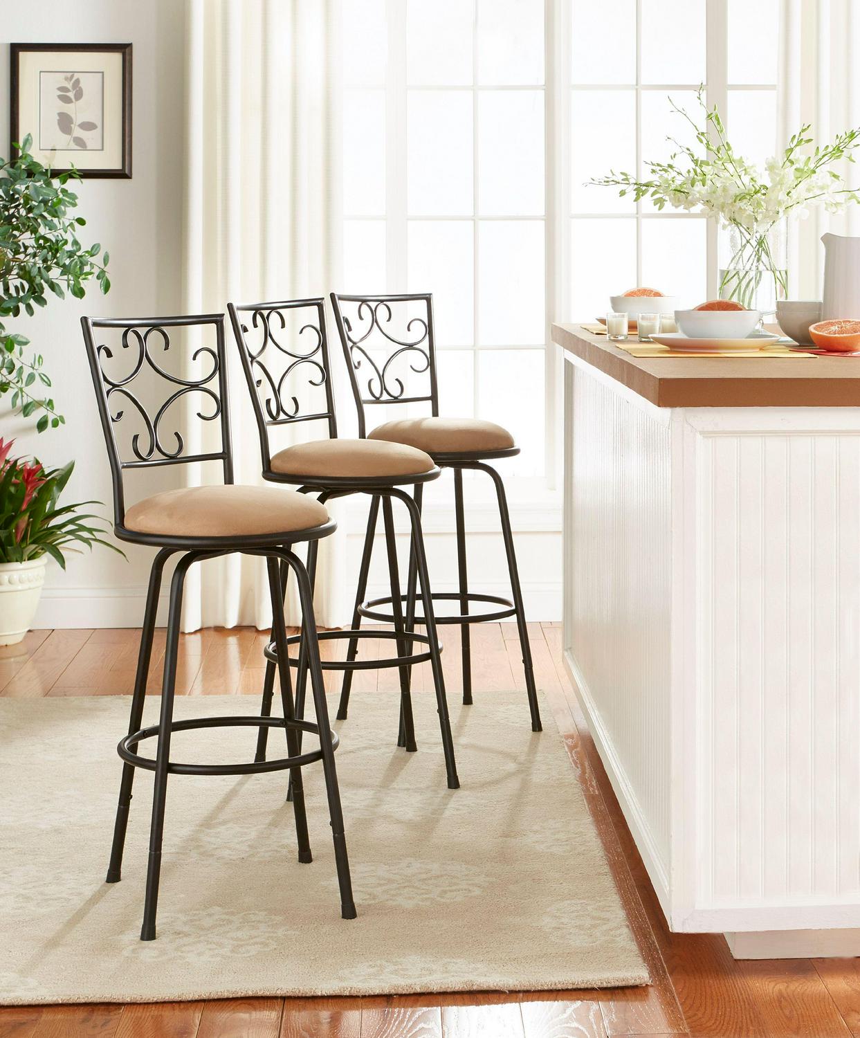 The Mainstays Gillian Adjustable Height Swivel Barstool, Set of 3, look great in any dining area or home bar. They feature adjustable legs. Use the included leg extensions to choose between two seat heights 24 inches, which is the ideal height for counter-height kitchen islands, or 30 inches, which is ideal for bar-height pub tables. The stools feature swivel seats for easy conversation and are upholstered in a tan microfiber fabric. The chair-backs are designed with a graceful scroll pattern, adding elegance to your room. Crafted of metal, the stools are finished in a versatile black finish, which coordinates easily with any décor.