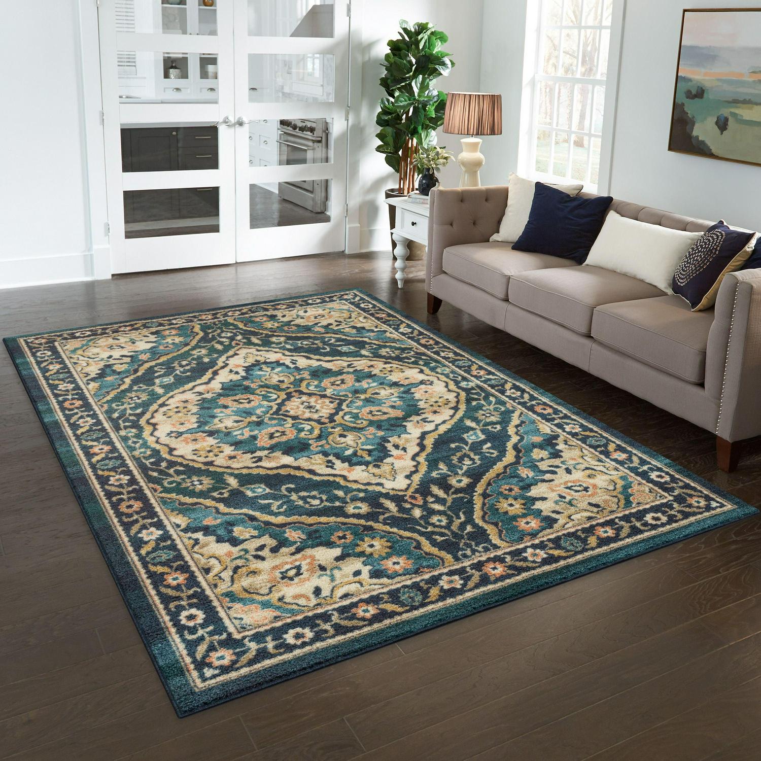 Allow the Mainstays Palermo Persian Polyester Print Area Rug to add gorgeous style and design to your home décor. This oversized medallion design is framed by an intricate border with floral motifs. The base color of teal and blue are complimented by a lovely touch of blush and cream tones that will instantly add a pop of color to any room. This beautiful indoor area rug features non-skid latex backing to help keep it in place so no need to purchase a rug pad separately. The care instructions for this 7 x10 size rug are simple as well, spot clean and air dry. This perfectly sized area rug makes this an ideal rug for any room of your home; bedroom, living room, dining room, or even home office. The Mainstays Palermo Persian Polyester Print Area Rug features a premium feel and stain and fade resistant durability that make this a must for your home.