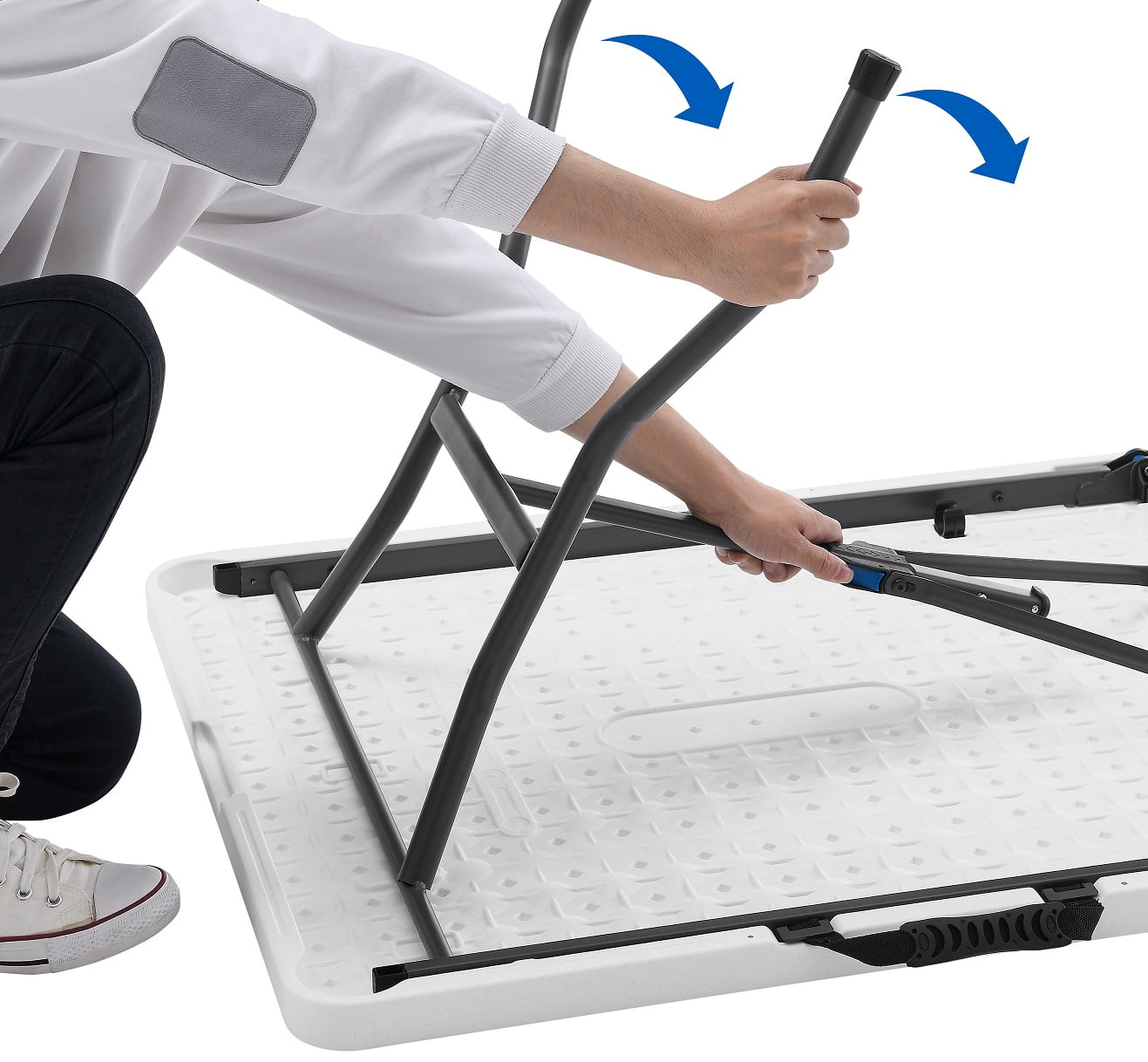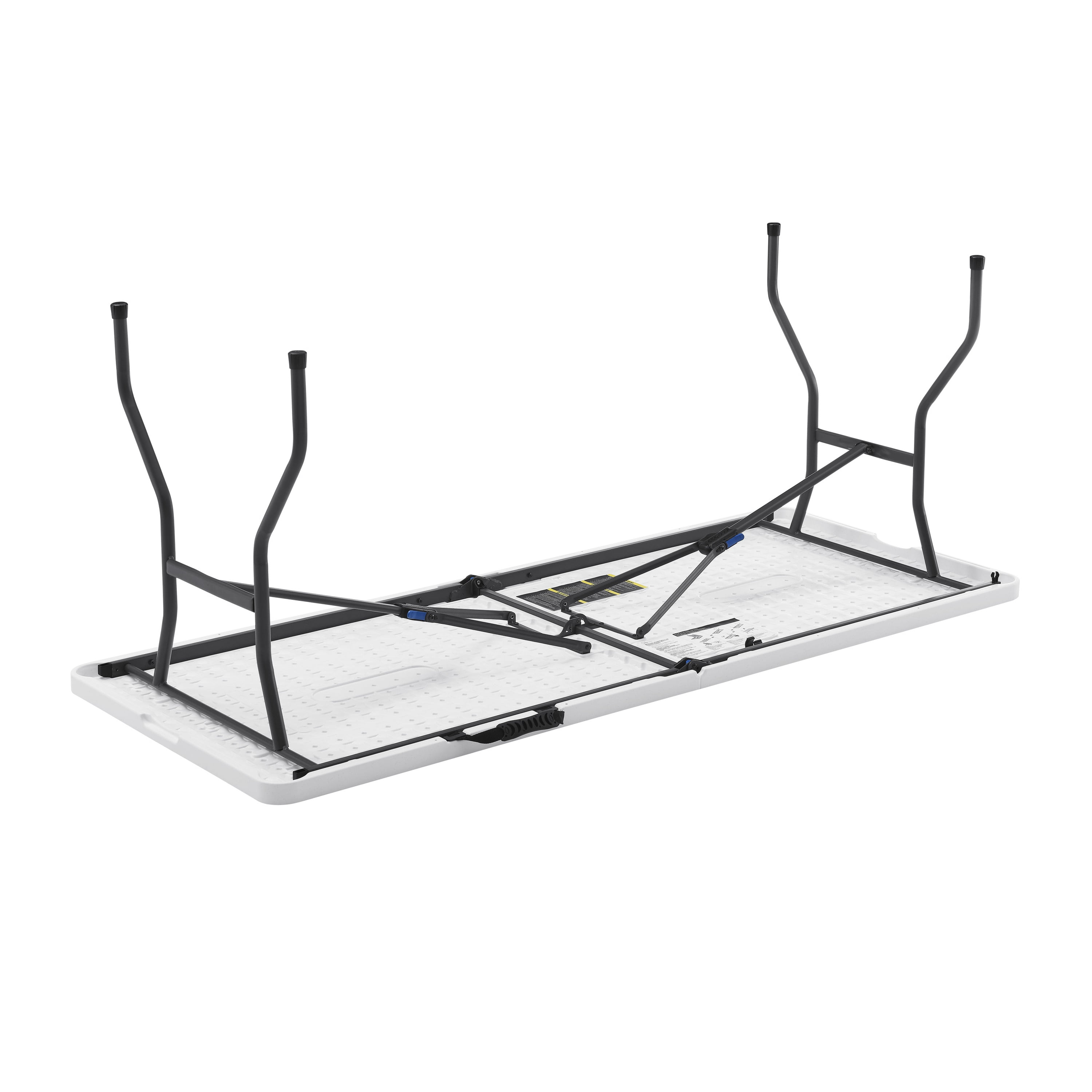 Mainstays 6 Foot Fold-in-Half Plastic Table, Indoor Outdoor, White Granite Comfortable seats up to 8 adults Assembled dimensions each: 72″ x 30″ x 29″ Round legs and side support bar for strength and durability Auto-locking leg system Patent pending ergonomic pinch free buttons for easy folding of legs Easy auto locking and unlocking in the center of table Easily folds in half for convenient storage or transport Constructed of UV-Protected high-density polyethylene and gray powder-coated steel Includes built-in carry handle, for easy transportation Built for indoor and outdoor use Durable caps on legs to prevent floor damage No assembly needed, can be open and folded in a few seconds Assembled dimensions each: 72″ x 30″ x 29″ Folded dimension: 36.69″ L x 30.00″ W x 3.00″ H Weight: 26.01 Lbs. Weight Capacity: 350 lbs. Perfect for your home, office, or outdoor activities