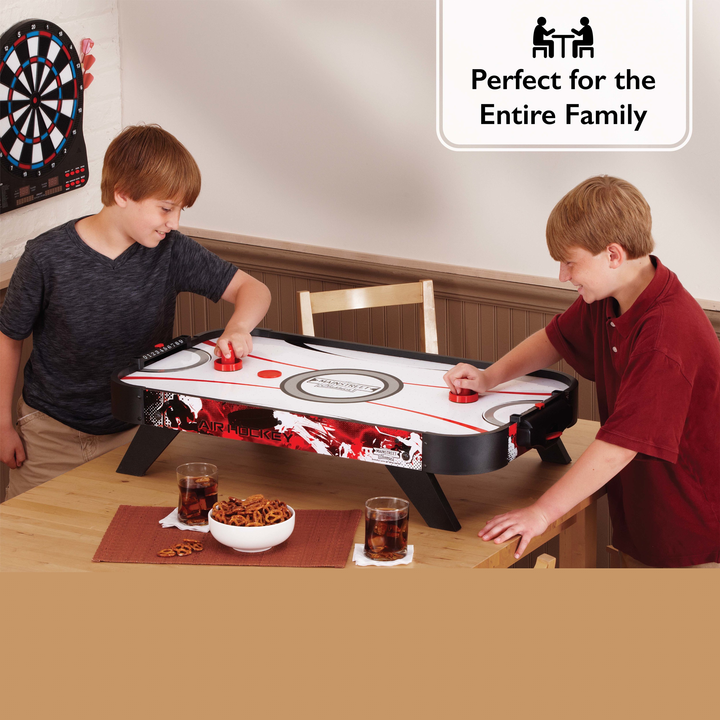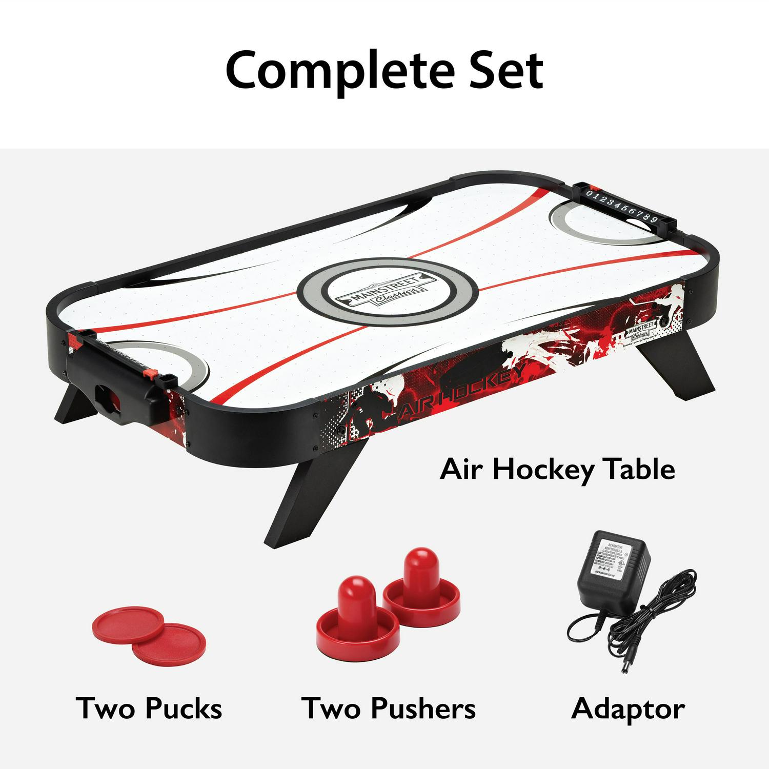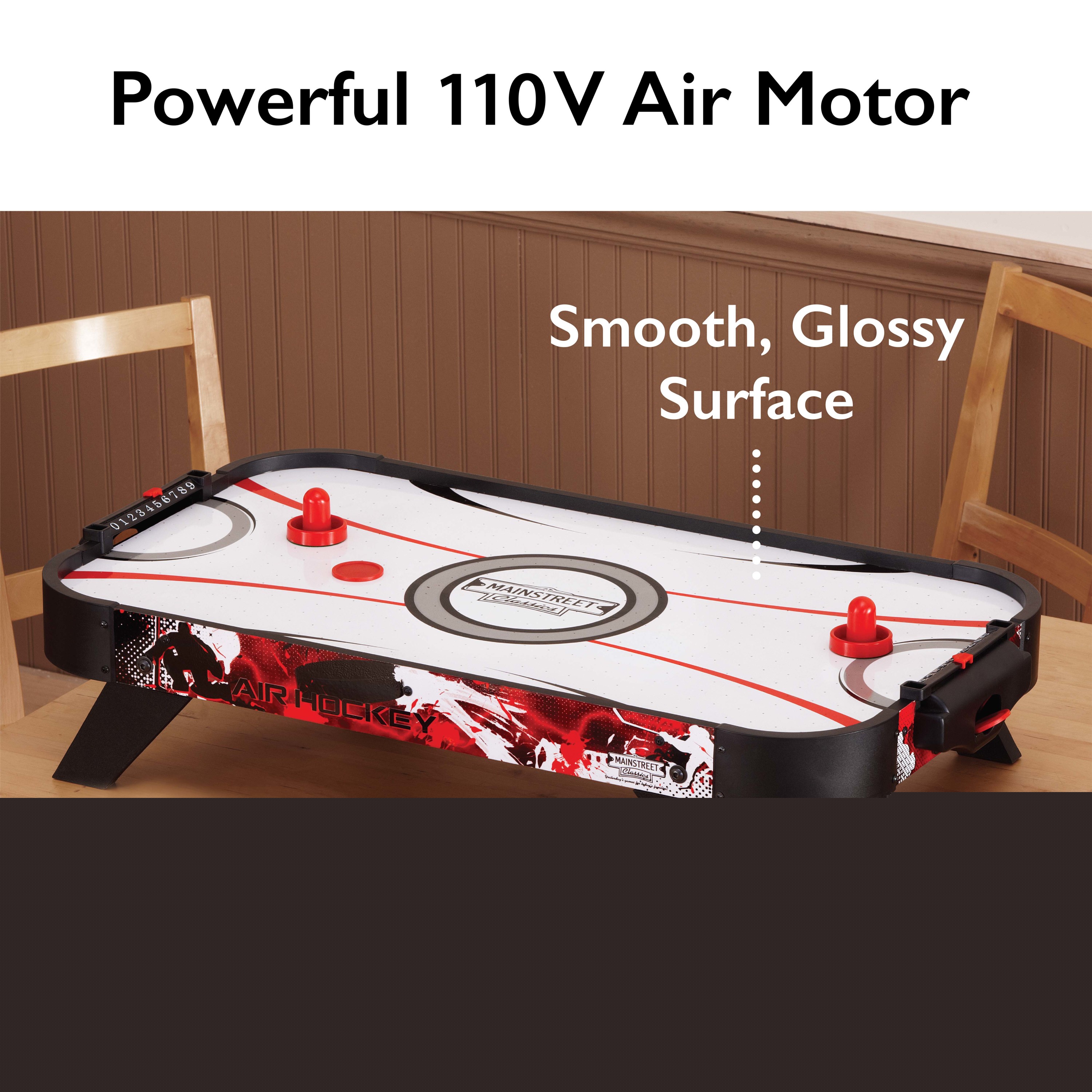 For fast-paced family fun, look no further than the Mainstreet Classics Table Top Air Hockey game set! This compact and portable tabletop air hockey table is the perfect addition to any family game room. The best part is, you don t need to sacrifice any features! It comes with a built-in 110V motor, two pushers, and two pucks so you have everything you need to play. This tabletop air hockey set can be quickly set up almost anywhere, and when you re done playing, its small size lets you easily store it away. You don t need to sacrifice space for fun when you go with the Mainstreet Classics Table Top Air Hockey set.