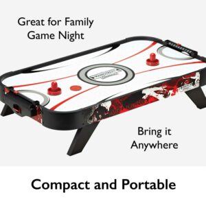 – Compact and Portable – You won t need to sacrifice an entire room for this fun tabletop air hockey set, it easily packs up and can be moved anywhere for portable fun