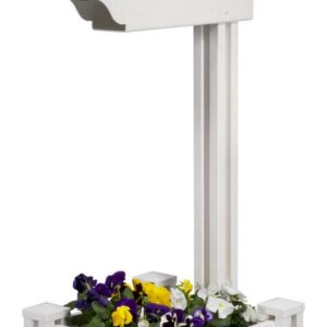 Equipped with a planter box and a newspaper holder, this white vinyl mailbox post separates from the rest with these distinguishable details that attract the eye. In addition to visual charm, we designed this post for easy installation with a no-dig pipe used to anchor the structure. Simply drive the pipe into the ground with a sledge hammer and sleeve the post over the pipe. Once installed, add the finishing touches by purchasing a mailbox and planting your flowers. Assembly required.
