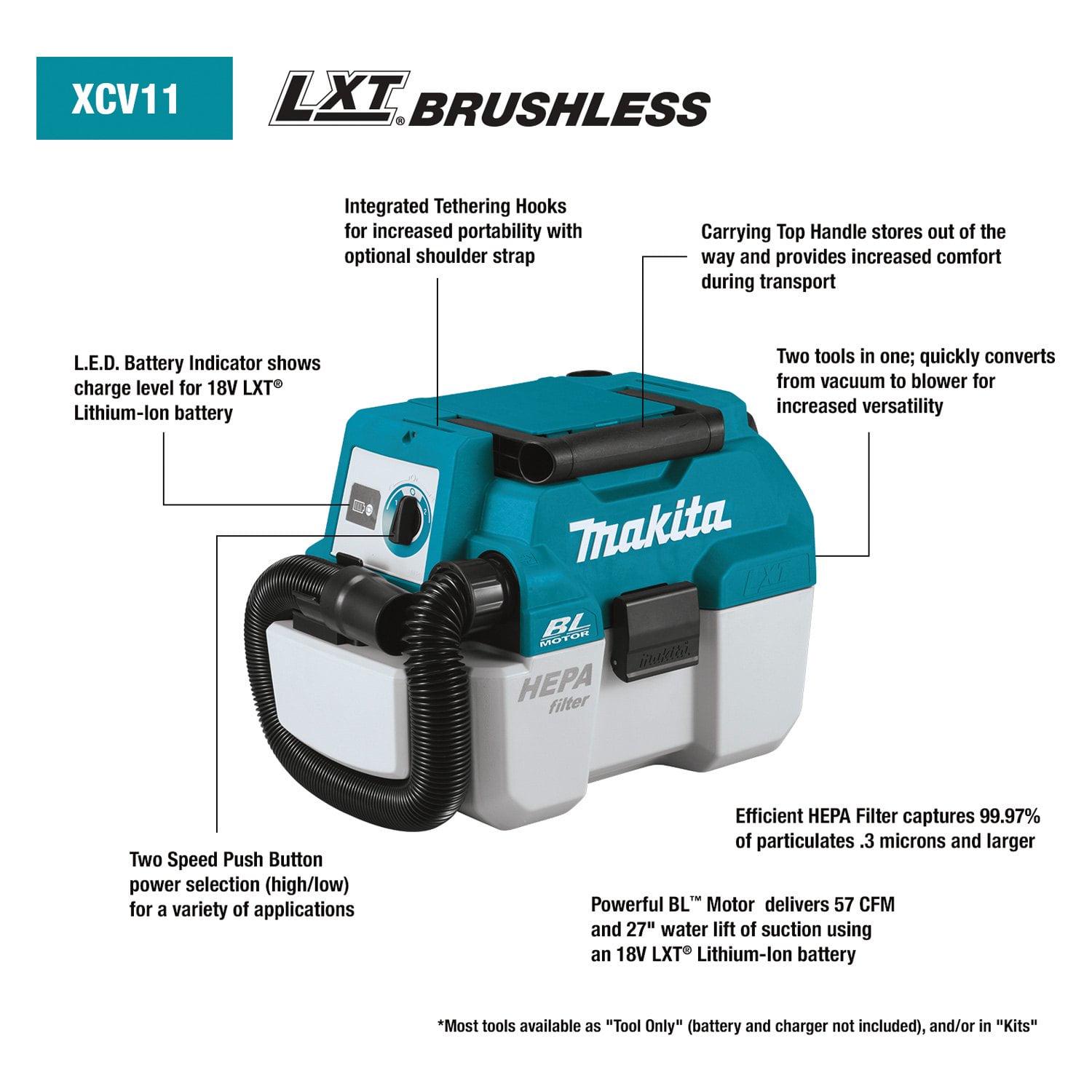 Makita XCV11Z – LXT 2 gal. Cordless Wet/Dry 18V HEPA Filter Canister Vacuum Cleaner and Blower