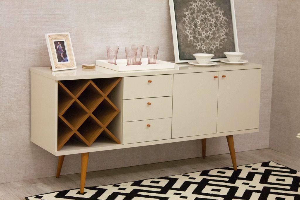 Modern Sideboard and Buffet Stand for Living and Dining Room Use. * Upon Assembly, Measures: 63.38 in. Length, 30.31 in. Height, 17.32 in. Depth. * Features a Side Wine Rack with Space for 4 Standard Bottles * Includes 3 Full Extension Drawers, Wine Rack Display, and 2 Concealed Shelves. * Copper Metal Round Door Handles * Fashionable Splayed Legs made from Solid Wood for Extra Durability. * Removeable Wine Rack – Choose to Use the Space for other Display and Storage Needs. * Home Assembly Required. All Hardware Included.