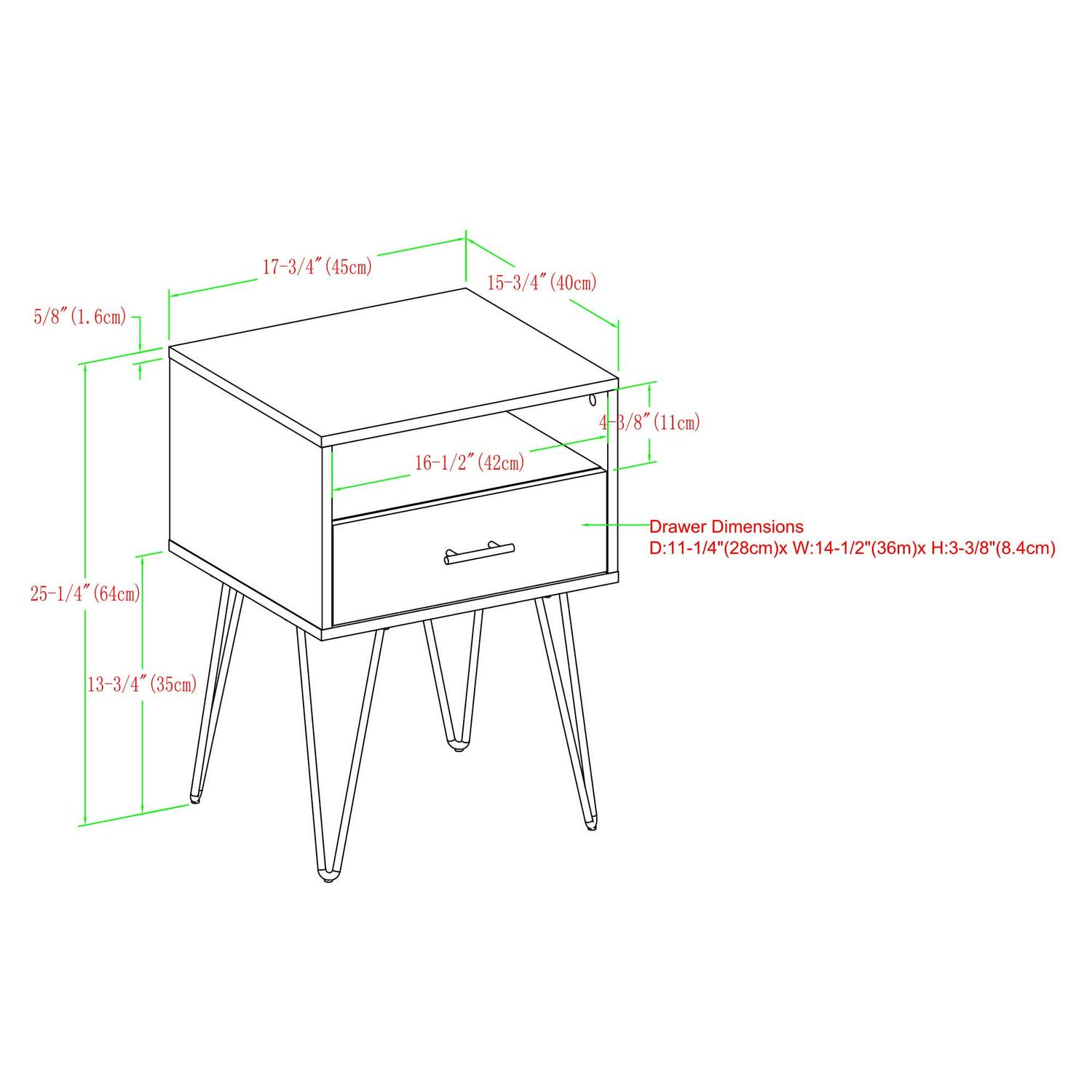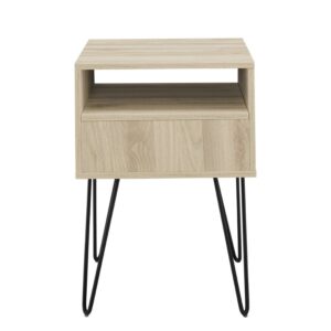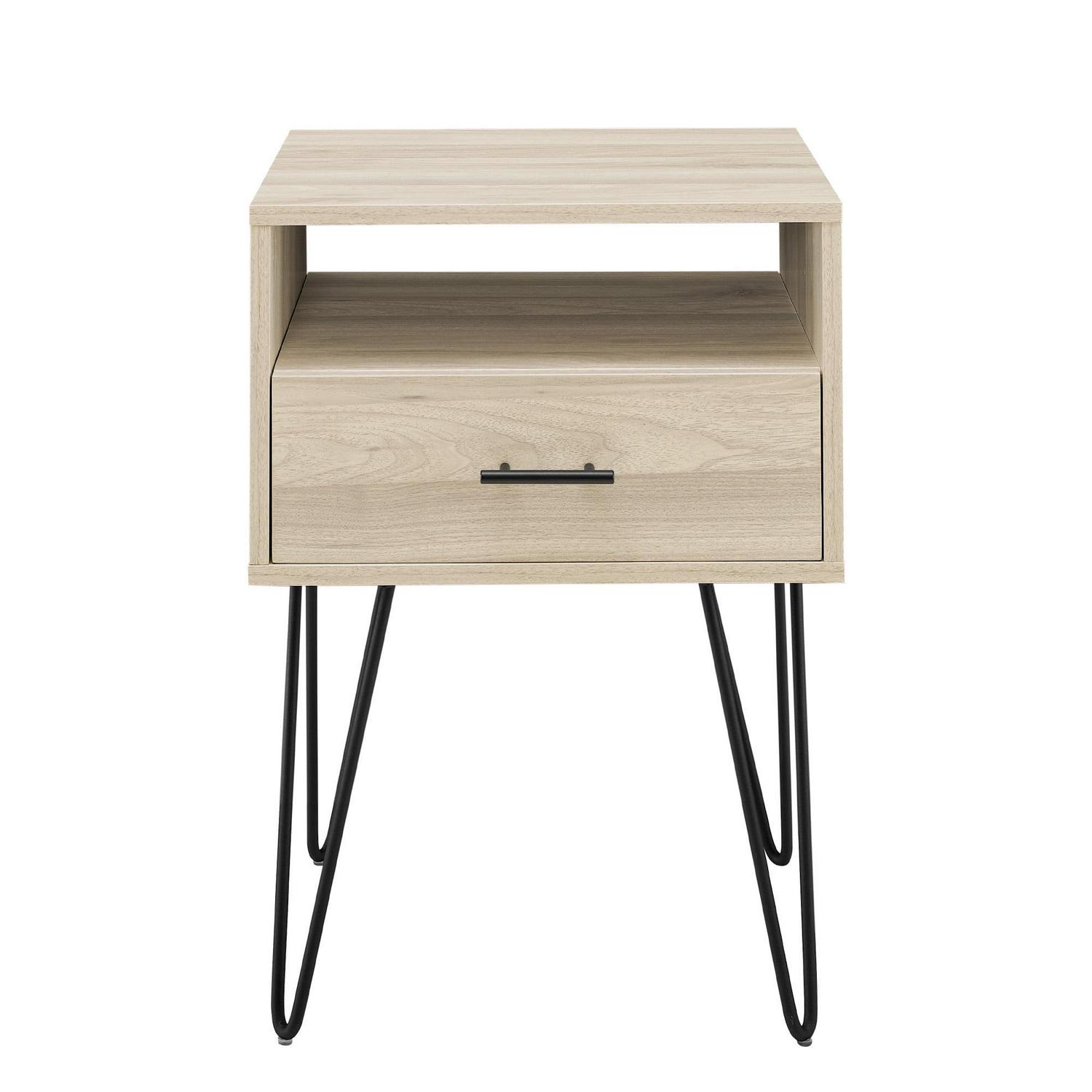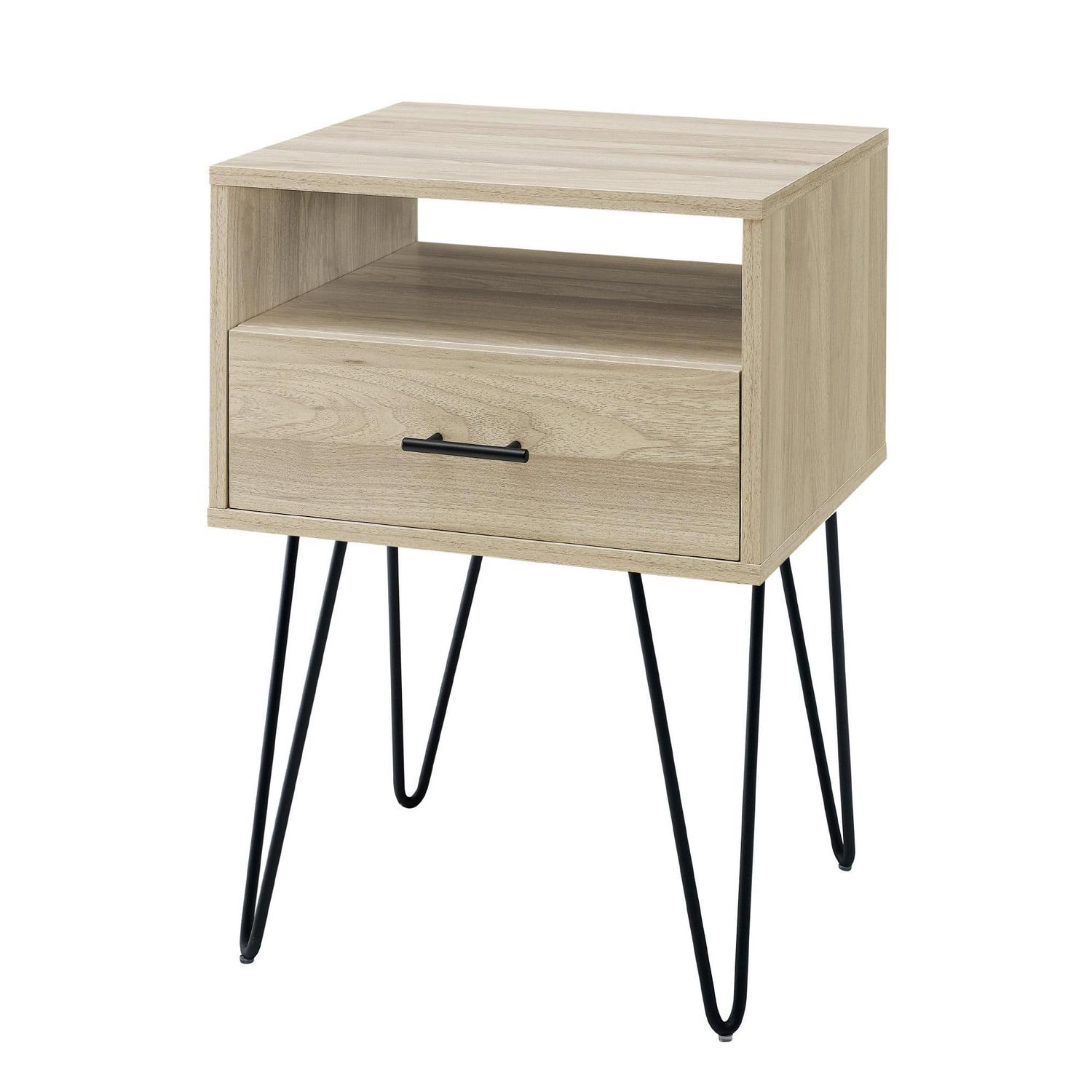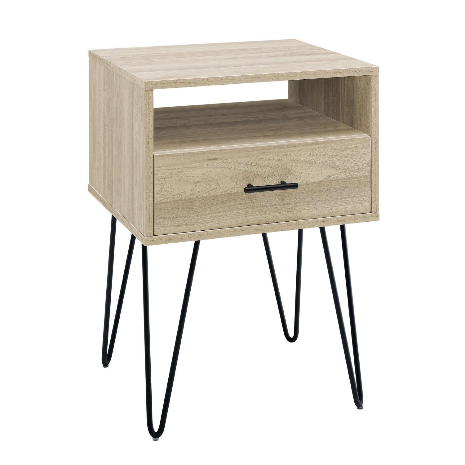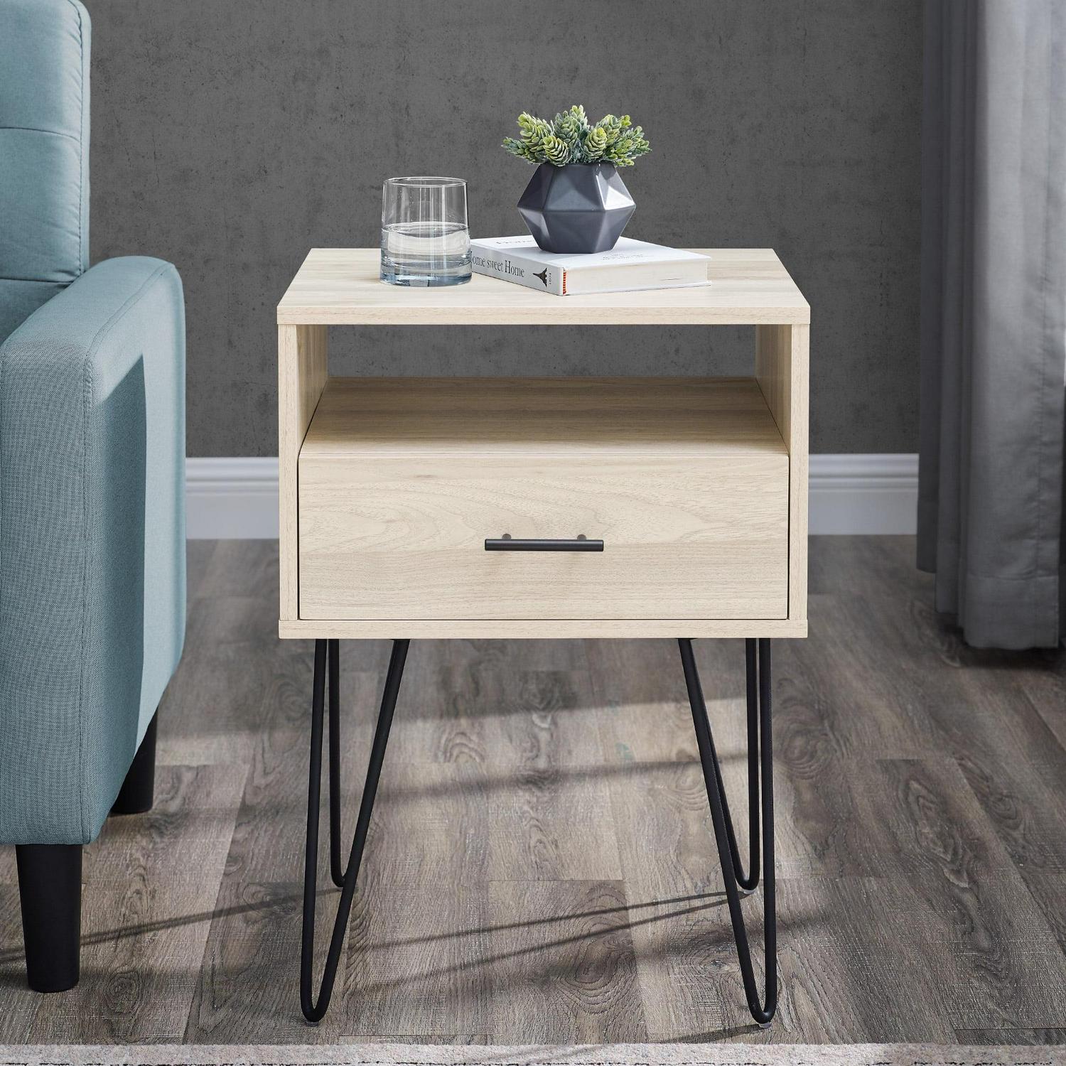 Keep your living room contemporary with this single drawer hairpin leg end table. It has a convenient combination of open and closed storage, so you can choose what level of access you want your room essentials to have. The drawer has metal glides for easy opening, so hiding away your prized possessions is a simple task. On top of multiple storage options, this modern end table also has a rich sense of character with its sleek metal hairpin legs. Place in your living room to channel retro vibes during every gathering of friends or family.