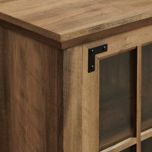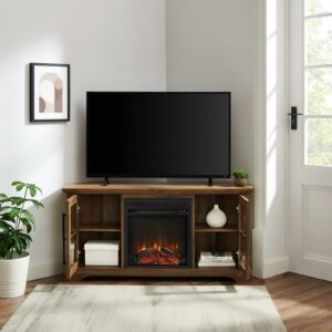 Introduce the perfect entertaining solution to your home with the Manor Park 54 Modern Rustic Electric Fireplace Corner TV Stand. This TV stand features an electric fireplace unit that can be used with or without heat, so you can enjoy the cozy ambiance of a fire even on warm days. The glass doors are windowpane style for a classic look, and two adjustable shelves provide a customized storage solution for your media equipment. This piece is designed to fit into a corner of a room, making it ideal for smaller spaces.