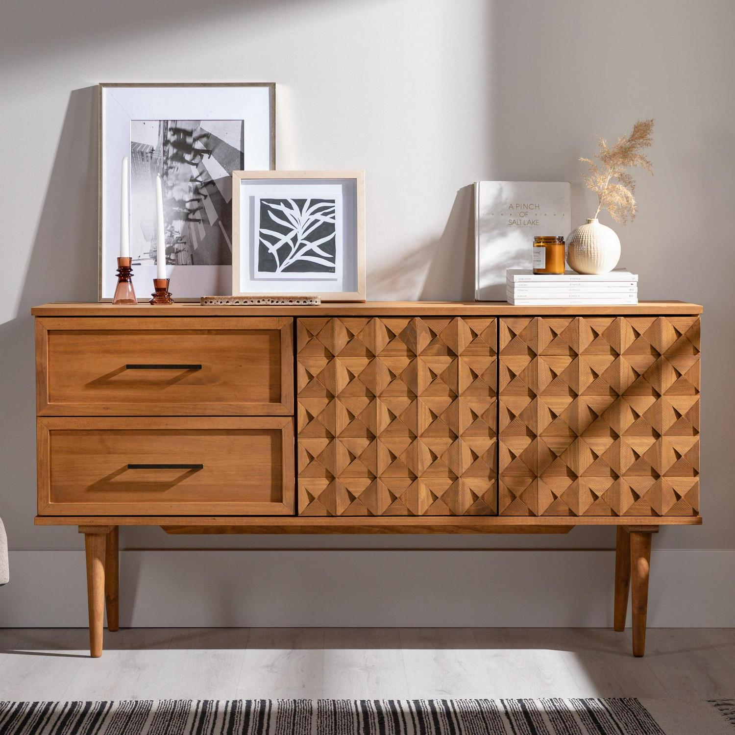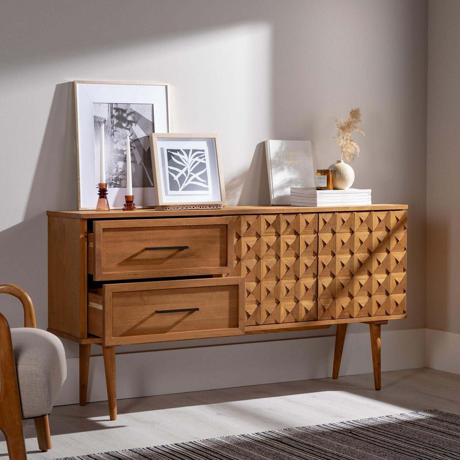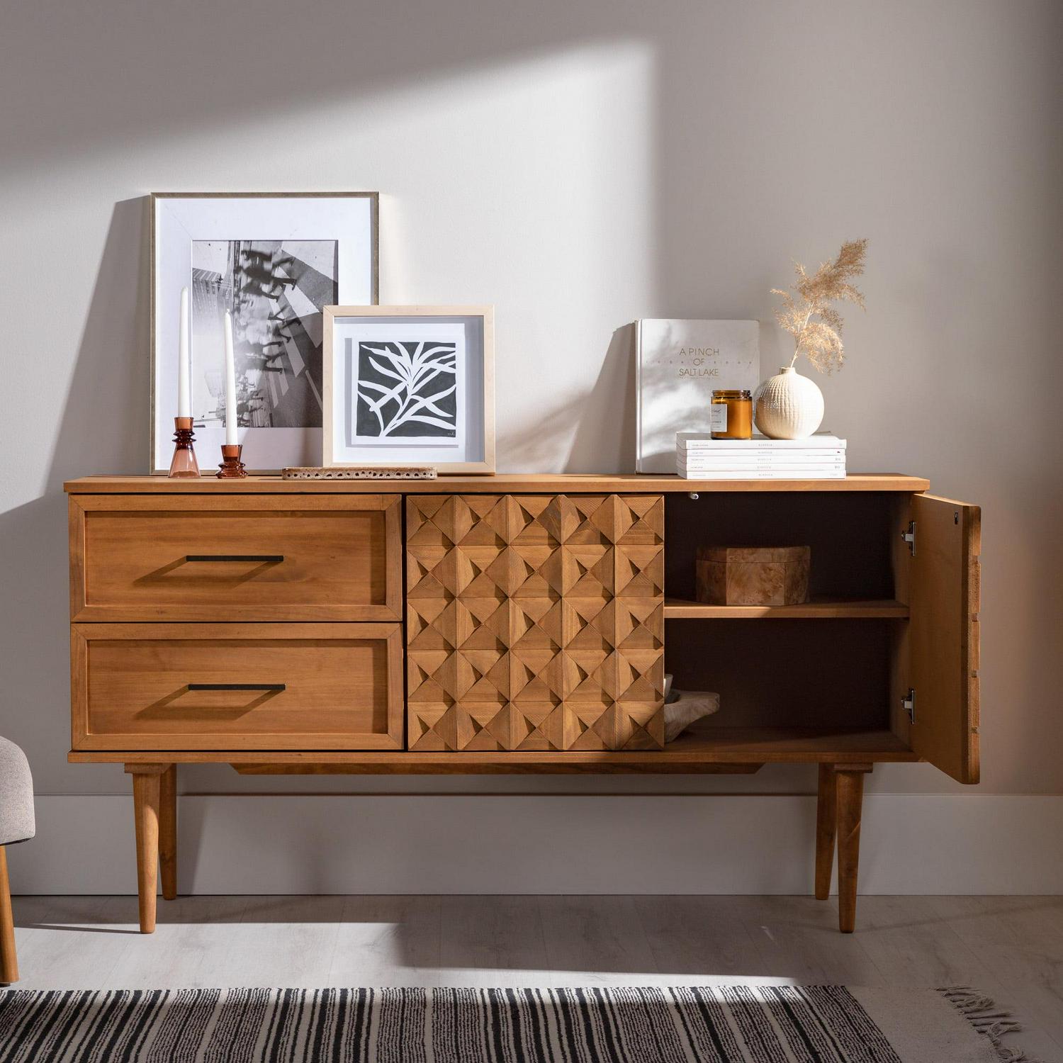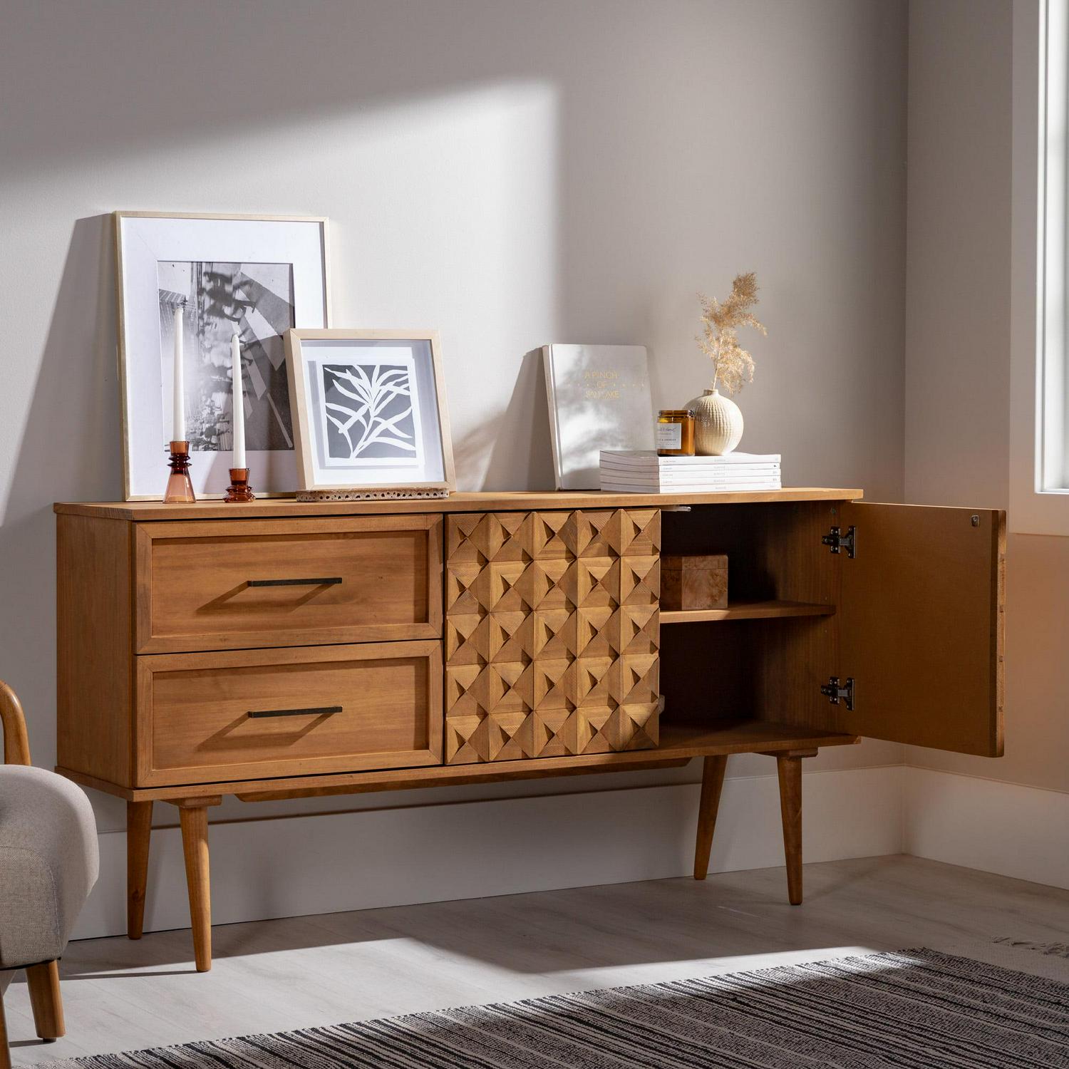 Bring some global flair into your home with the Manor Park Boho Geometric Storage Wood Sideboard. The two doors feature striking, prism detailing for an eclectic look that elevates the living room, home office, or dining room. Take advantage of the closed storage options with the two drawers on wood runners. One adjustable shelf provides customizable storage for media components or board games. The solid pine wood is responsibly harvested from renewable forests, so you can feel good about this sustainable purchase.