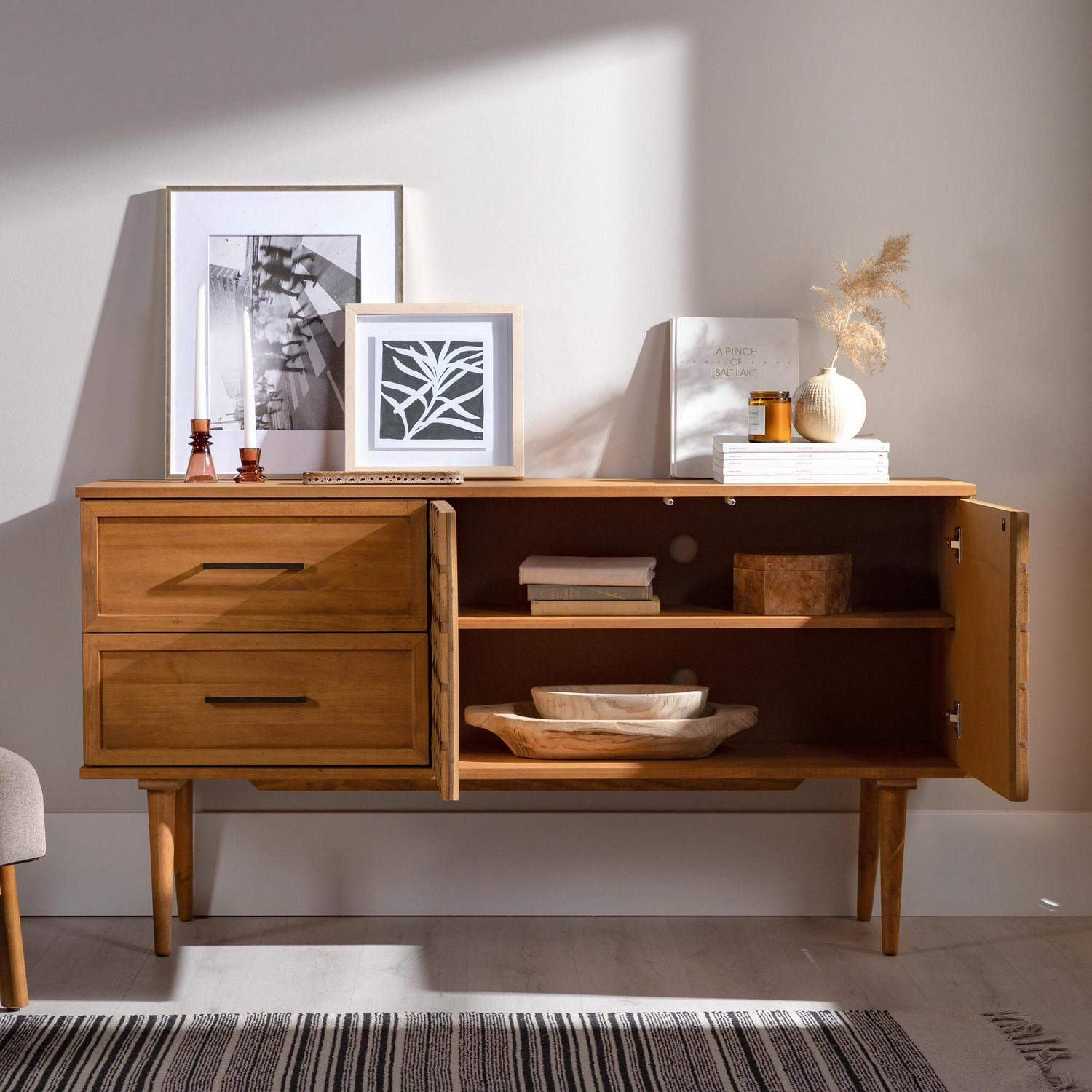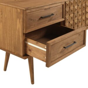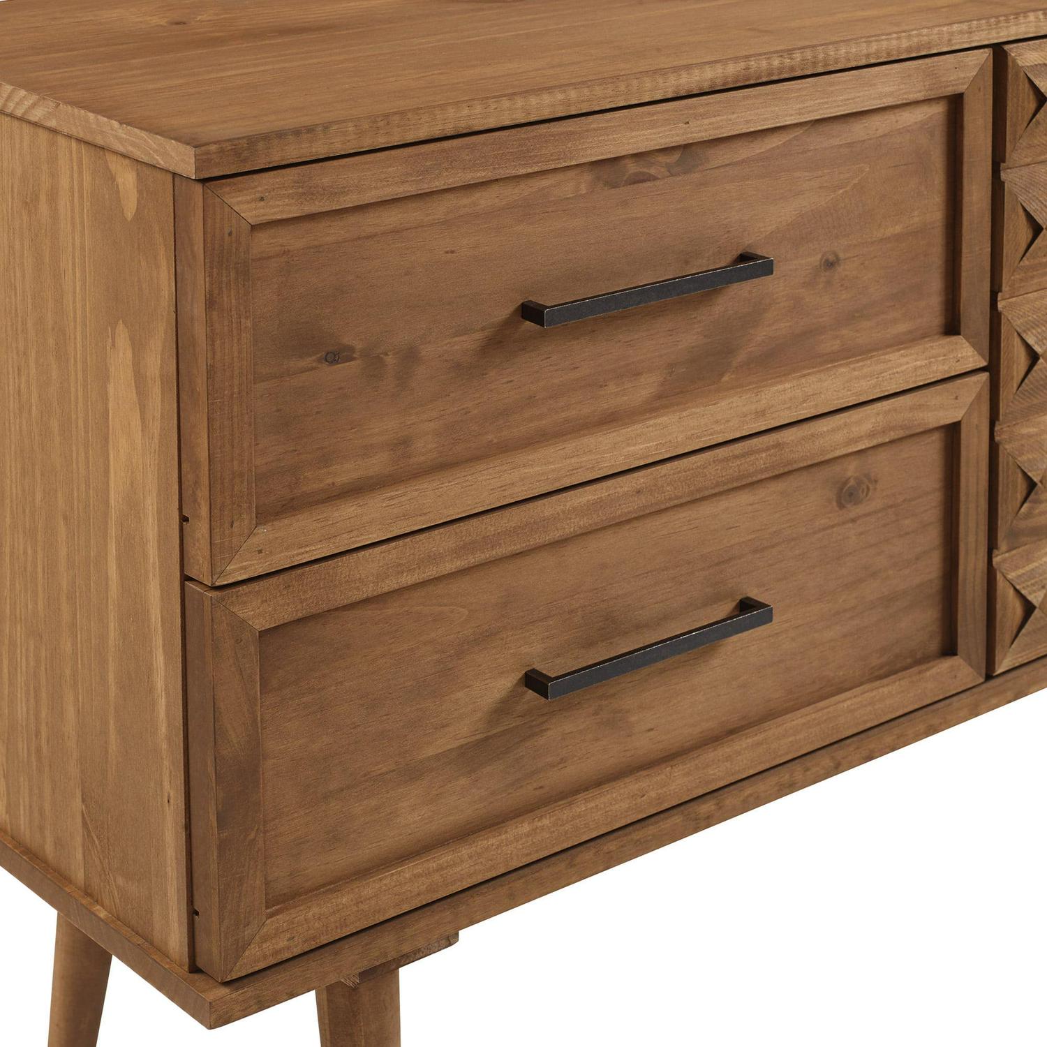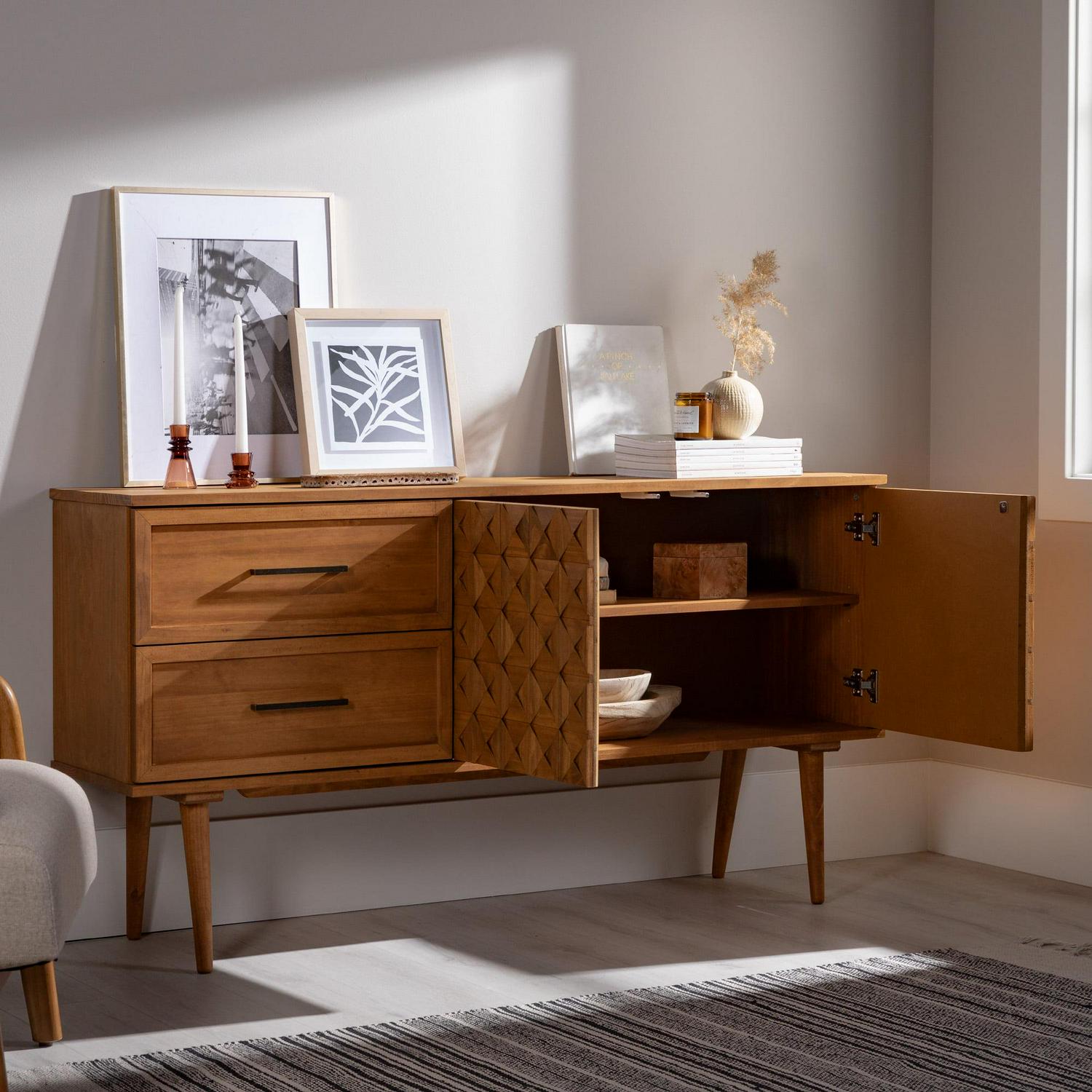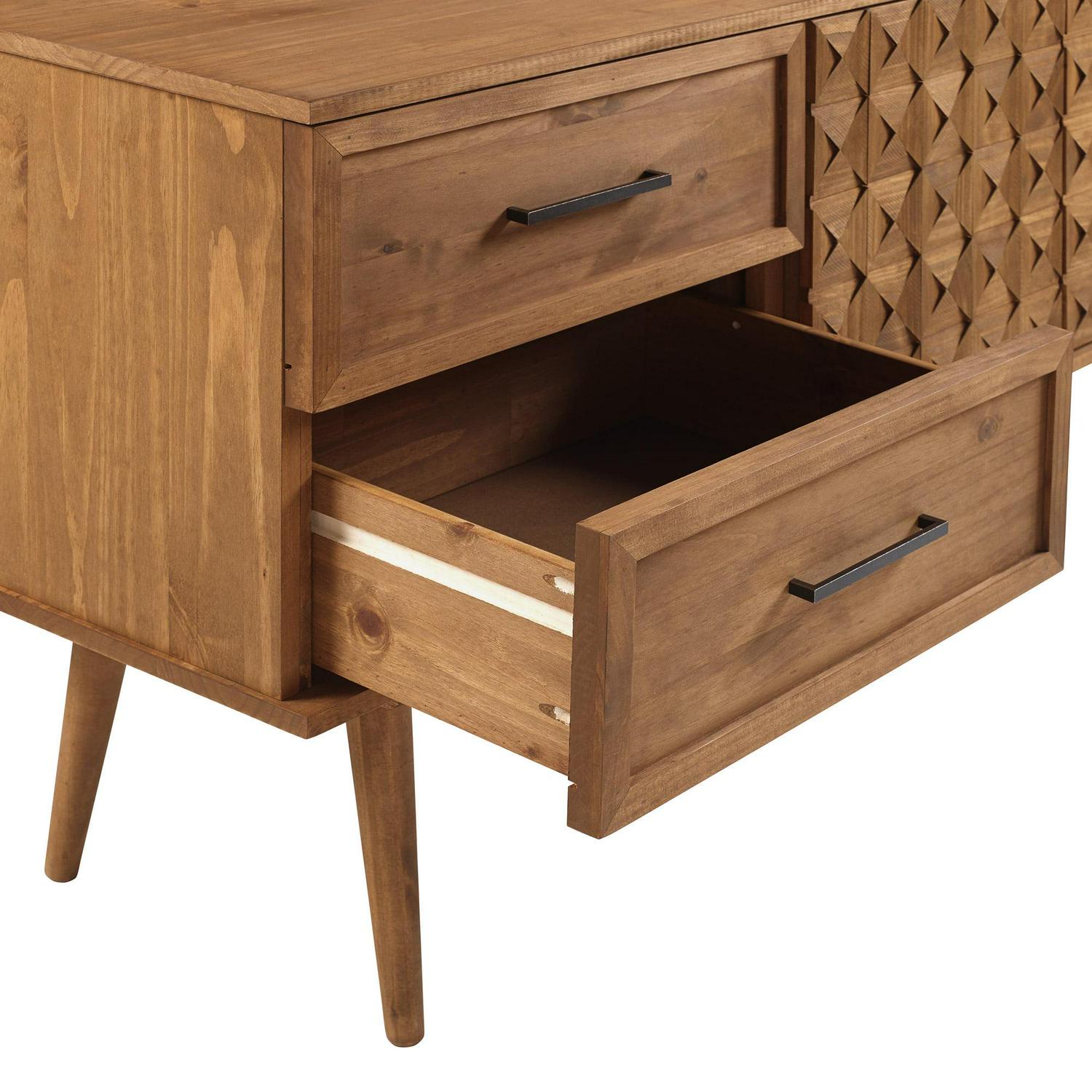 Bring some global flair into your home with the Manor Park Boho Geometric Storage Wood Sideboard. The two doors feature striking, prism detailing for an eclectic look that elevates the living room, home office, or dining room. Take advantage of the closed storage options with the two drawers on wood runners. One adjustable shelf provides customizable storage for media components or board games. The solid pine wood is responsibly harvested from renewable forests, so you can feel good about this sustainable purchase.