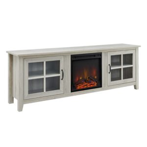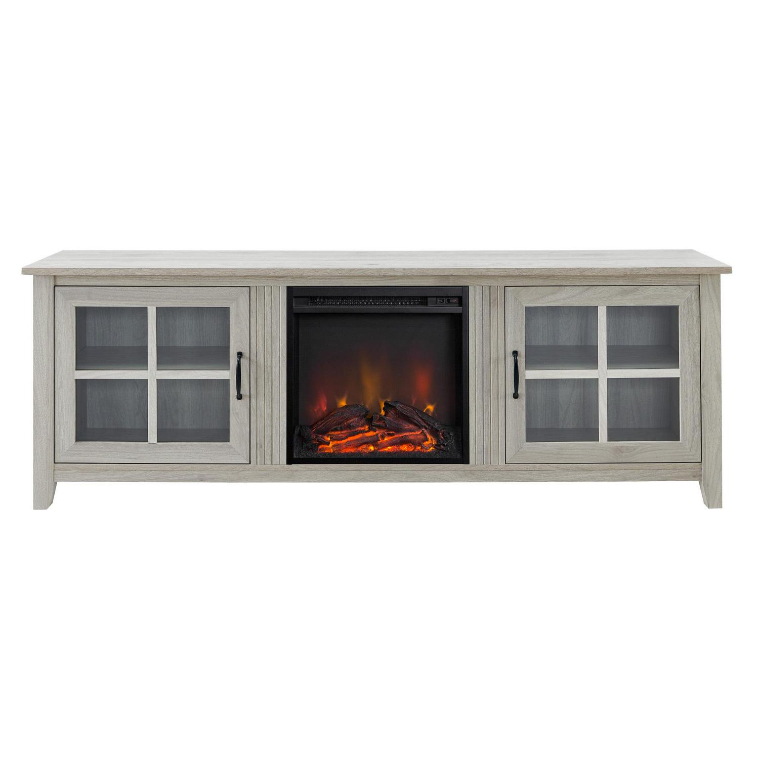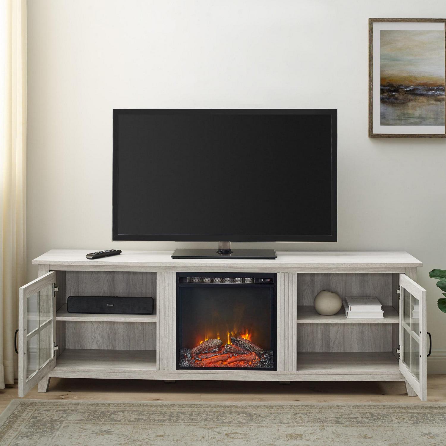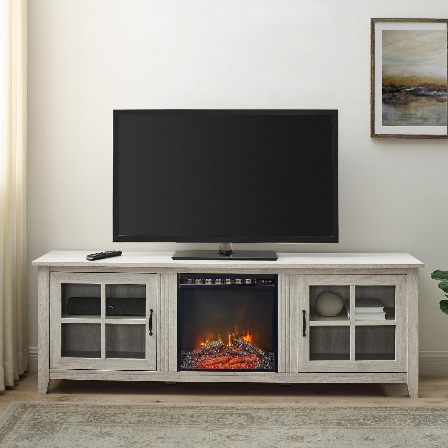 Style your home office or living room with country charm using the Manor Park Farmhouse 2 Door Electric Fireplace TV Stand. Displaying your favorite books or movie collection is easy with the windowpane-inspired doors. The 18-inch fireplace features two switches, one for LED flames and one for heat so you can enjoy the unit all year round. The six-foot cable and universal plug-in ensures that setup is easy and you ll be enjoying a warm ambiance in your home soon after arrival.