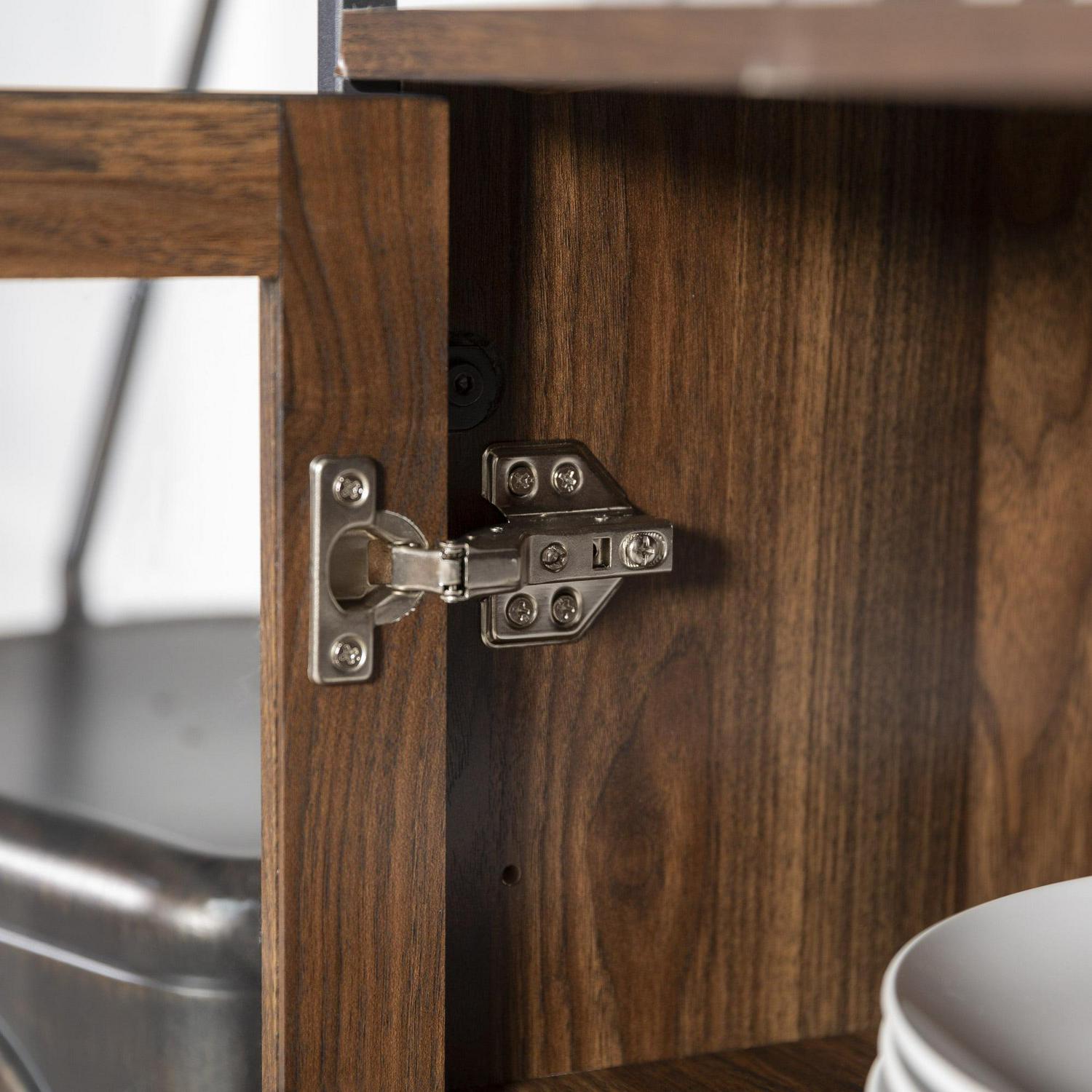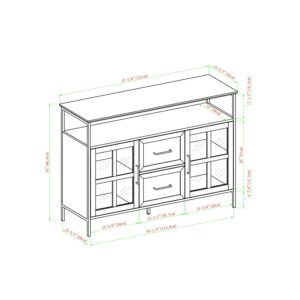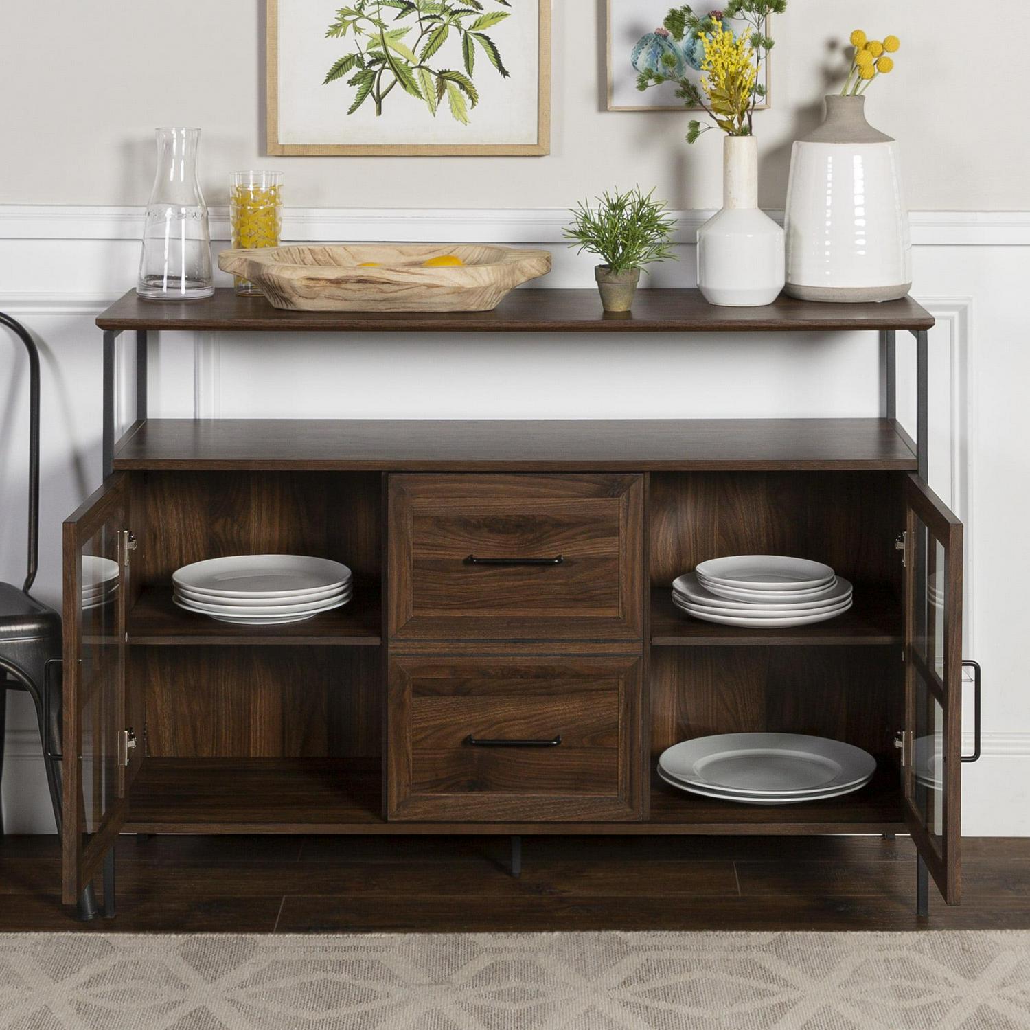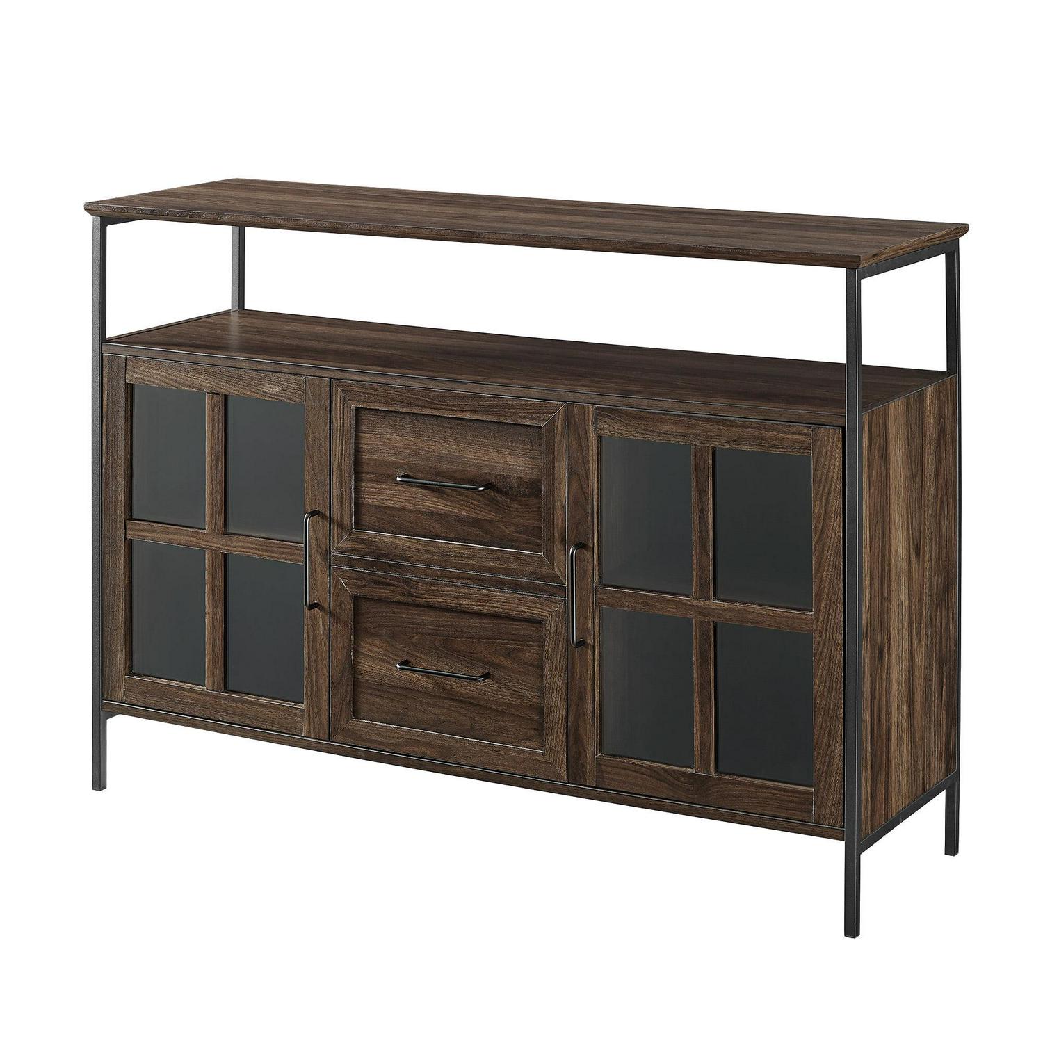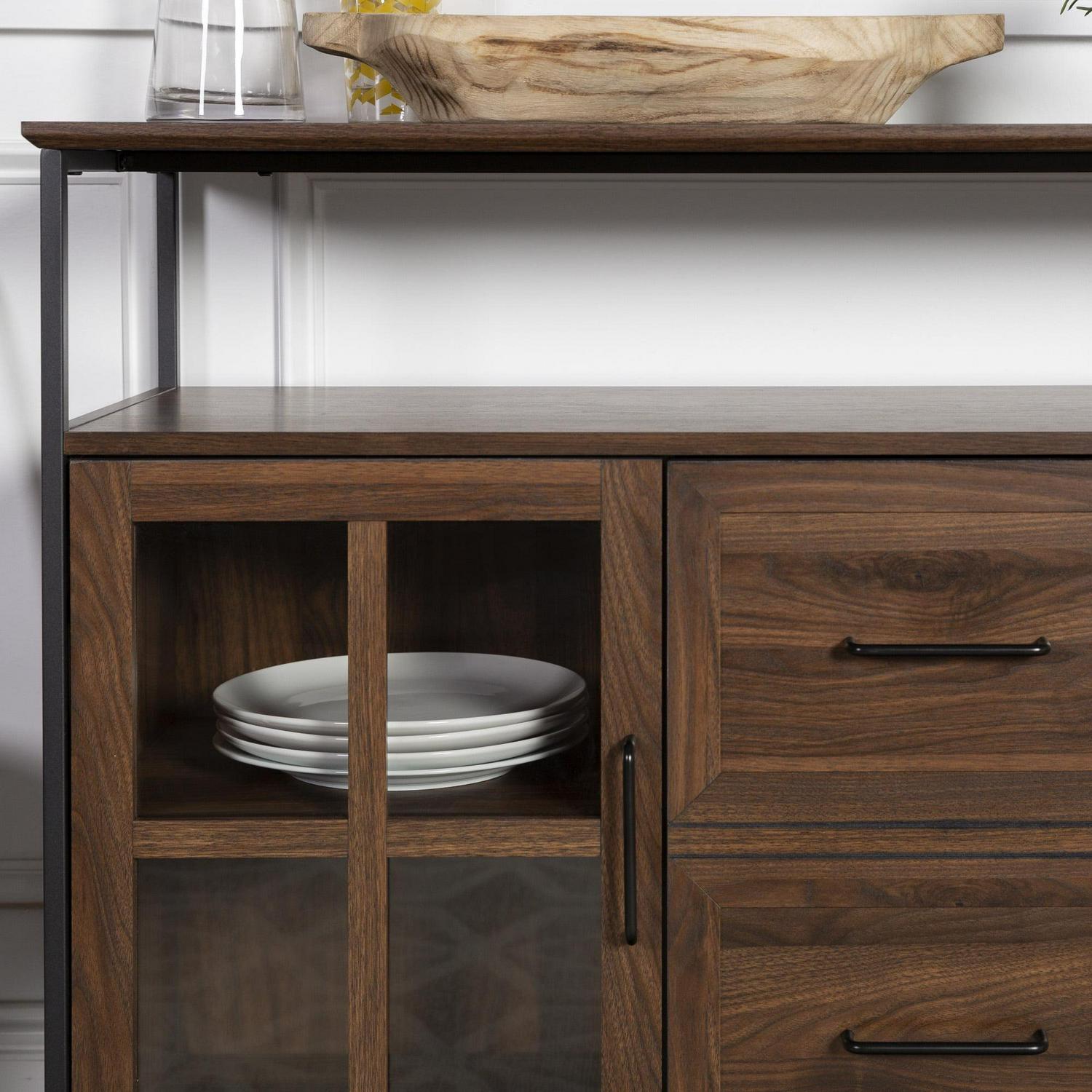 Open up your design possibilities with this three-door metal and wood buffet. The subtle mix of materials in this sideboard creates an industrial and gender-neutral look that can be used in a variety of rooms. There are three doors with soft close hinges on the bottom of the unit, two of which feature a classic fretwork design on tempered glass, while the door in the middle has a faux drawer facade. Behind the doors are adjustable shelves. The open section between the lower half of the unit and the top shelf also makes this piece functional as an entertainment center where it can accommodate TVs up to 52-inches.