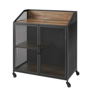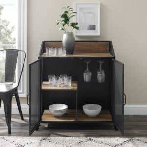Create your one-stop entertaining center with this industrial bar cabinet by Manor Park. With a protective tabletop railing, stemware racks, one fixed shelf, and a bottom shelf area, you will have all of the storage space for bottles of wine, glasses, and anything else you need to host an event on the fly. Locking caster wheels make movement from room to room simple when you need it. Two sleek metal handles exposed hinges, and metal mesh doors provide an urban silhouette that will complement every home decor style. Made from warp-resistant MDF, durable laminate, and powder-coated metal, this serving cabinet will last through every birthday bash and intimate dinner for years to come.