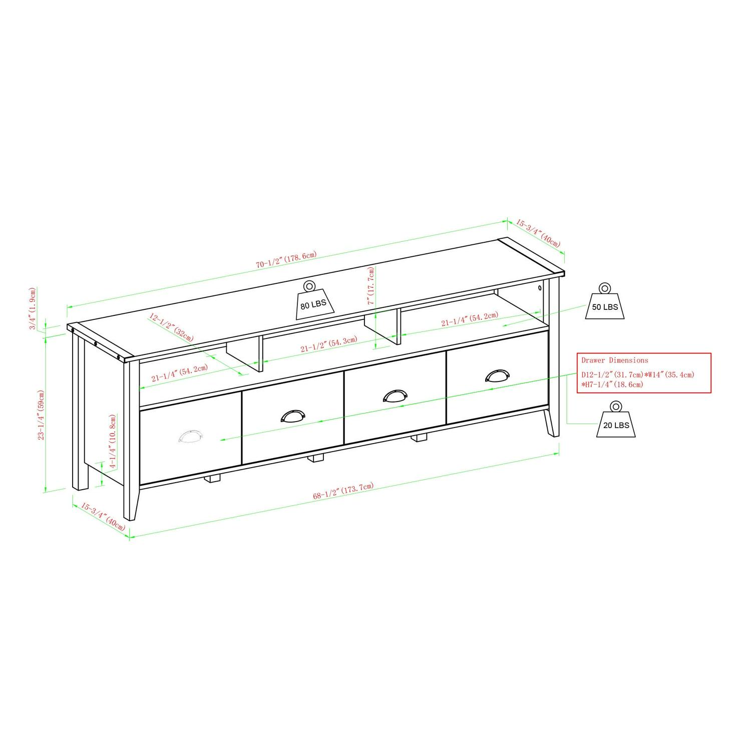 – Assembled Dimensions: 24″ H x 70″ L x 15.75″ W