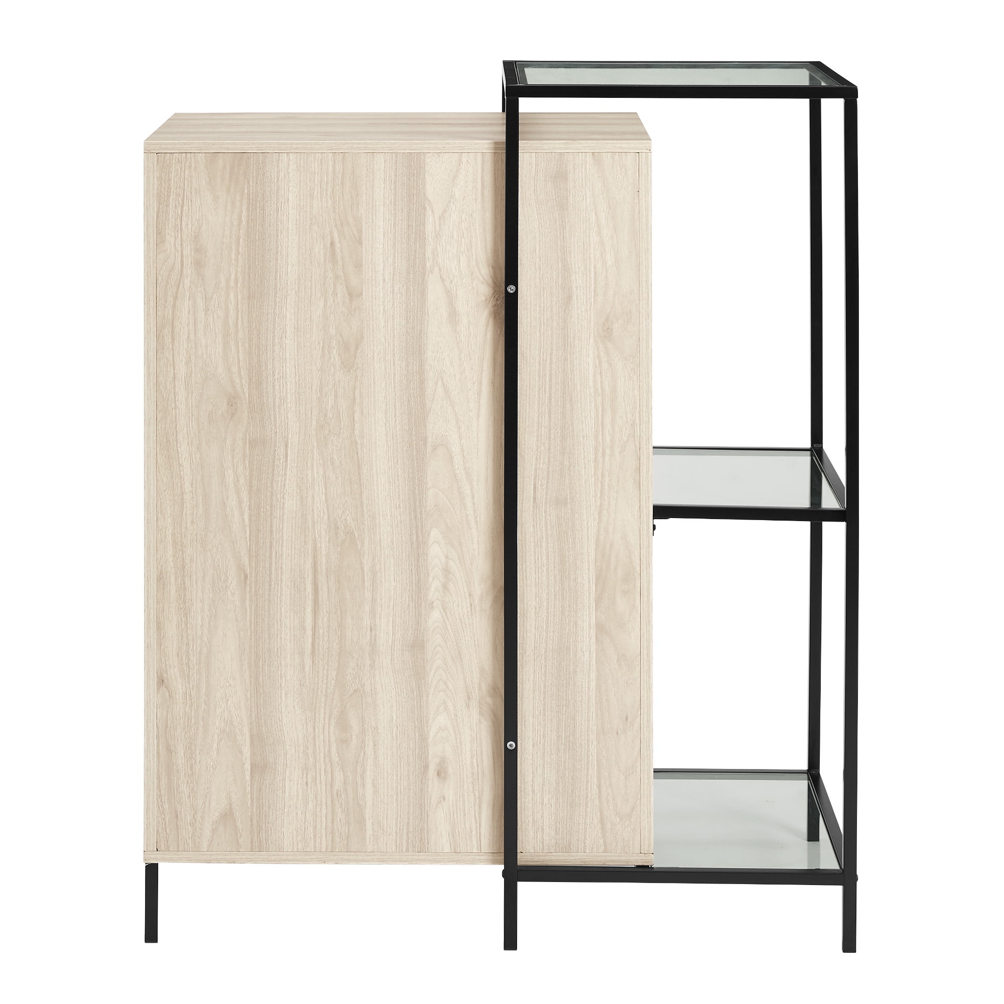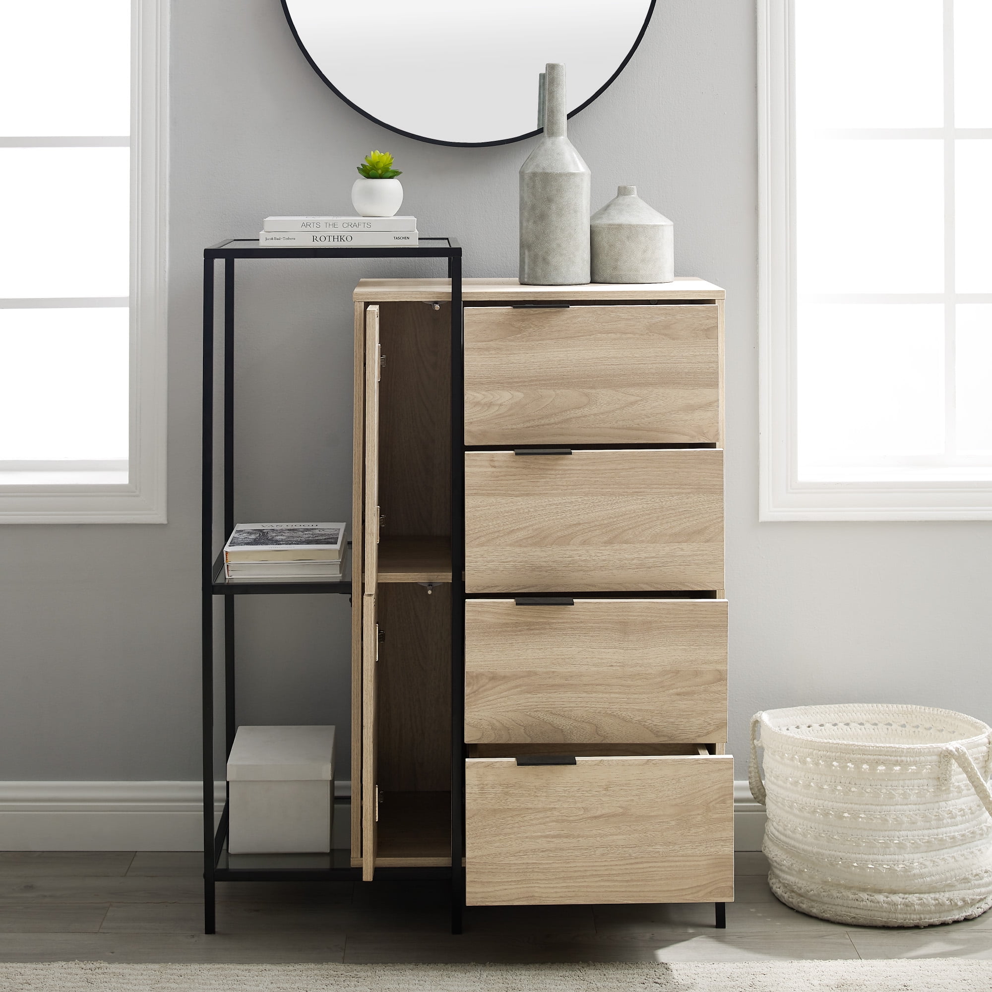 The Manor Park Modern Asymmetric Metal and Wood Accent Chest completes your eclectic storage needs. The unique frame adds a contemporary feel to any room with the half-metal, half-wood build. Place family photos or souvenirs on the three glass shelves for a cool vibe in your home office or living room. Tuck clutter out of sight within the four drawers and hide books or magazines within the two doors. Each features a push-close mechanism to keep the door tightly closed. The warp-resistant MDF wood, durable laminate, and powder-coated steel build provide a long-lasting piece that you can rely on through many years to come.