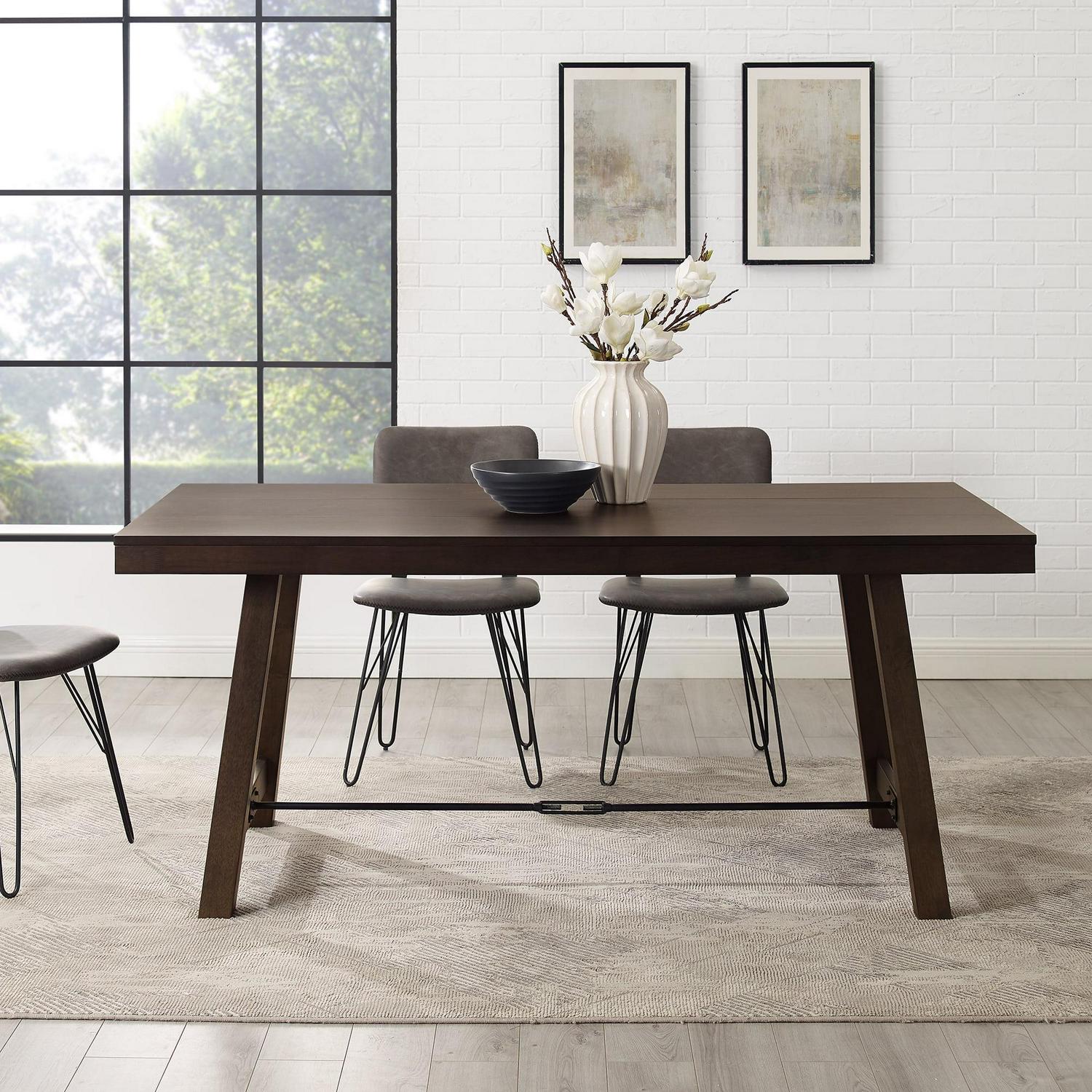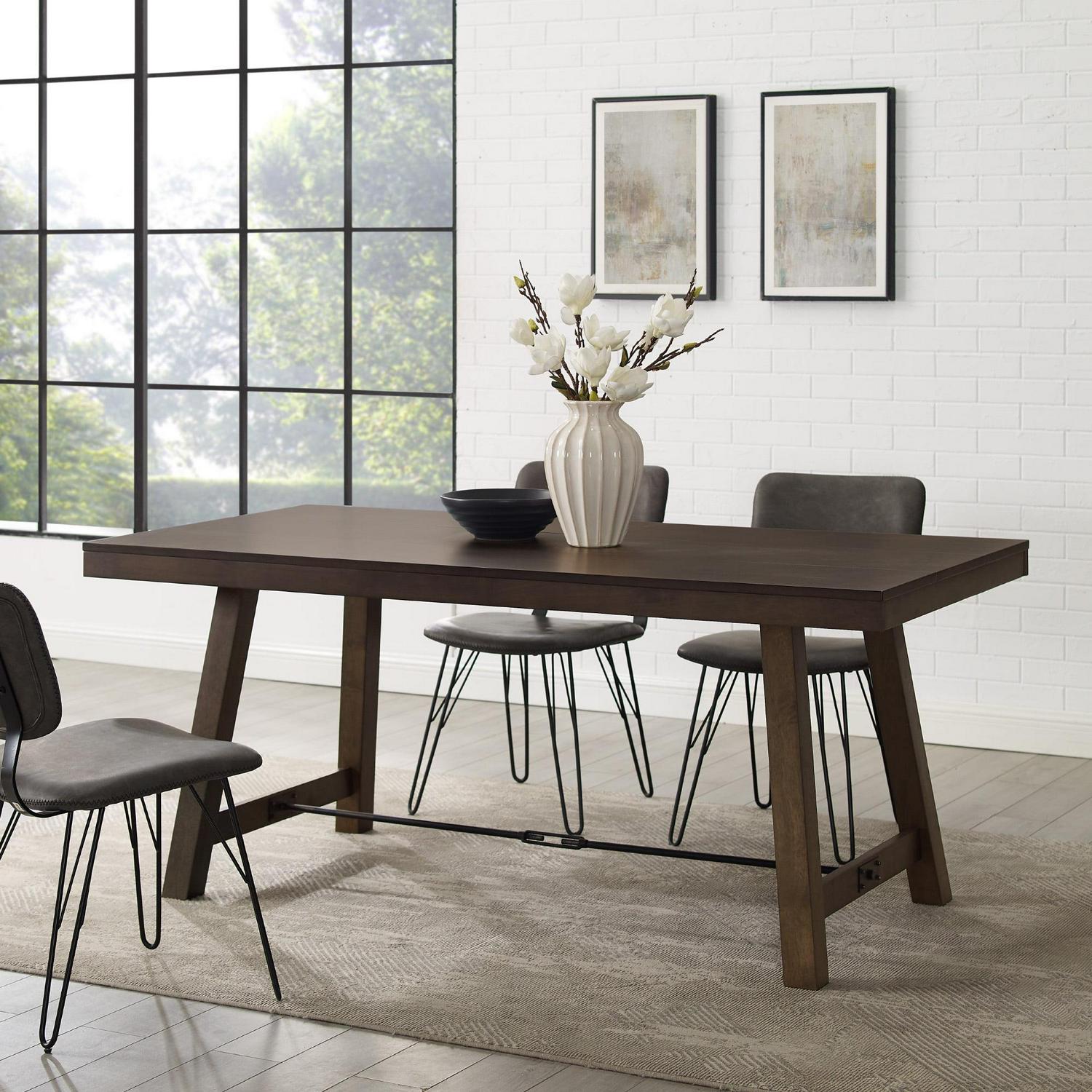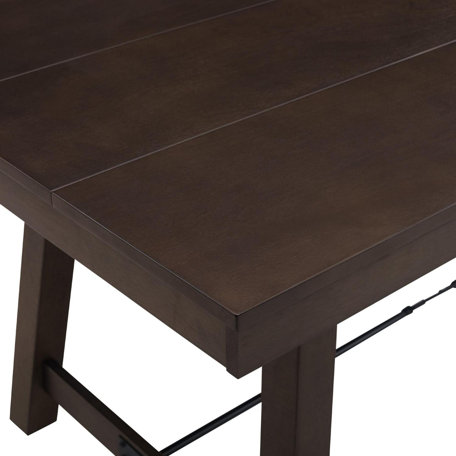 Plan for perfect dinner parties or game nights around the Manor Park Modern Farmhouse Dining Table with Metal Stretcher. Your country-inspired kitchen or dining room will be complemented by the rich veneer finish and metal stretcher underneath the table. Gather up to four people around the sturdy frame to enjoy time together in your home. Rustic angled legs and the natural finish offer the ultimate entertainment space. The warp-resistant MDF wood build creates a durable dining table you can trust. Place your favorite chairs around the rectangle tabletop for a cozy, comfortable space that all your friends and family will enjoy.