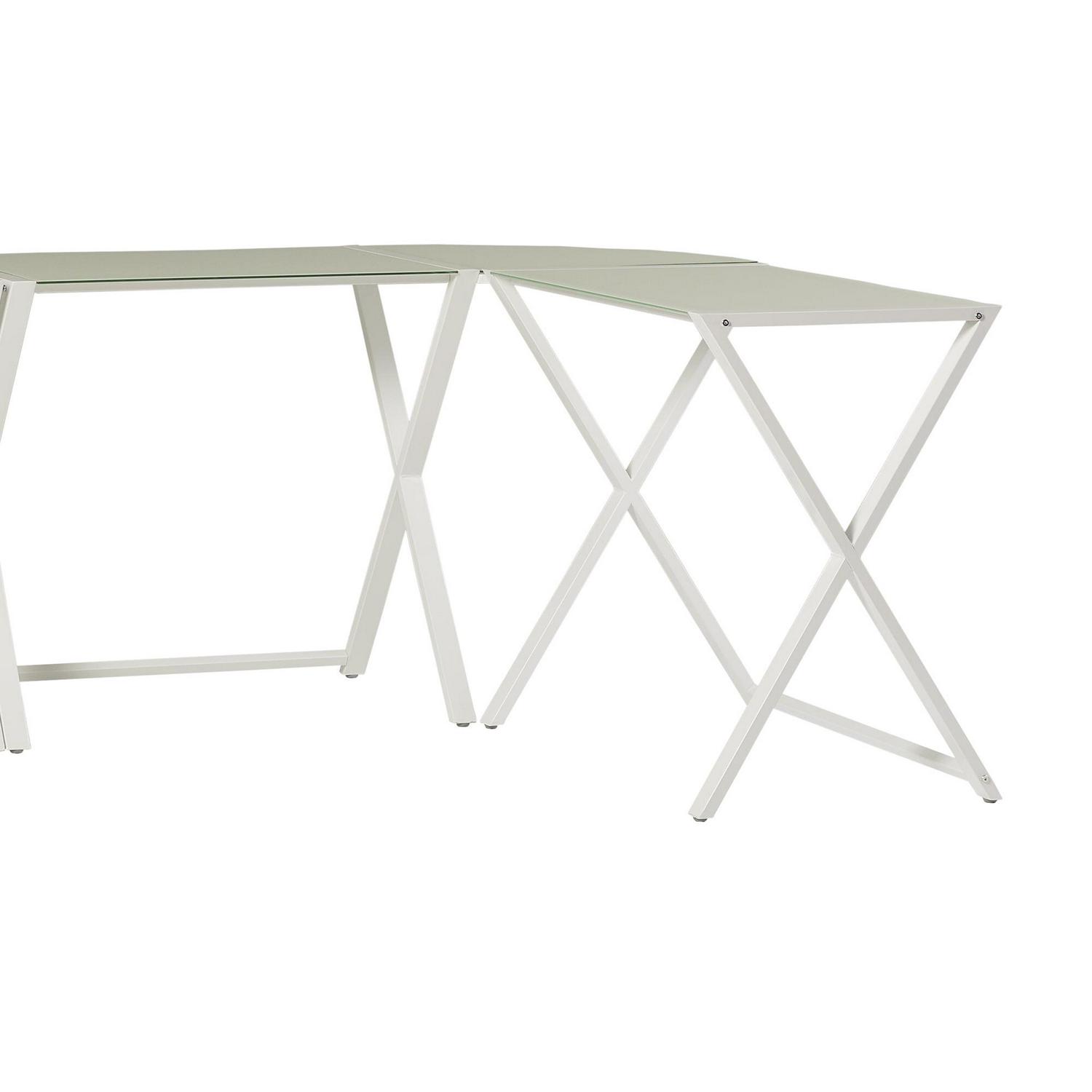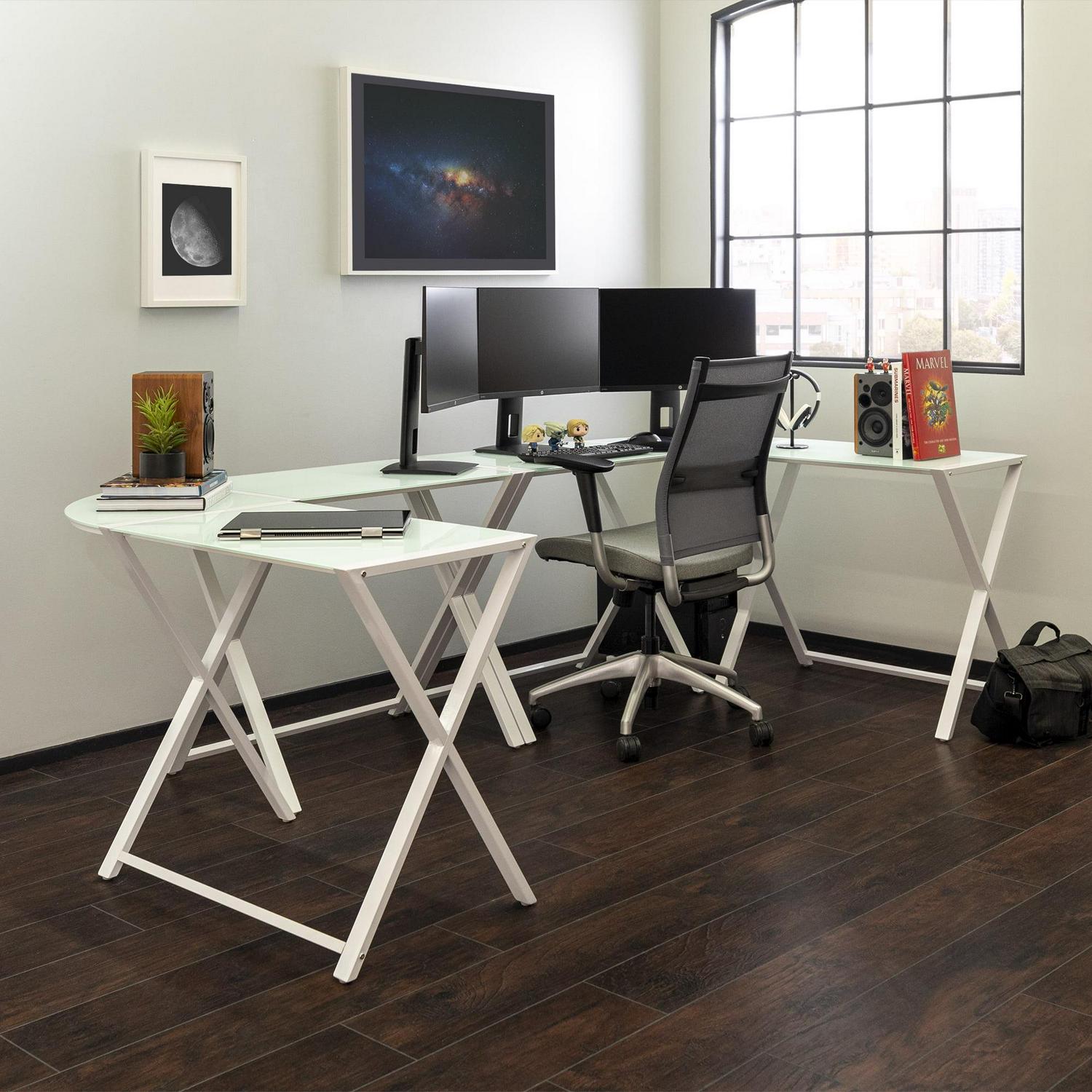 Whether looking for the perfect gaming station or remote workspace, the Manor Park Modern Gaming Corner Computer Desk, Set of 2, is the package for you. With the sleek, X-frame design and versatile tabletop, this contemporary desk is perfect for your favorite techy. The L-shaped frame provides versatility to fit in any room when put in the corner or creating a private workspace. Push the desks together for the ultimate work setup. The sturdy, angled metal legs and tempered safety glass tabletop provide a transitional style that matches any home design.