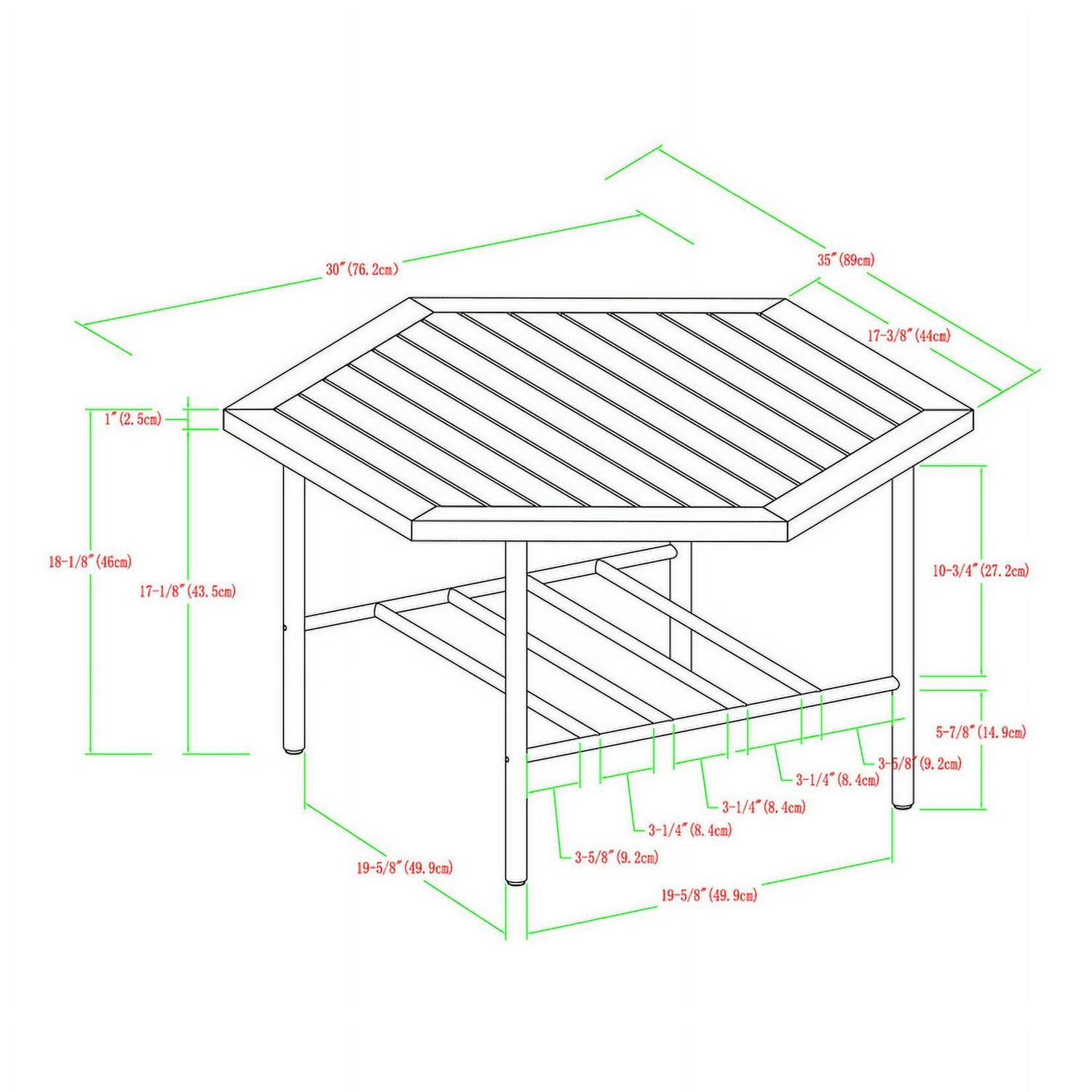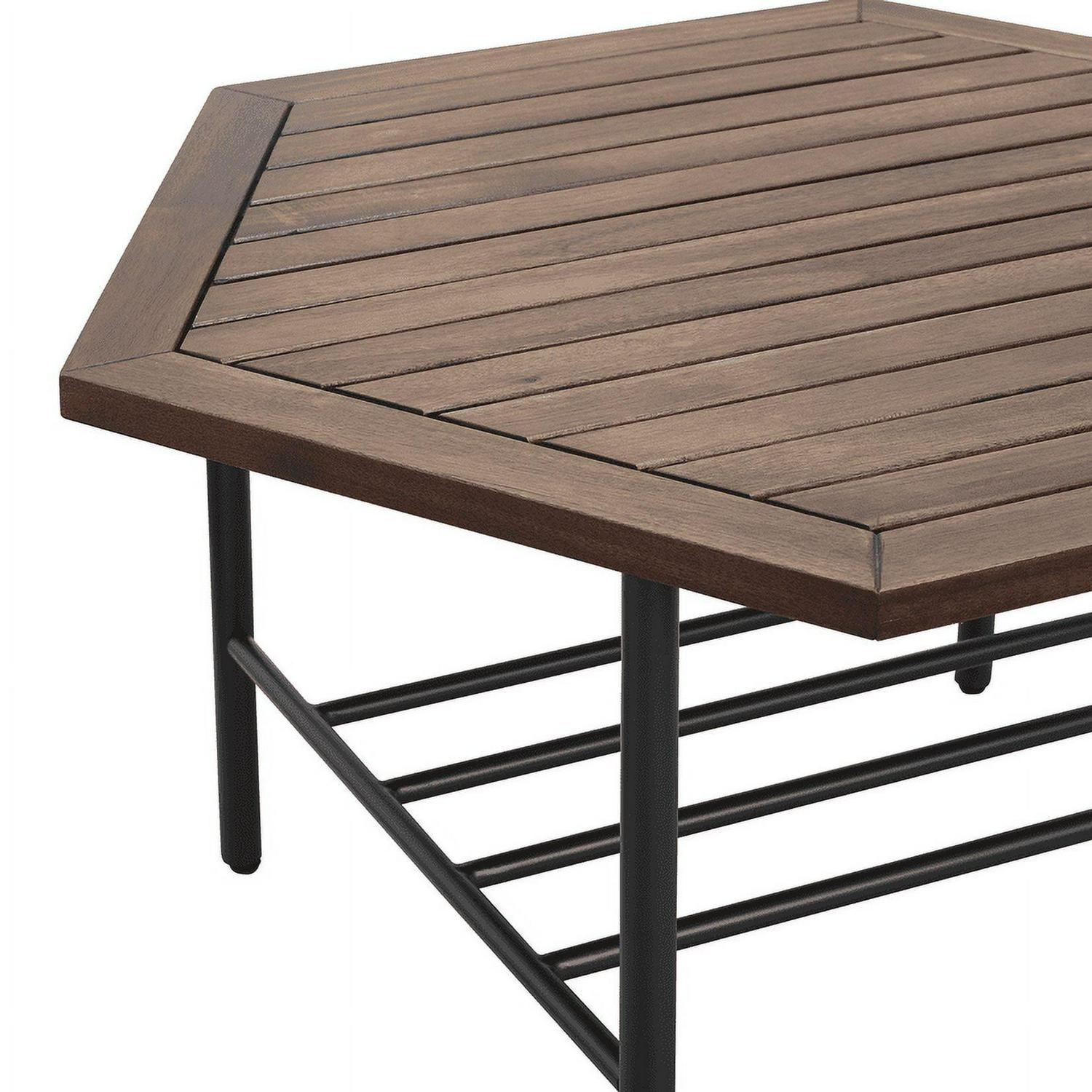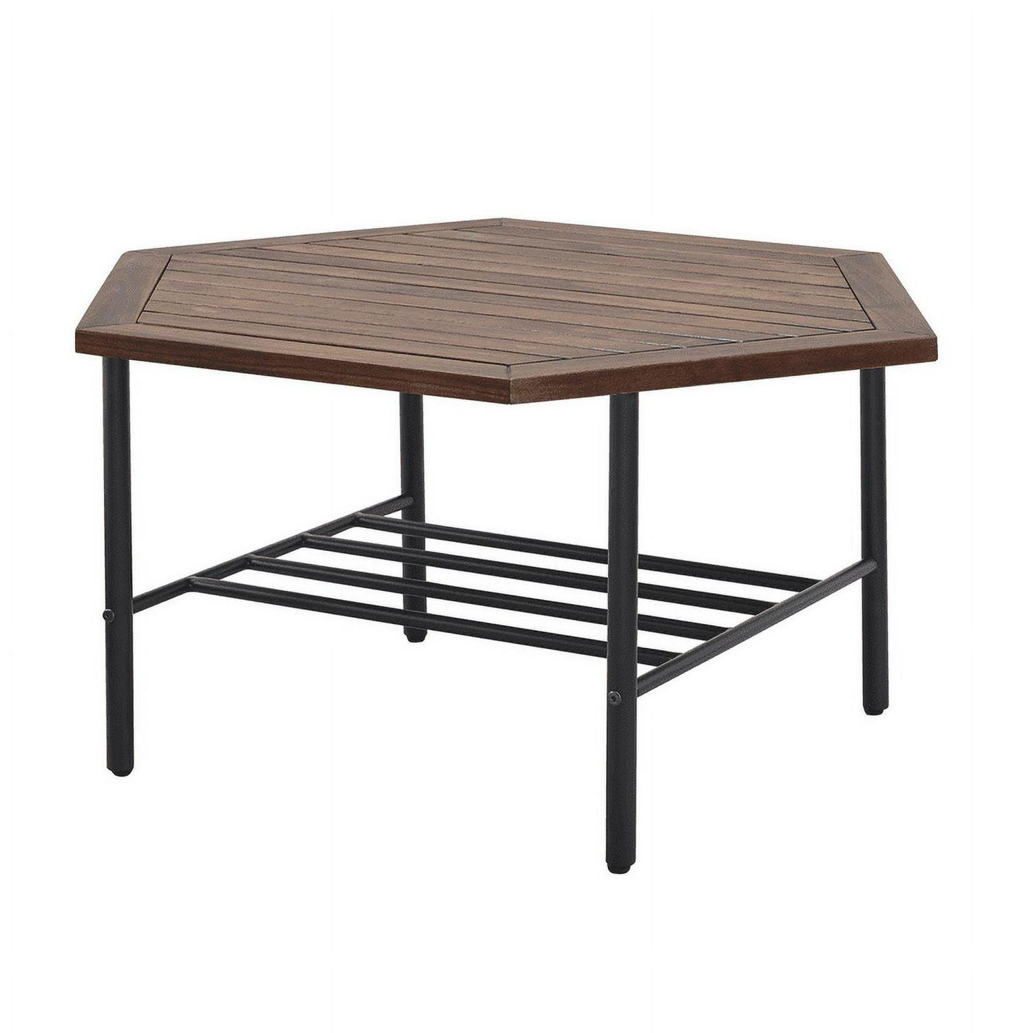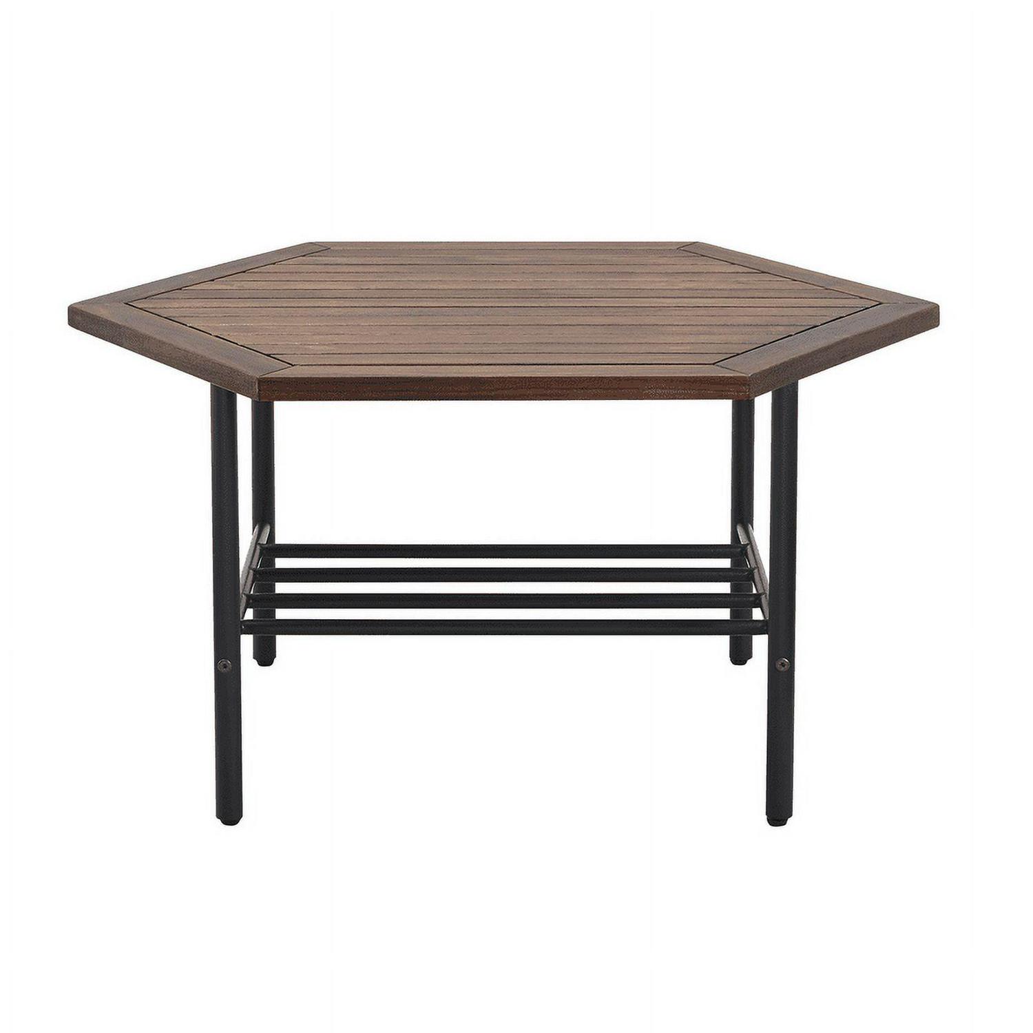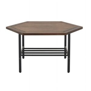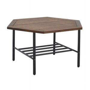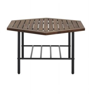 Enjoy cold beverages and your favorite snacks during a warm summer afternoon on your patio using this Manor Park Modern Acacia Wood Hexagon Outdoor Patio Coffee Table. The contemporary hexagon shape and plank tabletop offer a trendy aesthetic to your favorite hosting spot. You can trust the durable, powder-coated steel legs and lower metal-bar shelf to hold precious outdoor accessories. And the acacia wood offers a water and UV-resistant element for a long-lasting frame that you can enjoy through many more seasons. Pair this classy backyard cocktail table with a loveseat or club chairs for a warm ambiance that all the neighbors will love.