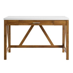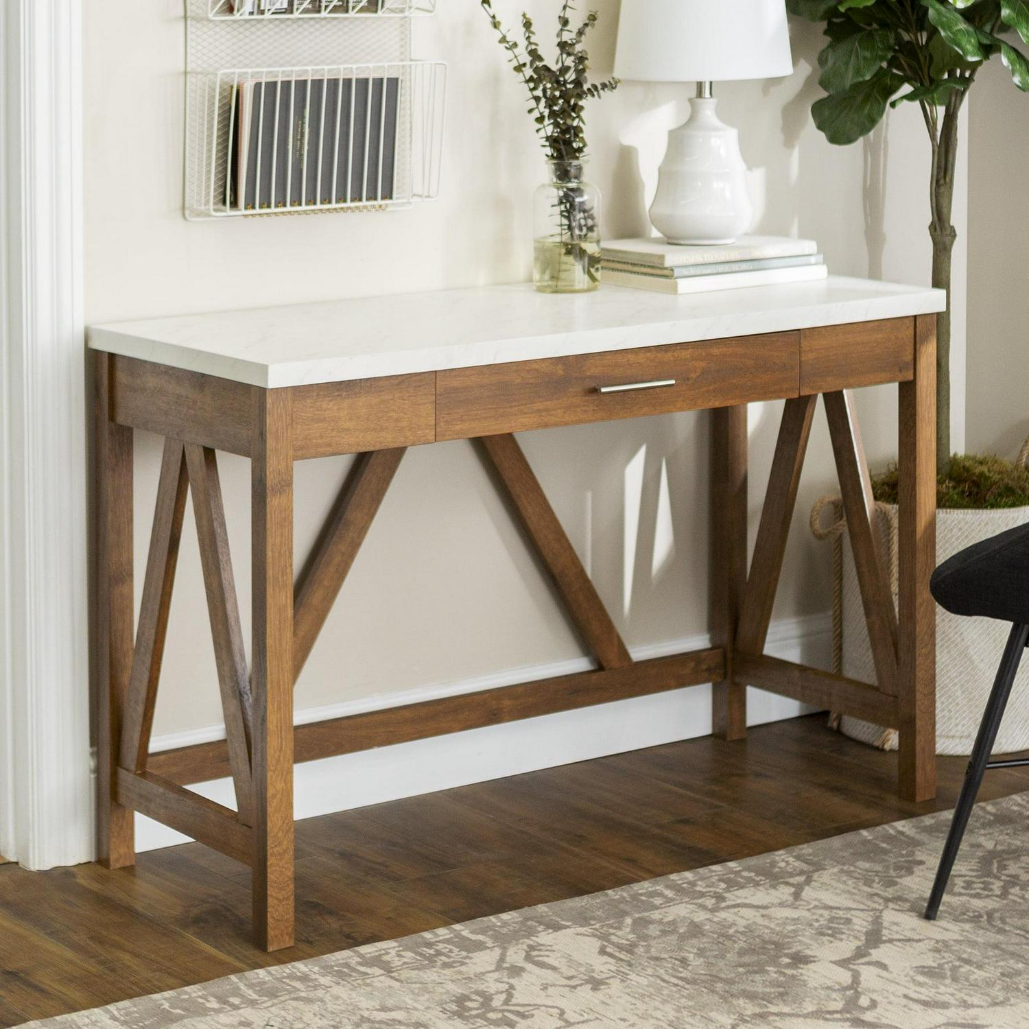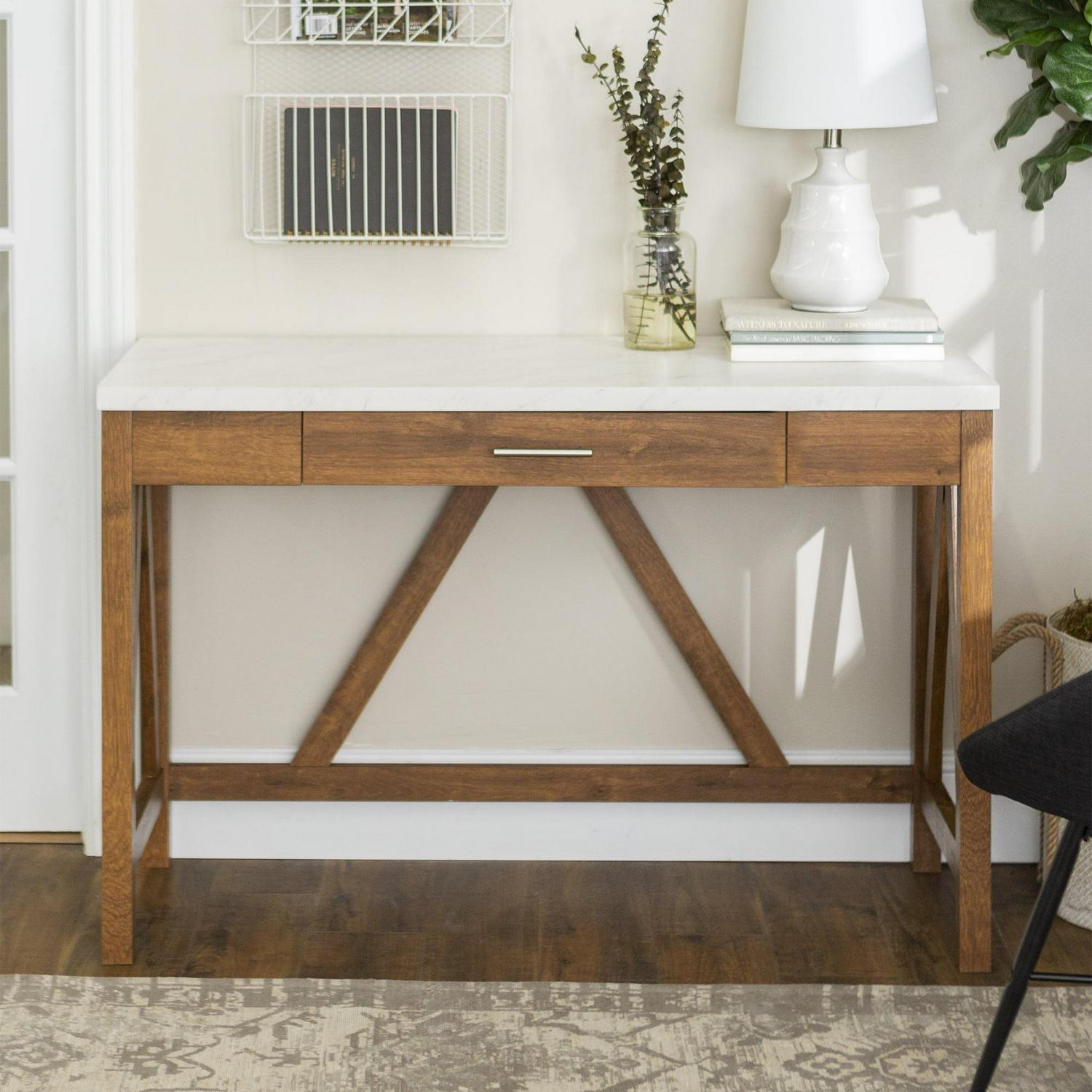 Manor Park Rustic Farmhouse Computer Writing Desk with Drawer, Natural Walnut/White Marble