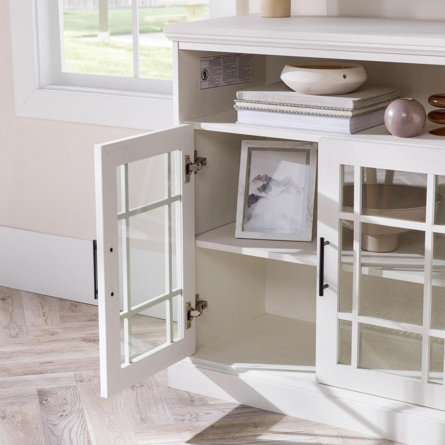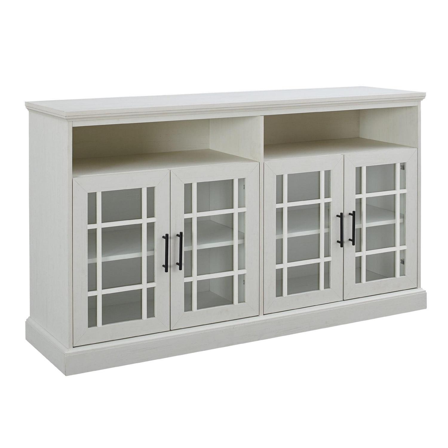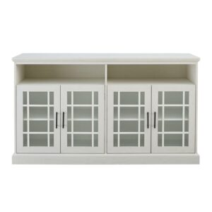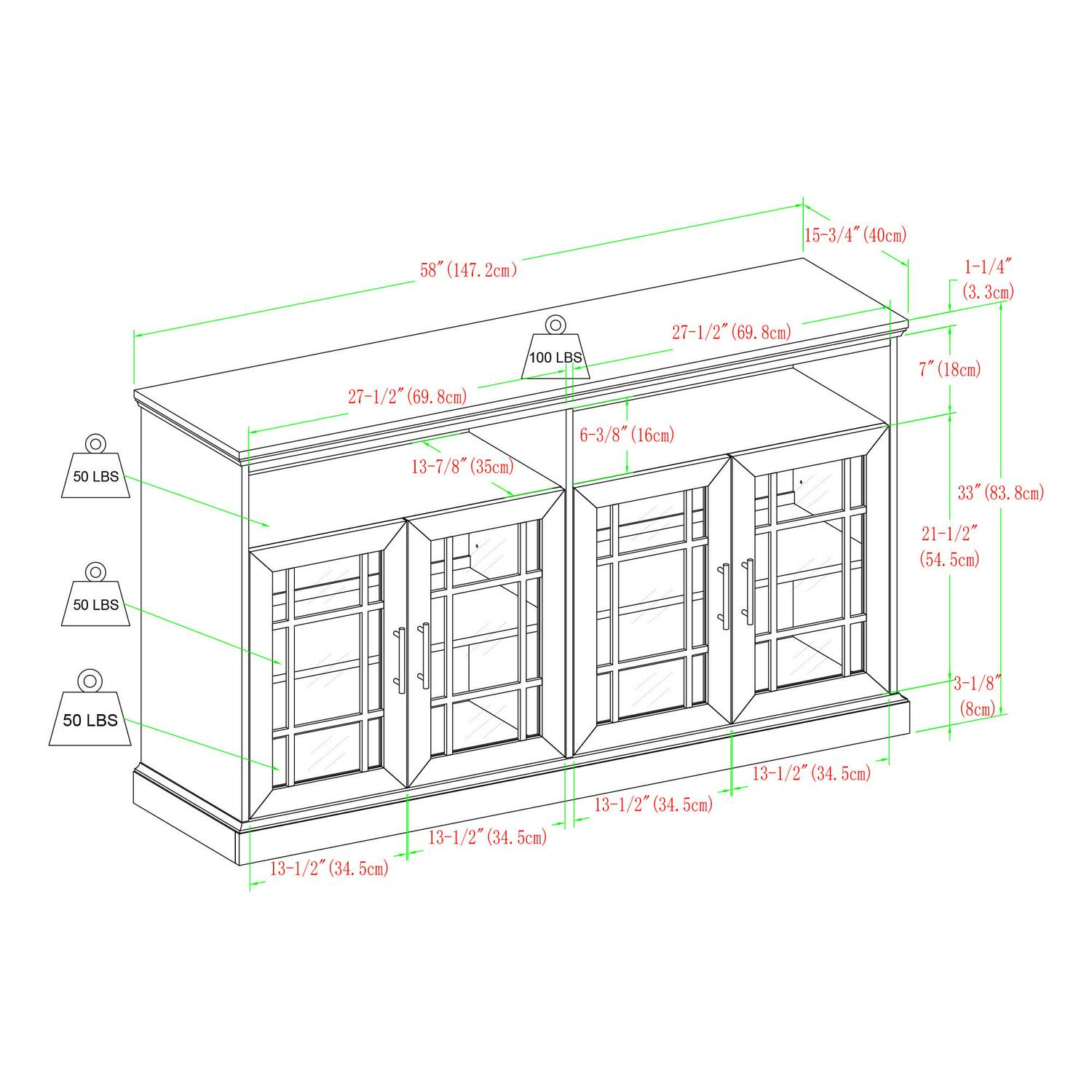 With all the flair of a traditional English manor, this sideboard maintains a stately presence without getting stuffy. This storage console can be used as a kitchen credenza where you can keep your cookbooks or party dishes, or it can be used as a TV stand. This buffet boasts a timeless fretwork pattern on the four front glass doors along with other features such as: cord management options, soft close hinges, and adjustable shelves. This stand accommodates TVs up to 65-inches.