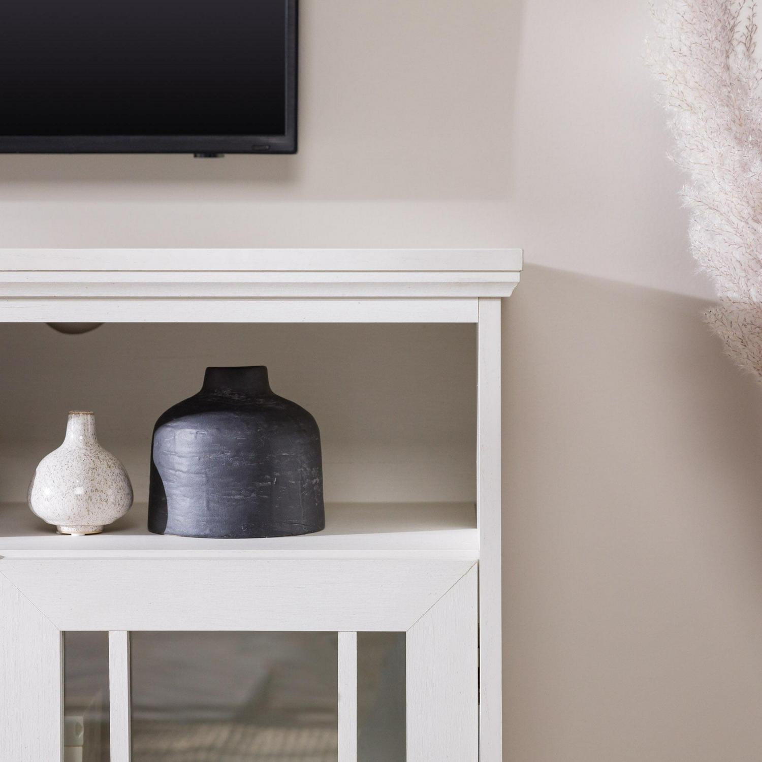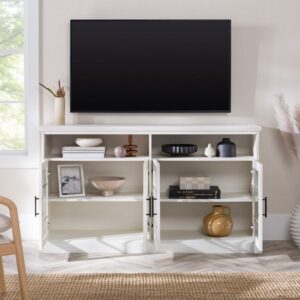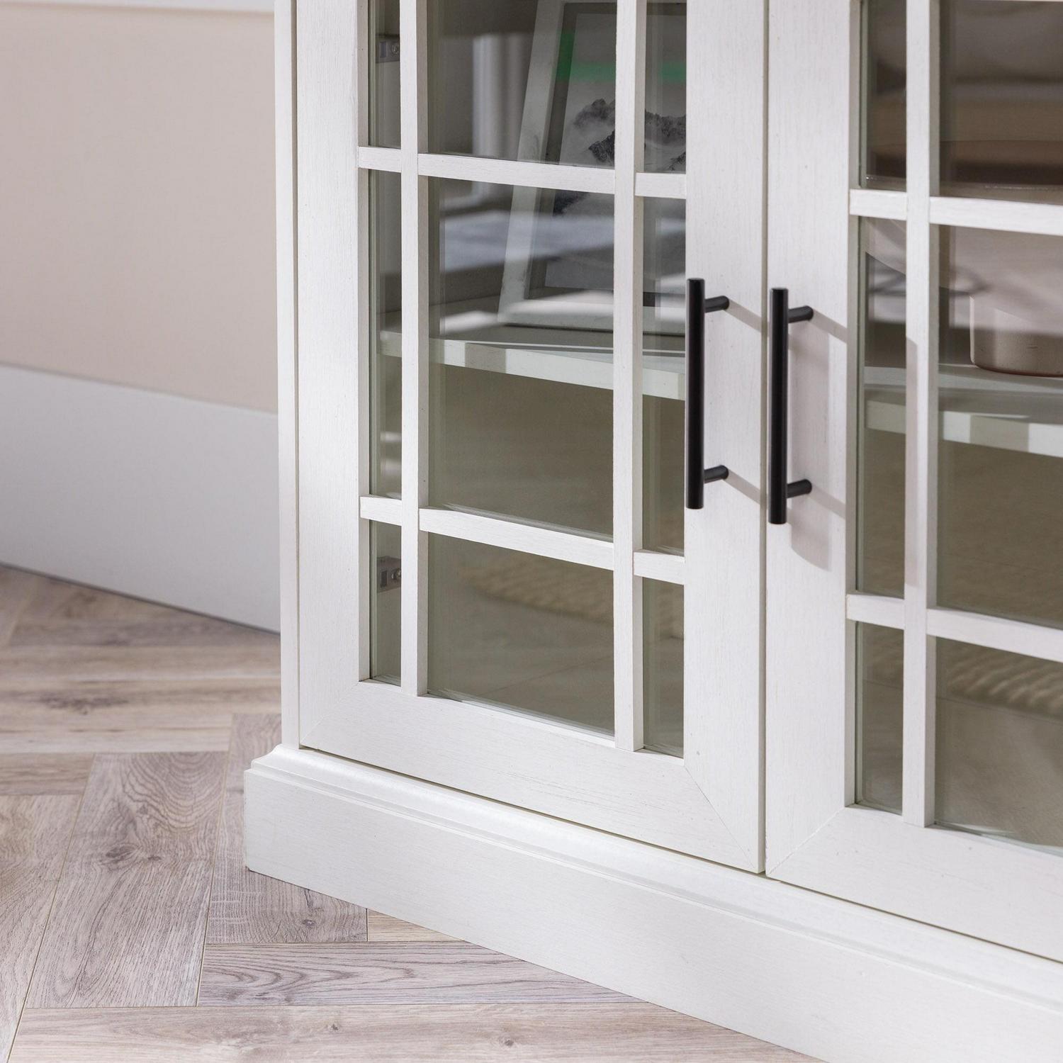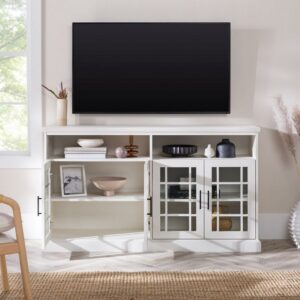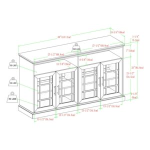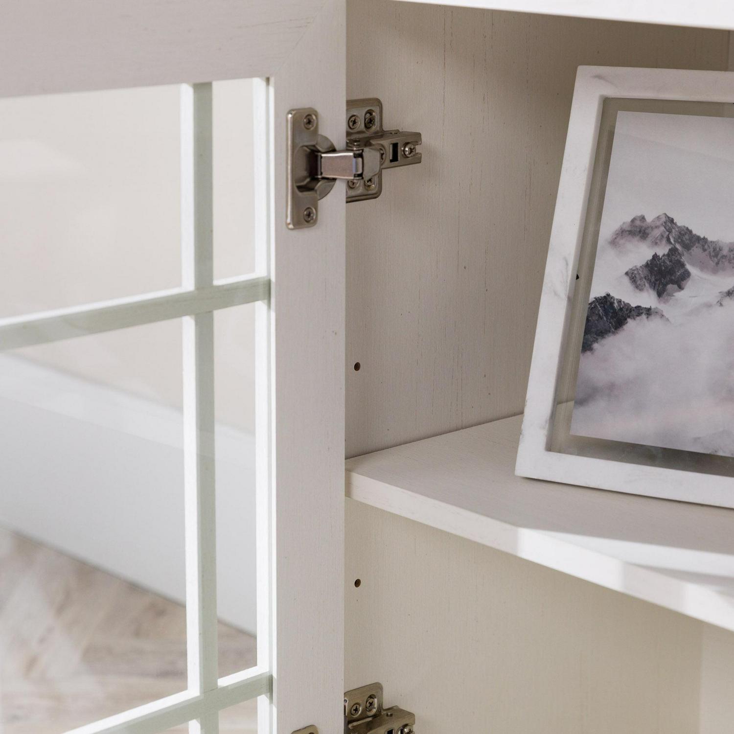 With all the flair of a traditional English manor, this sideboard maintains a stately presence without getting stuffy. This storage console can be used as a kitchen credenza where you can keep your cookbooks or party dishes, or it can be used as a TV stand. This buffet boasts a timeless fretwork pattern on the four front glass doors along with other features such as: cord management options, soft close hinges, and adjustable shelves. This stand accommodates TVs up to 65-inches.