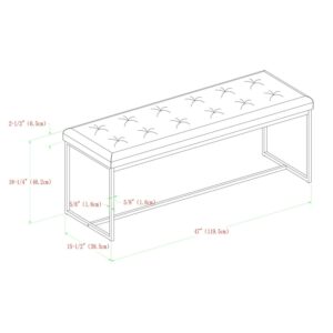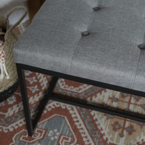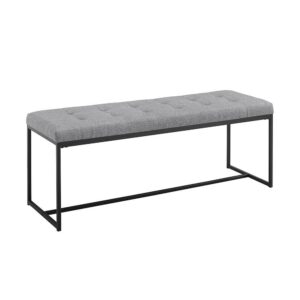 Introduce elegant simplicity in to your home with this rectangular bench by Manor Park. Open box legs provide space for books, blankets, and shoes out of walkways. A plush, tufted bench cushion offers a comfortable perch for those who have just entered the house and need to pause a moment to take off their boots. Or in your room so you can sit and read for a long period. Or in the living room during your popular game nights. No matter where you place it, the construction of powder-coated metal, linen, and foam will ensure this bench is a staple in your home for years to come.