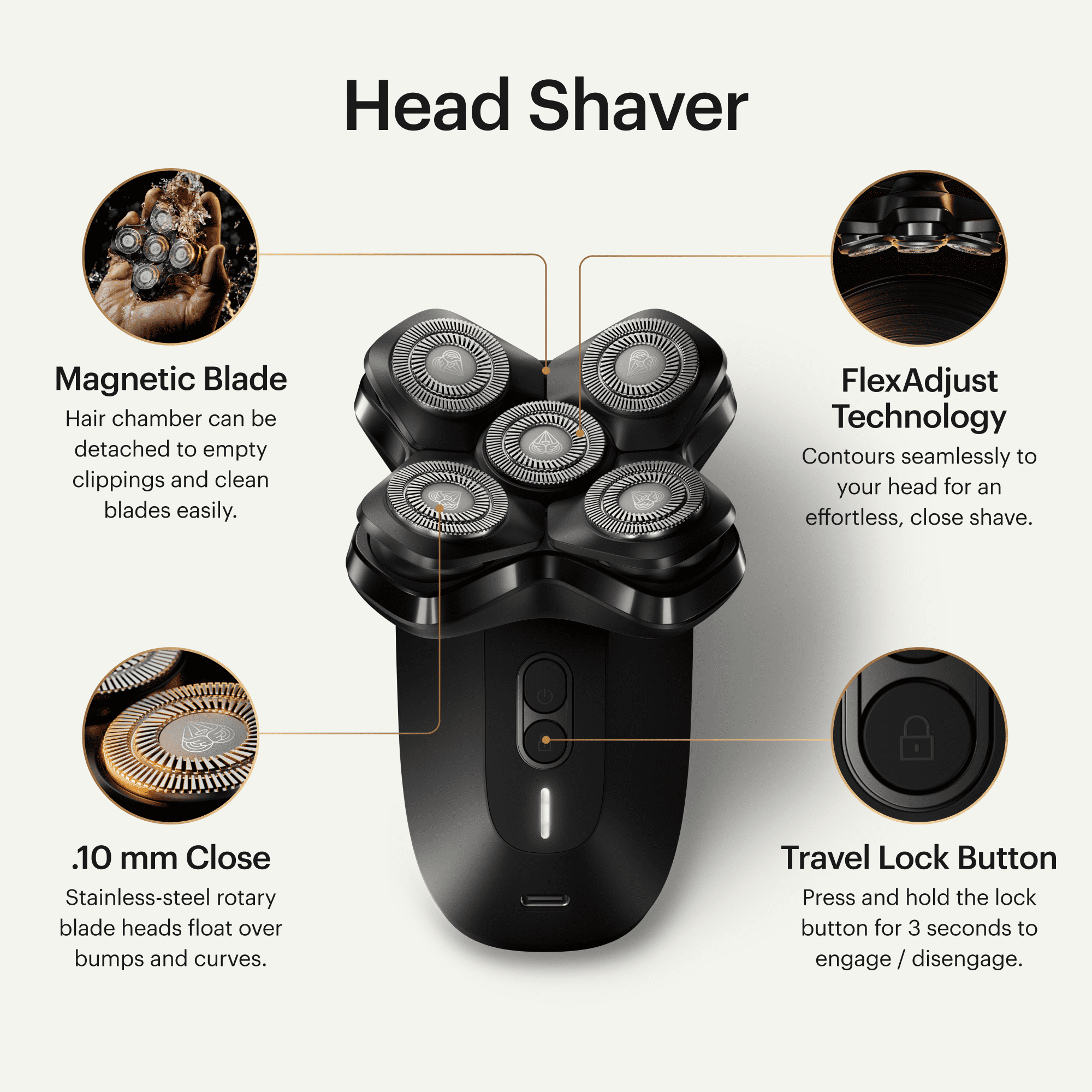 THE DOME SHAVER™ PRO: This is a tool for the self-assured, those who know they look best bald and plan to keep it that way. Enjoy uninterrupted grooming sessions with The Dome Shaver’s long-lasting rechargeable battery. With USB-C and wireless charging compatibility, keeping your shaver powered up is simple and efficient. COMFORTABLE GLIDE: Five stainless-steel SkinSafe® rotary blade heads float over bumps and curves providing a .10 mm smooth shave. With FlexAdjust technology, each blade stays in close contact with the scalp. *SkinSafe® Technology does not guarantee cut protection. VERSATILE DESIGN: An ergonomic handheld design and curved blade pad allow you to comfortably navigate different types of head curvature with ease. The magnetic blade pad and hair chamber can be detached to empty clippings and clean blades easily. TRAVEL LOCK: For secure portability while traveling, we’ve included a travel lock feature. Press and hold the lock button for 5 seconds to engage / disengage. HOW TO USE: Hold The Dome Shaver™ PRO by the handle or palm the blade pad with your hand. Gently glide the shaver across your head making both straight and circular movements.