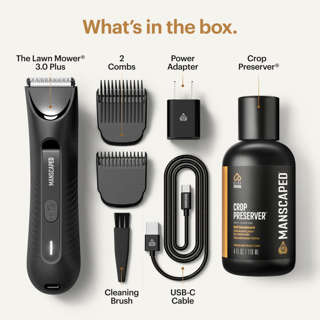 The new Lawn Mower® 3.0 Plus Precision Pack includes is our upgraded version of The Lawn Mower® 3.0 men’s groin & body hair trimmer and 4oz. bottle of Crop Preserver® ball deodorant. The Lawn Mower® 3.0 Plus is the ultimate grooming tool designed for precision, performance, and unparalleled comfort. Unleash your confidence with this upgraded trimmer. Crop Preserver® is our uniquely formulated, all-in-one deodorant and moisturizer designed specifically for below-the-waist and highly active areas. Anti-chafing lotion features ingredients that help preserve the skin’s essential barrier and maintain all-day freshness. Condition: New ; Battery Size: 600mAh